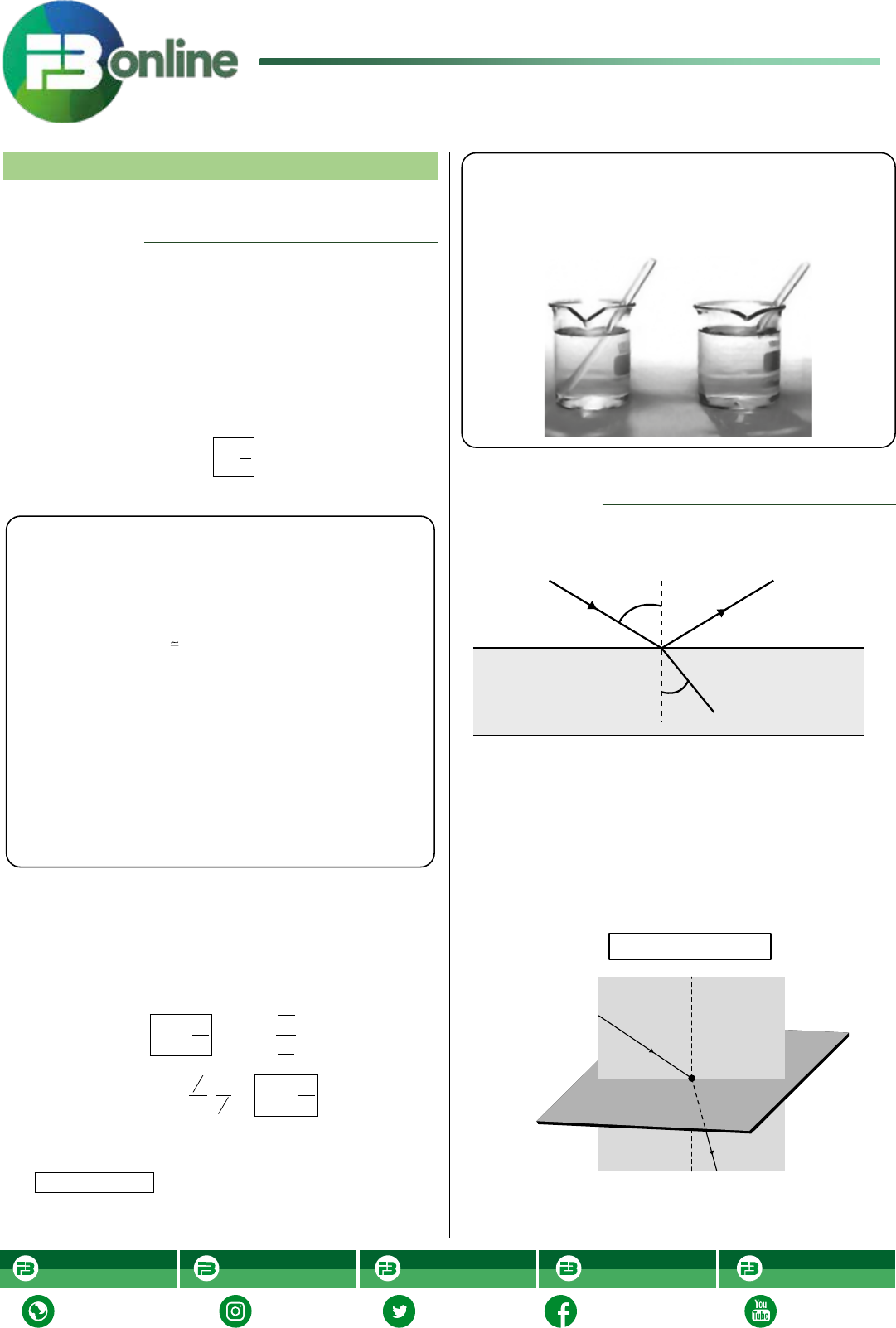 Aulas 20: Refração luminosa e Reflexão total Refração Chama-se refração a mudança no meio de propagação da luz, acompanhada da variação na sua velocidade de propagação. Densidade óptica ou índice de refração absoluta (n) O índice de refração absoluto n de um meio, para determinada luz monocromática, é a razão entre a velocidade da luz no vácuo (c) e a velocidade da luz no meio material em questão (v): n c V = Observações: • O índice de refração (n) é uma grandeza adimensional (sem unidade). • Para o vácuo, n = 1. • Para o ar, adota-se V c = 3 ⋅ 108 m/s, logo n ar ≈ 1. • O valor de n indica quantas vezes a velocidade da luz no vácuo é maior que a velocidade da luz num meio qualquer. • O valor de n não depende apenas do meio, mas da frequência da luz que se propaga. Quanto maior a frequência, maior será a refringência (valor do índice de refração). • O índice de refração de um meio também depende da pressão, da temperatura e da densidade. O índice de refração aumenta com o crescimento da densidade. ÍNDICE DE REFRAÇÃO RELATIVO Define-se índice de refração relativo de um meio A, em relação a um meio B, como a relação: n n n n c V c V n c V V c n V V A B A B A B A B A B A B A B B A , , , , = ⇒ = ⇒ = ⋅ ⇒ = Observe que se: n n V VA B A B> ⇒ < Observação: Quando dois meios apresentam a mesma refringência, ou seja, o mesmo índice de refração, um é invisível em relação ao outro. Dizemos que entre esses dois meios existe continuidade óptica. Água Tetracloreto de carbono Leis da Refração Um raio de luz, proveniente do meio 1, incide na superfície de separação dos meios, 1 e 2 e sofre refração. Raio incidente Meio 1 Meio 2 Raio refletido Raio refratado N i R Sejam: • i; o ângulo de incidência; • R; o ângulo de refração; • n 1 e n 2 são, respectivamente, os índices de refração absolutos para os meios 1 e 2, para uma determinada luz monocromática; • N; a normal à superfície, no ponto de incidência da luz. 1ª Lei da refração N RI P RR RI, RR e N são coplanares O raio incidente, o raio refratado e a reta normal estão no mesmo plano. fariasbrito.com.br @ fariasbrito canalfariasbrito@ fariasbrito colegiofariasbrito NÚCLEO ALDEOTA (85) 3486.9000 NÚCLEO CENTRAL (85) 3464.7788 (85) 3064.2850 NÚCLEO SUL (85) 3260.6164 NÚCLEO EUSÉBIO (88) 3677.8000 NÚCLEO SOBRAL Física ii ProFessor andrew aquino 2ª Lei da refração: “Lei de Snell – Descartes” n sen i n sen R1 2⋅ = ⋅ i n1 n2 R Para cada par de meios e cada luz monocromática que se refrata é constante o produto do seno do ângulo que o raio forma com a normal e o índice de refração do meio em que o raio se encontra. Observações: • Se ocorrer incidência normal (i = 0º) não haverá desvio, independentemente da refrigência dos meios. n n Se i RA ≠ → = → =2 0 0º º • Se o meio 2 é mais refringente que o meio 1, o raio de luz refratado se aproxima da normal. i N Meio 1 n 1 <n 2 ⇒ I > R Meio 2 R • Se o meio 2 é menos refringente que o meio 1, se ocorrer a refração, o raio de luz refratado se afasta da normal. N R Meio 1 i n 1 > n 2 ⇒ 1 < R Meio 2 ÂNGULO LIMITE E REFLEXÃO TOTALÂNGULO LIMITE E REFLEXÃO TOTAL Considere um raio luminoso monocromático propagando-se de um meio mais refringente (A) para um meio menos refringente (B). Sabemos que se a incidência for oblíqua o respectivo raio refratado deverá se afastar da normal em relação à direção do raio incidente. Quando aumentamos gradativamente o valor do ângulo de incidência, chegaremos a um valor em que a refração será rasante (r = 90º). Nesse caso, o ângulo de incidência assumiu o valor máximo possível para que houvesse refração. Chamaremos, então, nessas condições o ângulo de incidência de ângulo limite. Se aumentarmos mais ainda o valor do ângulo de incidência, a luz sofrerá reflexão total (ou interna). r = 0º i = 0º r i r i r = 90° i Reflexão total L = ângulo limite de incidência i > L r = 0º i = 0º r i r i r = 90° i Reflexão total L = ângulo limite de incidência i > L Sendo sen L n n menor maior = Para que ocorra reflexão total à luz: • deve estar propagando do meio mais refringente para o meio menos refringente. • deve incidir com um ângulo maior que ângulo limite. 2 Física ii Exercícios de Fixação 01. O aquário da figura a seguir apresenta bordas bem espessas de um material cujo índice de refração é igual a 3. Um observador curioso aponta uma lanterna de forma que seu feixe de luz forme um ângulo de incidência de 60º, atravessando a borda do aquário e percorrendo a trajetória AB. Em seguida, o feixe de luz passa para a região que contém o líquido, sem sofrer desvio, seguindo a trajetória BC. Considere o índice de refração do ar igual a 1,0. O feixe de luz emergirá do líquido para o ar no ponto C? Ar A Ar 60º B C Líquido Bordas do aquário Reta Normal Lanterna A) Sim, e o seno do ângulo refratado será 3 3 . B) Sim, e o seno do ângulo refratado será 3 2 . C) Não, e o seno do ângulo limite será 3 2 . D) Não, pois o sono do ângulo refratado é menor que o seno do ângulo limite. E) Não, pois o seno do ângulo refratado é maior que o seno do ângulo limite. 02. (Efomm) Uma pequena lâmpada está colocada no fundo de uma piscina cheia de um determinado líquido com profundidade igual a 2 m. Apesar de a lâmpada emitir luz em todas as direções, um observador situado fora da piscina verifica que a superfície do líquido não está toda iluminada, mas apenas uma região circular. Sabe-se que o índice de refração desse líquido é igual a 2. O raio da região circular iluminada da superfície da piscina é então A) 0,75 m B) 1,0 m C) 1,03 m D) 1,13 m E) 1,15 m 03. (Efomm) Um mergulhador utiliza uma lanterna, apontando o feixe luminoso de dentro d’agua para a superfície. Outro mergulhador observa o feixe luminoso refletido como na figura. θ Da