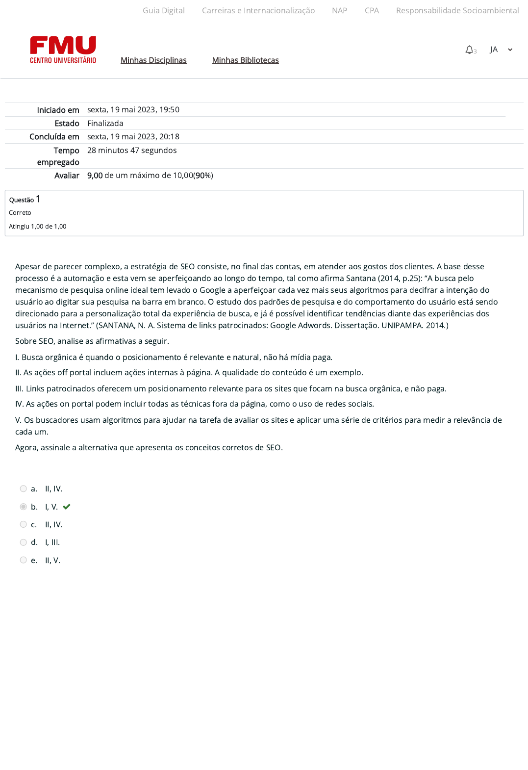 19/05/2023, 20:19 Atividade 3 (A3): Revisão da tentativa https://ambienteacademico.com.br/mod/quiz/review.php?attempt=2263029&cmid=789777 1/8 Iniciado em sexta, 19 mai 2023, 19:50 Estado Finalizada Concluída em sexta, 19 mai 2023, 20:18 Tempo empregado 28 minutos 47 segundos Avaliar 9,00 de um máximo de 10,00(90%) Questão 1 Correto Atingiu 1,00 de 1,00 Apesar de parecer complexo, a estratégia de SEO consiste, no �nal das contas, em atender aos gostos dos clientes. A base desse processo é a automação e esta vem se aperfeiçoando ao longo do tempo, tal como a�rma Santana (2014, p.25): “A busca pelo mecanismo de pesquisa online ideal tem levado o Google a aperfeiçoar cada vez mais seus algoritmos para decifrar a intenção do usuário ao digitar sua pesquisa na barra em branco. O estudo dos padrões de pesquisa e do comportamento do usuário está sendo direcionado para a personalização total da experiência de busca, e já é possível identi�car tendências diante das experiências dos usuários na Internet.” (SANTANA, N. A. Sistema de links patrocinados: Google Adwords. Dissertação. UNIPAMPA. 2014.) Sobre SEO, analise as a�rmativas a seguir. I. Busca orgânica é quando o posicionamento é relevante e natural, não há mídia paga. II. As ações o� portal incluem ações internas à página. A qualidade do conteúdo é um exemplo. III. Links patrocinados oferecem um posicionamento relevante para os sites que focam na busca orgânica, e não paga. IV. As ações on portal podem incluir todas as técnicas fora da página, como o uso de redes sociais. V. Os buscadores usam algoritmos para ajudar na tarefa de avaliar os sites e aplicar uma série de critérios para medir a relevância de cada um. Agora, assinale a alternativa que apresenta os conceitos corretos de SEO. a. II, IV. b. I, V. c. II, IV. d. I, III. e. II, V. Guia Digital Carreiras e Internacionalização NAP CPA Responsabilidade Socioambiental Minhas Disciplinas Minhas Bibliotecas 3 JA https://codely-fmu-content.s3.amazonaws.com/Moodle/GuiaDigital/Guia+digital/index.html https://carreiras.fmu.br/ https://codely-fmu-content.s3.amazonaws.com/Moodle/NAP/inicial/nap/fmu/index.html https://codely-fmu-content.s3.amazonaws.com/Moodle/CPA/landing_CPA/index.html https://portal.fmu.br/sustentabilidade https://ambienteacademico.com.br/ https://ambienteacademico.com.br/ https://ambienteacademico.com.br/course/view.php?id=236 19/05/2023, 20:19 Atividade 3 (A3): Revisão da tentativa https://ambienteacademico.com.br/mod/quiz/review.php?attempt=2263029&cmid=789777 2/8 Questão 2 Correto Atingiu 1,00 de 1,00 Quase como um espião, as ferramentas de marketing digital e a tecnologia empreendida foram permitindo, ao longo do tempo, que empresas pudessem conhecer cada vez mais os internautas. Utilizando uma série de recursos para identi�car os rastros de cada usuário na web, tornou-se possível traçar um tipo de comportamento e até mesmo, em alguns casos, tentar antecipar o que as pessoas buscam e desejam. Sobre isso, Bruno (2012, p. 687) destaca que: “Ainda que o rastro seja uma virtualidade de toda ação, ele nem sempre se atualiza. Na internet, diferentemente, o rastro acompanha necessariamente toda ação, salvo que medidas para evita-lo sejam tomadas.”. (BRUNO, F. Rastros digitais sob a perspectiva da teoria ator-rede. Revista FAMECOS, Porto Alegre. vol. 19, n. 3, set-dez, 2012, p. 681-704.) Para identi�car os rastros que os usuários deixam na internet, o Google Ads utiliza-se de? a. Cookies. b. Visitas. c. Taxa de conversão. d. Pixel. e. Algoritmos. Guia Digital Carreiras e Internacionalização NAP CPA Responsabilidade Socioambiental Minhas Disciplinas Minhas Bibliotecas 3 JA https://codely-fmu-content.s3.amazonaws.com/Moodle/GuiaDigital/Guia+digital/index.html https://carreiras.fmu.br/ https://codely-fmu-content.s3.amazonaws.com/Moodle/NAP/inicial/nap/fmu/index.html https://codely-fmu-content.s3.amazonaws.com/Moodle/CPA/landing_CPA/index.html https://portal.fmu.br/sustentabilidade https://ambienteacademico.com.br/ https://ambienteacademico.com.br/ https://ambienteacademico.com.br/course/view.php?id=236 19/05/2023, 20:19 Atividade 3 (A3): Revisão da tentativa https://ambienteacademico.com.br/mod/quiz/review.php?attempt=2263029&cmid=789777 3/8 Questão 3 Correto Atingiu 1,00 de 1,00 Inicialmente, os sites partiam de indicadores básicos para medir o acesso e a disponibilidade dos seus conteúdos aos usuários �nais. Como o passar dos tempos, ferramentas analíticas se tornaram mais complexas, proporcionando uma série indicadores mais complexos que ajudam a medir não só acesso como também o engajamento dos usuários. Sobre isso, Okada (2011) destaca que: “A mensuração e o monitoramento contínuo das ações mercadológicas levam ao conhecimento do comportamento do consumidor, não somente nas variáveis como freqüência, recência e valor de compra, mas também nos quesitos engajamento e interação com o produto e/ou marca.”. (OKADA, S. I. Web Analytics: Modelos de métricas de engajamento em mídias emergentes. REMark – Revista Brasileira de Marketing. Resumo. São Paulo, vol. 10, n. 3, set-dez, 2011, p. 107-126.) A seguir, apresentamos as de�nições de dois indicadores básicos para análise de sites. Das opções listadas a seguir, relacione a descrição com os indicadores básicos para análise de sites. 1. É uma proporção calculada entre os visitantes que entraram na web e saíram da mesma sem conferir nenhuma página adicional. 2. Calcula quantas vezes uma determinada página ou conteúdo foi acessado. 3. Indica a taxa de páginas vistas por visitante, logo mede o interesse dos conteúdos. 4. Traz o resultado de pessoas que acessam a um site, sem duplicidades. 5. Dado que permite identi�car a quantidade de cliques em uma página web. ( ) Visitantes únicos ( ) Visitas ( ) Páginas vistas ( ) Taxa de desistência ( ) Média páginas por visita Agora, assinale a alternativ