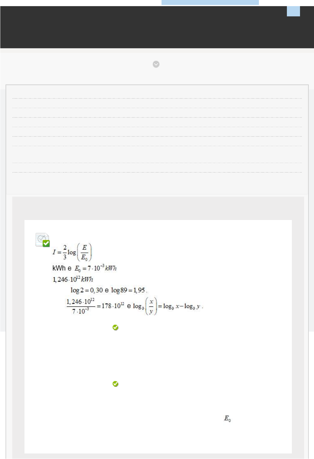 06/05/2023, 11:28 Revisar envio do teste: QUESTIONÁRIO UNIDADE III – ... https://ava.ead.unip.br/webapps/assessment/review/review.jsp?attempt_id=_94214728_1&course_id=_277114_1&content_id=_3293988_1&ret… 1/10 Revisar envio do teste: QUESTIONÁRIO UNIDADE III TÓPICOS DE MATEMÁTICA 7651-75_45301_R_F1_20231 CONTEÚDO Usuário jose.galvao8 @aluno.unip.br Curso TÓPICOS DE MATEMÁTICA Teste QUESTIONÁRIO UNIDADE III Iniciado 06/05/23 10:18 Enviado 06/05/23 11:28 Status Completada Resultado da tentativa 2,5 em 2,5 pontos Tempo decorrido 1 hora, 10 minutos Resultados exibidos Todas as respostas, Respostas enviadas, Respostas corretas, Comentários, Perguntas respondidas incorretamente Pergunta 1 Resposta Selecionada: d. Respostas: a. b. c. d. e. Comentário da resposta: A intensidade I de um terremoto, na escala Richter, pode ser calculada pela fórmula , em que E é a energia liberada pelo terremoto, em . Qual a intensidade de um terremoto que liberou de energia E? Dados: Dica: 9,5. 28,5. 14,25. 12,5. 9,5. 8,25. Alternativa: D Comentário: deve-se substituir os valores de E e dados no enunciado e aplicar a propriedade de logaritmo da divisão, conforme a dica. UNIP EAD BIBLIOTECAS MURAL DO ALUNO TUTORIAISCONTEÚDOS ACADÊMICOS 0,25 em 0,25 pontos http://company.blackboard.com/ https://ava.ead.unip.br/webapps/blackboard/execute/courseMain?course_id=_277114_1 https://ava.ead.unip.br/webapps/blackboard/content/listContent.jsp?course_id=_277114_1&content_id=_3292080_1&mode=reset https://ava.ead.unip.br/webapps/portal/execute/tabs/tabAction?tab_tab_group_id=_10_1 https://ava.ead.unip.br/webapps/portal/execute/tabs/tabAction?tab_tab_group_id=_27_1 https://ava.ead.unip.br/webapps/portal/execute/tabs/tabAction?tab_tab_group_id=_47_1 https://ava.ead.unip.br/webapps/portal/execute/tabs/tabAction?tab_tab_group_id=_29_1 https://ava.ead.unip.br/webapps/portal/execute/tabs/tabAction?tab_tab_group_id=_25_1 https://ava.ead.unip.br/webapps/login/?action=logout 06/05/2023, 11:28 Revisar envio do teste: QUESTIONÁRIO UNIDADE III – ... https://ava.ead.unip.br/webapps/assessment/review/review.jsp?attempt_id=_94214728_1&course_id=_277114_1&content_id=_3293988_1&ret… 2/10 Pergunta 2 Resposta Selecionada: b. Respostas: a. b. c. d. e. Comentário da resposta: A quantidade de uma determinada medicação no organismo se reduz à metade a cada hora a partir do instante da ingestão do medicamento. Para que a medicação tenha a ação esperada, é desejável que se tenha, no mínimo, 31,25 mg de medicação no organismo. Se uma pessoa consumiu 1000 mg da tal medicação às 11h, do dia 15 de março, em que dia e horário ela deve tomar novamente a medicação para obter a ação esperada? Dica: a cada uma hora passada, a quantidade de medicação no organismo é metade da quantidade da hora anterior. às 16h do mesmo dia. às 15h do mesmo dia. às 16h do mesmo dia. às 17h do dia seguinte. às 19h do mesmo dia. às 23h do mesmo dia. Alternativa: B Comentário: considerando que, no instante 0 hora, a quantidade de medicação no organismo é 1000 mg, teremos: - após 1 hora: 500 mg; - após 2 horas: 250 mg; - após 3 horas: 125 mg; - após 4 horas: 62,5 mg; - após 5 horas: 31,25 mg. Pergunta 3 Resposta Selecionada: a. Respostas: a. b. c. d. e. Dados , o valor de é: Dica: 0,70. 0,70. 0,75. 0,78. 0,80. . 0,25 em 0,25 pontos 0,25 em 0,25 pontos 06/05/2023, 11:28 Revisar envio do teste: QUESTIONÁRIO UNIDADE III – ... https://ava.ead.unip.br/webapps/assessment/review/review.jsp?attempt_id=_94214728_1&course_id=_277114_1&content_id=_3293988_1&ret… 3/10 Comentário da resposta: Alternativa: A Comentário: devemos fazer e aplicar a propriedade que o logaritmo da divisão é a subtração dos logaritmos não nos esquecendo de que . Pergunta 4 Resposta Selecionada: d. Respostas: a. b. c. d. e. Comentário da resposta: O número de clientes em um supermercado é dado pela função . Supondo que a lotação máxima é igual ao valor máximo atingido pelo função N(x), de quantas em quantas horas o supermercado atinge sua lotação máxima? Dica: de quantas em quantas horas o supermercado atinge sua lotação máxima equivale a obter o período da função N(x). A cada 6 horas. A cada 1 hora. A cada 3 horas. A cada 5 horas. A cada 6 horas. A cada 8 horas. Alternativa: D Comentário: o período de uma função trigonométrica do tipo , então, para a função dada será . Pergunta 5 Resposta Selecionada: e. Quais os valores mínimo e máximo assumidos pela função ? Dica: lembre-se de que os valores mínimo e máximo assumidos pelo seno são -1 e 1, respectivamente. 3 e 7. 0,25 em 0,25 pontos 0,25 em 0,25 pontos 06/05/2023, 11:28 Revisar envio do teste: QUESTIONÁRIO UNIDADE III – ... https://ava.ead.unip.br/webapps/assessment/review/review.jsp?attempt_id=_94214728_1&course_id=_277114_1&content_id=_3293988_1&ret… 4/10 Respostas: a. b. c. d. e. Comentário da resposta: 2. 3. 5. 3 e 7. Alternativa: E Comentário: o valor mínimo da função ocorrerá quando e o valor mínimo quando . Pergunta 6 Resposta Selecionada: c. Qual dos grá�cos refere-se à função ? Dica: a função exponencial cresce cada vez mais rápido conforme x aumenta. 0,25 em 0,25 pontos 06/05/2023, 11:28 Revisar envio do teste: QUESTIONÁRIO UNIDADE III – ... https://ava.ead.unip.br/webapps/assessment/review/review.jsp?attempt_id=_94214728_1&course_id=_277114_1&content_id=_3293988_1&ret… 5/10 Respostas: a. b. c. 06/05/2023, 11:28 Revisar envio do teste: QUESTIONÁRIO UNIDADE III – ... https://ava.ead.unip.br/webapps/assessment/review/review.jsp?attempt_id=_94214728_1&course_id=_277114_1&content_id=_3293988_1&ret… 6/10 d. e. Comentário da resposta: Alternativa: C Comentário: lembremos que a função é uma função exponencial com base>1, logo, uma função exponencial crescente, o que ocorre apenas na alternativa C. Outra possibilidade de resolução é fazer uma tabela de valores de x contra y, atribuir para x os valores -2, -1, 0,