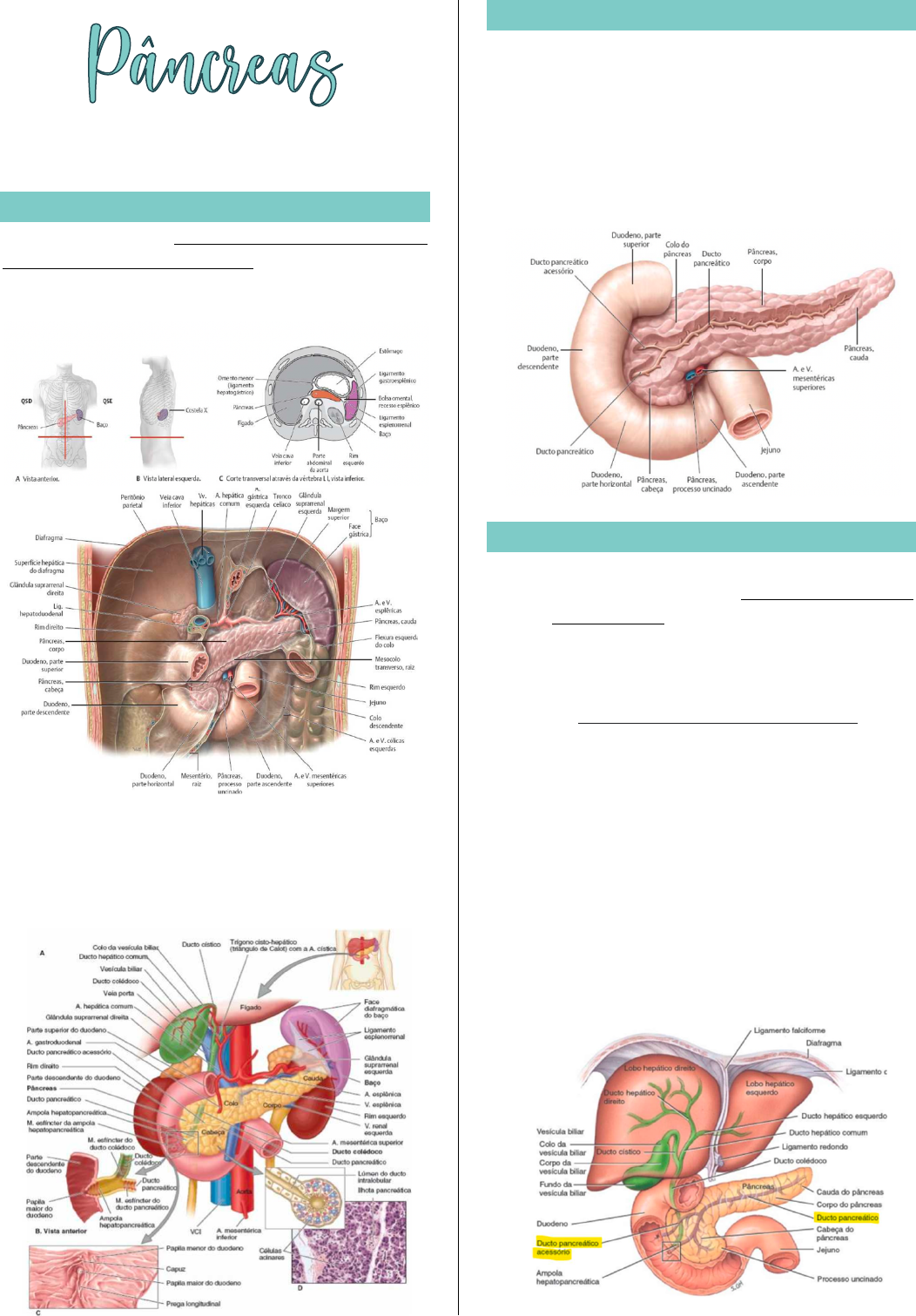 João Manuel – Medicina Nove de Julho ANATOMIA DA GLÂNDULA LOCALIZAÇÃO O pâncreas está no quadrante superior esquerdo e um pedacinho do direito. Já em reação ao peritônio, está atrás – retroperitoneal, consequentemente fica atrás do estômago. No lado direito tem a parte descendente do duodeno, já no lado esquerdo tem o baço. Atrás fica a aorta descendente abdominal e veia cava inferior. Atrás da cauda do pâncreas tem o rim direito. ANATOMIA Pâncreas é dividido em cabeça do pâncreas, colo do pâncreas (se localiza anteriormente dos vasos mesentéricos – artéria e veia mesentérica superior), processo uncinado, corpo do pâncreas (se localiza anteriormente artéria aorta, logo passa atrás dele) e cauda da pâncreas (encontra-se com baço e atrás dele tem o rim esquerdo). FUNÇÃO O pâncreas é uma glândula mista: • Função exócrina: liberação do suco pancreático no duodeno que é rico em enzimas (ácinos produz enzimas inati- vas) e bicarbonato (células do lúmen). • Função endócrina: é a capacidade de produzir insulina e glucagon, dois hormônios que garantem níveis adequados de açúcares no sangue Pelo pâncreas todo passa o ducto pancreático principal, também tem o acessório, esse suco pancreático vai se encontrar com a bili que é armazenada pela vesicular biliar, chega por meio do ducto colédoco e produzida no fígado; o local de encontro é na ampola hepatopancreática. O que permite a passagem para a parte do duodeno descendente é a papila maior, que é controlado pelo esfíncter oddi. João Manuel – Medicina Nove de Julho VASCULARIZAÇÃO Irrigação: Aorta abdominal que levar sangue para essa região, ela se ramificar em: Tronco celíaco, a. mesentérica superior e a. mesentérica inferior. • Tronco celíaco: dar origem a. hepática comum, a. gástrica esquerda e a. esplênica. o A. hepática comum: ramifica em artéria gastroduodenal, dela surgem várias dela, uma das é a artéria pancreáticoduodenal superior, se divide em anterior e posterior; as duas irrigam a cabeça e pouco da cauda. o A. esplênica: se ramificar em 10 ramos pancreáticos, o qual irá irrigar o corpo (a. pancreática magna) e cauda do pâncreas. • A. mesentérica superior: dar origem a várias uma delas é: o Artéria pancreáticoduodenal in- ferior: divide-se em anterior e posterior (o ramo posterior une-se com o ramo APSP) – irriga principalmente a cabeça. Drenagem: Veia esplênica e veia mesentérica superior, formam a veia porta. • As veias pancreáticoduodenais, superior e inferior, drenam para veia mesentérica superior. • As veias pancreáticas menores (corpo e cauda) drenam para veia esplênica. Drenagem linfática: linfonodos que drenam o pâncreas são os pancreáticos esplênicos em direção os linfonodos pilóricos, em direção aos mesentéricos superiores, depois celíacos, assim por diante até chegar no ângulo venoso. Inervação: Sistema nervoso autônomo, o parassimpático, estímulo o digestório, que será igual o pâncreas. • Simpático: Terá formação de plexos com fibras simpáticas – Nervos esplâncni- cos abdominopélvicos. • Parassimpáticos: Nervo vago.