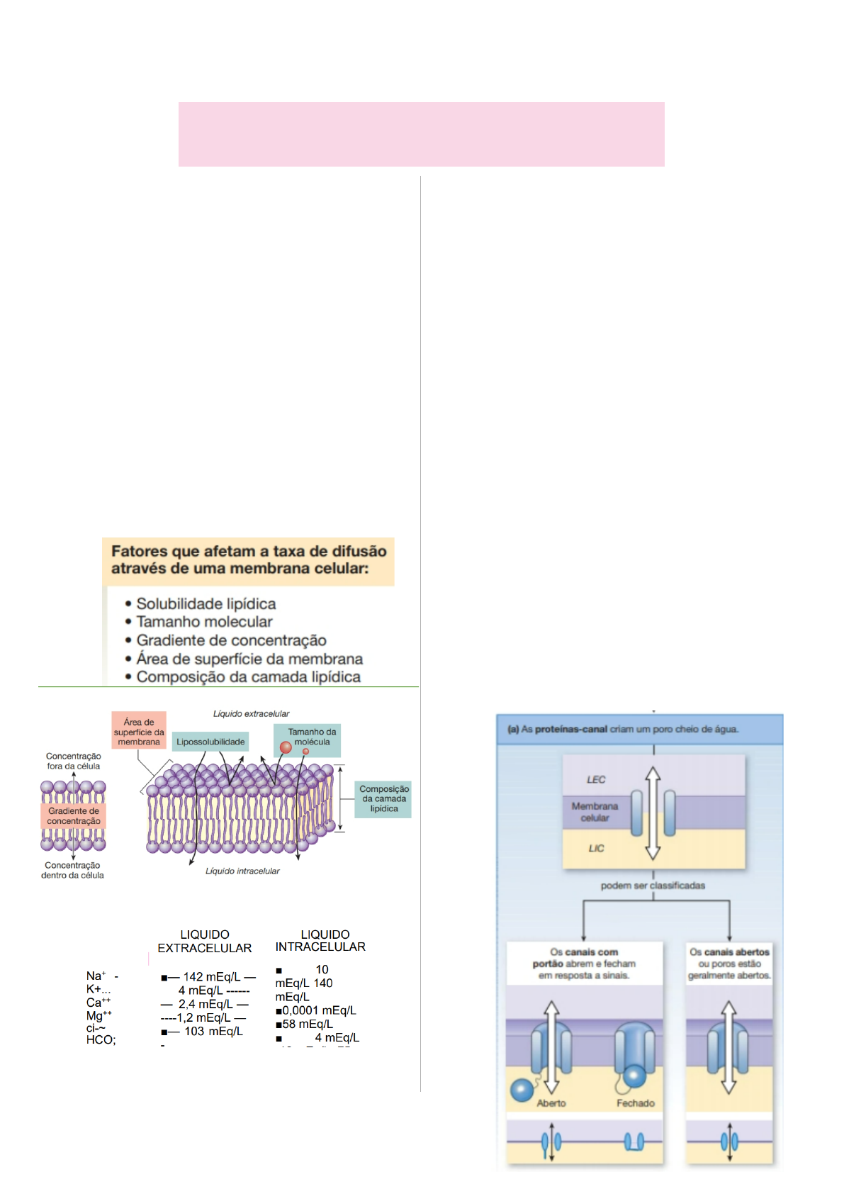 Transporte através da membrana O transporte de substâncias através da membrana considera a eficiência de uma substância para passar através da membrana, que são: 1. Solubilidade da substância na membrana. 2. Carga elétrica da substância. 3. Diferença de gradiente do potencial químico. 4. Permeabilidade da membrana para a substância. ➩ MEMBRANA CELULAR A membrana celular é envolvida por uma bicamada lipídica . A membrana celular contém proteínas junto aos lipídeos atravessando a espessura dessa membrana. Não é miscível nos líquidos intra e extracelular . Substâncias lipossolúveis podem se dispersar através da bicamada lipídica. Proteínas transportadoras ou proteínas de canais ; Possui função de mediar a passagem de substâncias através da membrana. As proteínas de canais e as proteínas transportadoras são seletivas para o transporte de íons e moléculas que atravessam a membrana. ➩ DIFUSÃO SIMPLES A difusão simples ocorre devido ao movimento cinético das moléculas ou íons, isso ocorre através da abertura na membrana ou através de espaços intermoleculares, sem que ocorra qualquer interação com as proteínas transportadoras da membrana. A intensidade que a difusão ocorre é determinada pela quantidade de substâncias disponíveis, pela do movimento cinético, e pelo número e tamanho das aberturas nas membranas pelas quais os íons e moléculas podem se mover. A DIFUSÃO SIMPLES SE DAR ATRAVÉS DA MEMBRANA POR DUAS VIAS: 1. Pelos interstícios da bicamada lipídica, por exemplo, no caso de substâncias que se difundem por serem lipossolúveis. 2. Através dos canais aquosos que penetram toda a membrana, por meio de algumas proteínas transportadoras. DIFUSÃO DE SUBSTÂNCIAS LIPOSSOLÚVEIS A velocidade de difusão através da membrana é diretamente proporcional a sua solubilidade . DIFUSÃO DE MOLÉCULAS INSOLÚVEIS EM LIPÍDIOS PELOS CANAIS PROTEICOS A água passa com facilidade pelos canais das moléculas de proteínas que penetram por toda espessura da membrana, isso ocorre devido a água ser extremamente insolúvel em lipídio. Outras moléculas que são insolúveis em lipídios podem passar pelos canais dos poros das proteínas, assim como a molécula de água, desde que sejam hidrossolúveis e pequenas. quanto maior a molécula de água sua penetração diminui DIFUSÃO ATRAVÉS DOS CANAIS PROTÉICOS Por meio desses canais as substâncias podem se deslocar por difusão simples. Os poros são compostos por proteínas integrais da membrana celular e formam tubos abertos através da membrana. O diâmetro do poro e a sua carga elétrica fornece seletividade que permitem a passagem de somente algumas moléculas. São exemplos desses canais os canais de água ou a aquaporina, que permitem a passagem rápida da água por meio da membrana celular. As proteínas de canais podem ser distinguidas por duas características : 1. São seletivamente permeável a substâncias 2. Os canais são abertos e fechados por comportas que são reguladas por sinais elétricos ou químicos que se ligam à proteína de canal. PERMEABILIDADE SELETIVA DAS PROTEÍNAS DE CANAIS Proteínas de canais são altamente seletivas O transporte de íons ou moléculas específicas ocorre devido às características de um determinado canal . CANAIS DE POTÁSSIO Os canais de potássio permitem a passagem de íons de potássio através da membrana. No topo do poro do canal existem alças que formam um filtro de seletividade estreita. Revestindo o filtro encontram-se oxigênios carbonílicos. Os íons de potássio hidratados quando entram no filtro da seletividade , eles interagem com o oxigênio carbonílicos e perdem a maioria de suas moléculas de água ligadas, permitindo a passagem dos íons potássio desidratados pelo canal. CANAIS DE SÓDIO A superfície interna deste canal tem forte carga negativa. Essas fortes cargas negativas podem puxar os íons sódio desidratados para dentro desses canais, afastando os íons sódio das moléculas de água que os hidratam. Uma vez no canal os íons sódio se dispersam em qualquer direção de acordo com as leis usuais de difusão. COMPORTAS DAS PROTEÍNAS DE CANAIS As comportas das proteínas de canais fornecem meios para controlar a permeabilidade iônica dos canais . Isso ocorre para o controle da seletividade dos íons de potássio e sódio. A variação da abertura e fechamento desses canais podem ser controlados de duas formas: Por variação da voltagem: Nesse caso, suas ligações químicas reagem ao potencial elétrico através da membrana celular. A abertura desses canais de potássio é responsável pelo término do potencial de ação. Por controle químico: As comportas das proteínas de canais dependem da ligação de substância químicas (ligantes) com proteína que abre ou fecha a sua comporta Esse tipo é conhecido como controle químico ou controle por ligante. ➩ DIFUSÃO FACILITADA No caso da difusão facilitada requer a interação com uma proteína transportadora. Essa proteína transportadora ajuda na passagem das moléculas ou íons, através da membrana, por meio de ligações químicas, transportando essas moléculas e íons. DIFERENÇA ENTRE DIFUSÃO SIMPLES E DIFUSÃO FACILITADA A velocidade da difusão simples , através de um canal aberto aumenta proporcionalmente com a substância difusora. Já na difusão facilitada a velocidade da difusão tende a um máximo, denominado de Vmáx . Portanto, podemos dizer que na difusão simples a velocidade continua a aumentar proporcionalmente, enquanto na difusão facilitada a velocidade da difusão não pode aumentar acima do nível do V. O QUE LIMITA A VELOCIDADE DA DIFUSÃO FACILITADA ? O que limita a velocidade da difusão facilitada é a alteração na conformação ou química da proteína transportadora, de forma que o poro se abre para o lado oposto da membrana. POTENCIAL DE NERNST Quando um potencial é aplicado através da membrana, a carga elétrica dos 
