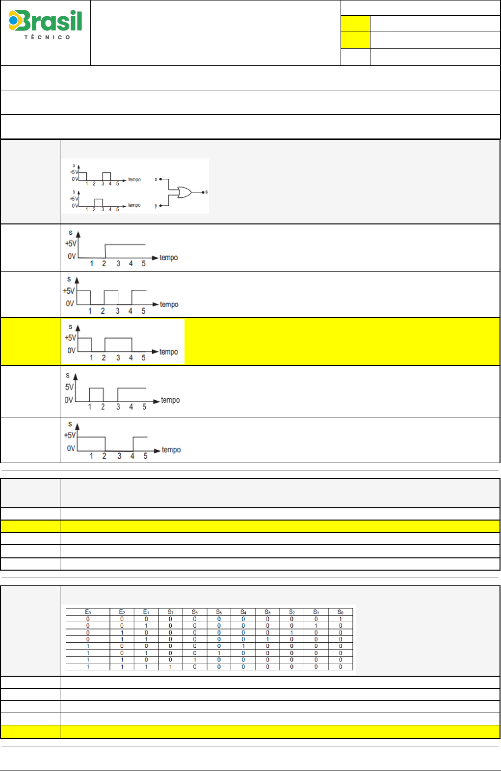 Pincel Atômico - 21/05/2023 12:03:01 1/2 JULIANO SALVADOR BELO PACHECO Exercício Caminho do Conhecimento - Etapa 11 (22706) Atividade finalizada em 21/05/2023 12:02:48 (929581 / 1) LEGENDA Resposta correta na questão # Resposta correta - Questão Anulada X Resposta selecionada pelo Aluno Disciplina: ELETRÔNICA [469950] - Avaliação com 4 questões, com o peso total de 13,00 pontos [capítulos - 113] Turma: Curso Técnico: Automação Industrial - Grupo: BT EAD - JUNHO/2022 - BT EADAUT [68250] Aluno(a): 91324854 - JULIANO SALVADOR BELO PACHECO - Respondeu 3 questões corretas, obtendo um total de 9,75 pontos como nota [349998_146126] Questão 001 Um circuito eletrônico digital, representado na Figura abaixo, através de sua simbologia lógica equivalente, apresenta duas entradas (x e y) e uma saída (s) e trabalha com lógica positiva na qual a tensão mais positiva é atribuída como sendo o estado “1” lógico. Conhecendo−se a forma de onda dos sinais de entrada x e y, mostrados na mesma Figura, qual é a forma de onda do sinal de saída s? X [349998_146132] Questão 002 Em um microprocessador, a unidade de controle tem como função básica: Armazenar o resultado das operações lógicas e aritméticas. Buscar, decodificar e executar as instruções. Armazenar endereço de retorno de subrotina. X Controlar a velocidade de processamento. Controlar o consumo de potência do microprocessador. [349997_146140] Questão 003 Dada a tabela-verdade de um dispositivo lógico abaixo, assinale a alternativa que corresponde ao dispositivo lógico em questão. Considere os bits de entrada E e os bits de Saída S. Display de 7 segmentos. Multiplexador de 8 bits. Codificador de 3 bits. Demultiplexador de 8 bits. X Decodificador de 3 bits Pincel Atômico - 21/05/2023 12:03:01 2/2 [349998_146129] Questão 004 Considere a montagem contendo um decodificador BCD - 7 segmentos e um display. Ao testar as entradas A, B, C e D do decodificador, a com a sequência de zero a 9, o resultado obtido foi: A cauda da não correspondênica entre o número decima pode ser consequência da inversão dos fios que ligam as entradas. X B e C A e B C e D B e D A e D