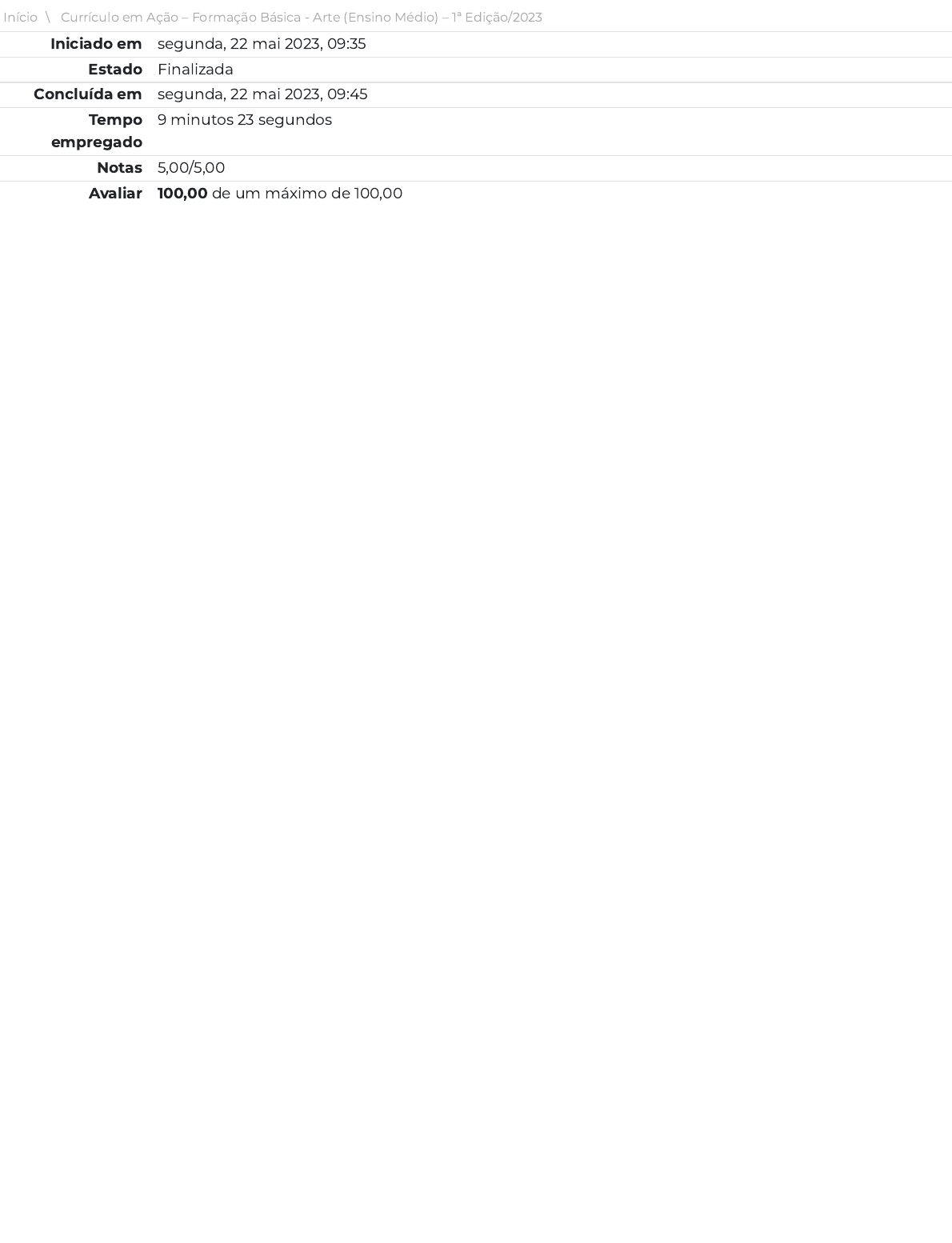 Início \ Currículo em Ação – Formação Básica - Arte (Ensino Médio) – 1ª Edição/2023 Iniciado em segunda, 22 mai 2023, 09:35 Estado Finalizada Concluída em segunda, 22 mai 2023, 09:45 Tempo empregado 9 minutos 23 segundos Notas 5,00/5,00 Avaliar 100,00 de um máximo de 100,00 https://avaefape2.educacao.sp.gov.br/my/ https://avaefape2.educacao.sp.gov.br/course/view.php?id=257 Questão 1 Correto Atingiu 1,00 de 1,00 Leia as a�rmações a seguir e indique verdadeiro (V) ou falso (F). Equilibrar, nas Situações de Aprendizagem, o desenvolvimento ora de competências cognitivas (de pensamento, comunicação, expressão por meio das diferentes linguagens), ora de competências socioemocionais e/ou atitudinais. Considerar, no planejamento de área, as práticas socioculturais envolvendo o uso de diferentes linguagens pelas culturas juvenis, especialmente aquelas nas quais os estudantes da unidade escolar participam ou se manifestam na comunidade onde a unidade escolar está inserida. Organizar o trabalho integrado em área a partir da seleção de conteúdos/objetos comuns entre os componentes, o que permite desenvolver competências socioemocionais. Observar os fundamentos básicos de ensino-aprendizagem que os identi�cam, a saber: a perspectiva de linguagem enunciativo-discursiva e a visão de aprendizagem como construção sociointeracionista. F V F V Observar os fundamentos básicos de ensino-aprendizagem que os identi�cam, a saber: a perspectiva de linguagem enunciativo-discursiva e a visão de aprendizagem como construção sociointeracionista. São fundamentos da área de Linguagens e suas tecnologias as concepções que colocam os sujeitos como interlocutores, inseridos em instâncias sociais, culturais especí�cas, bem como procedimentos e estratégias de aprendizagem considerando-a um processo de (re)construção coletivo. A observância dos fundamentos permite e facilita a articulação com outros conceitos integradores (os campos de atuação social e as competências e as habilidades) para o planejamento de aprendizagens signi�cativas voltadas para o desenvolvimento cognitivo, afetivo, social e comportamental dos estudantes. Organizar o trabalho integrado em área a partir da seleção de conteúdos/objetos comuns entre os componentes, o que permite desenvolver competências socioemocionais. O trabalho em área não deve partir da seleção de conteúdos comuns entre os componentes. Parte de outros conceitos integradores, em articulação: o de competências e habilidades de área e o de campos de atuação social e requer outros processos, procedimentos e estratégias. Considerar, no planejamento de área, as práticas socioculturais envolvendo o uso de diferentes linguagens pelas culturas juvenis, especialmente aquelas nas quais os estudantes da unidade escolar participam ou se manifestam na comunidade onde a unidade escolar está inserida. O planejamento de área deve considerar as práticas socioculturais das culturas juvenis envolvendo o uso de diferentes linguagens das culturas juvenis, para quali�cá-las. Ao considerá-las dentro de campos de atuação social, a contribuição da área para a formação integral dos estudantes é fortalecida. Equilibrar, nas Situações de Aprendizagem, o desenvolvimento ora de competências cognitivas (de pensamento, comunicação, expressão por meio das diferentes linguagens), ora de competências socioemocionais e/ou atitudinais. As Situações de Aprendizagem do Currículo em Ação desenvolvem competências de diferentes naturezas, concomitantemente. Em especial, porque organizam aprendizagens em torno de produções nas quais o uso de diferentes linguagens são requeridas, o que garante a oportunidade para a aprendizagem contextualizada e signi�cativa das mesmas. Questão 2 Correto Atingiu 1,00 de 1,00 Analise as informações acerca das competências, clicando sobre cada uma delas e lendo o texto correspondente. Depois, responda à questão que se segue. Ao reler o conjunto de competências e habilidades especí�cas para a área de Linguagens e considerando a atuação docente integrada, assinale a alternativa ERRADA. a. A articulação da experiência pedagógica na área de Linguagens e suas tecnologias precisa de acompanhamento constante, em diferentes níveis: em sala de aula, no engajamento dos estudantes junto às propostas apresentadas, acompanhado pelo professor; e nos horários coletivos de trabalho pedagógico, nos diálogos que constituem as ATPC. b. As habilidades e as competências comuns da área de Linguagens preveem uma atuação especí�ca do componente curricular de Língua Portuguesa, Arte, Língua Inglesa ou Educação Física, pois são temas que não permitem um campo de ação pedagógico integrado. Alternativa correta! A alternativa a) apresenta uma a�rmação errada, pois aponta para um trabalho individual de um componente curricular especí�co, desconsiderando a atuação como área do saber envolvendo pro�ssionais dos diferentes componentes curriculares. Conforme estudado na unidade 3, o trabalho em áreas do saber previstas no Novo Ensino Médio dão-se em oposição às lógicas individuais e solitárias do fazer docente. c. As práticas de linguagens são consideradas de maneira ampla, de tal modo que a mediação docente fará a curadoria dos recursos necessários frente às especi�cidades da comunidade escolar. d. O trabalho com habilidades oportuniza mediações pedagógicas que dialogam com as práticas de linguagens presentes também nas mídias sociais. COMPETÊNCIA ESPECÍFICA 1 COMPETÊNCIA ESPECÍFICA 2 COMPETÊNCIA ESPECÍFICA 3 COMPETÊNCIA ESPECÍFICA 4 COMPETÊNCIA ESPECÍFICA 5 COMPETÊNCIA ESPECÍFICA 6 COMPETÊNCIA ESPECÍFICA 7 Sua resposta está correta. Questão 3 Correto Atingiu 1,00 de 1,00 Assista ao vídeo gravado na roda de conversa para compartilhamento de boas práticas, promovida pela Secretaria Estadual de São Paulo, na qual a profess