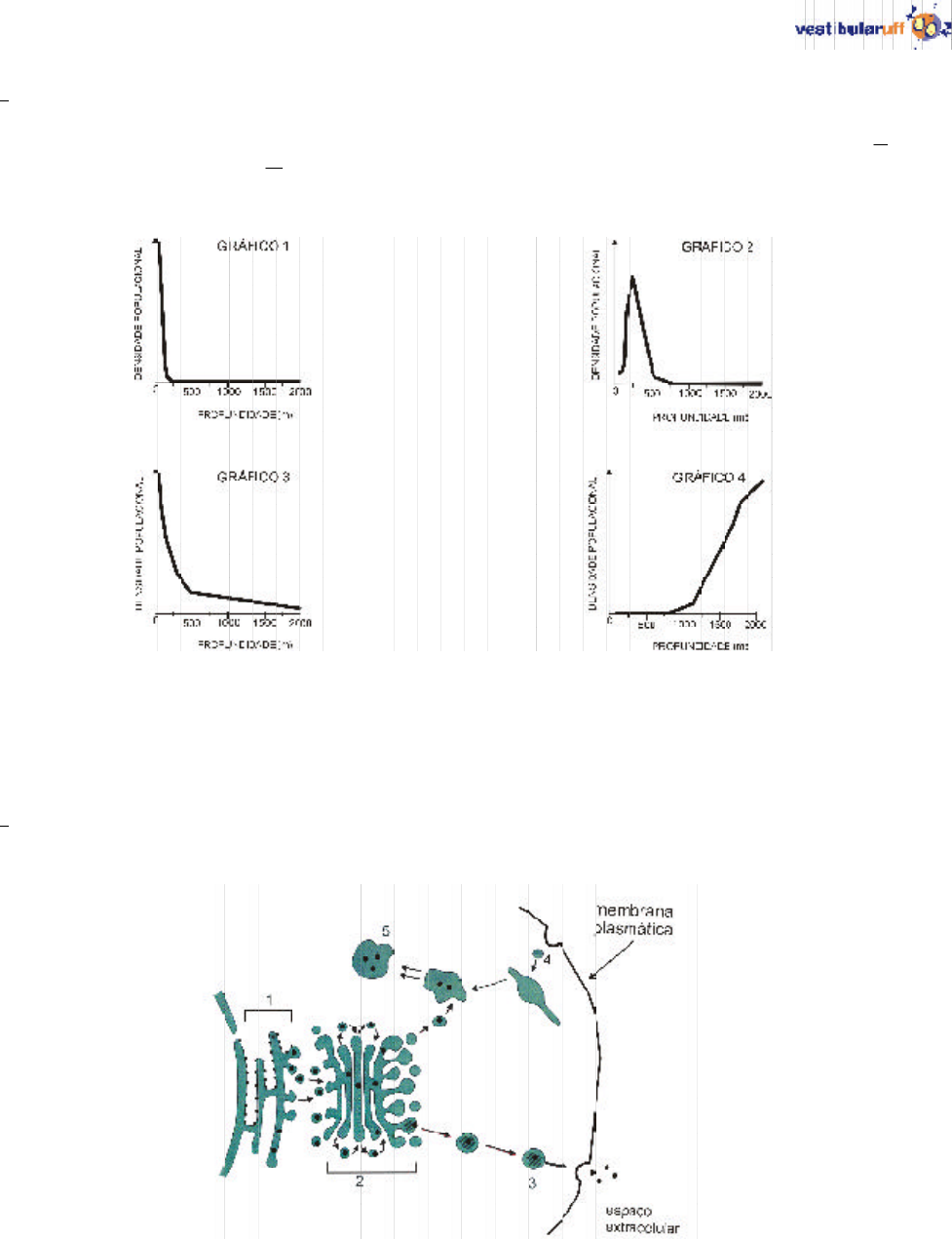 3 Dados obtidos em expedições científicas que fizeram um levantamento da fauna e flora oceânicas desde o litoral até as regiões abissais permitiram estimar a densidade da população de vários seres marinhos, em função da profundidade média em que foram coletados. Alguns dos gráficos seguintes foram elaborados a partir de informações obtidas nessas expedições. Dentre esses gráficos, identifique o mais compatível, respectivamente, com a distribuição populacional de: a) peixes em geral; b) fitoplâncton. Justifique sua resposta. 2a Questão: (1,5 ponto) O esquema abaixo representa a participação de organelas no transporte de proteínas de uma célula eucariótica. a) Nomeie as estruturas indicadas, respectivamente, pelos números 1, 2, 3, 4, e 5, identificando as organelas envolvidas na síntese de enzimas lisossomais. b) Cite uma função de cada uma das estruturas 1, 2 e 5. BIOLOGIA (Grupos: A e B) 1a Questão: (1,5 ponto) 4 3a Questão: (1,0 ponto) As células-tronco humanas podem ser obtidas e colocadas em meios de cultura adequados para se diferenciarem em células formadoras de tecidos especializados. Adaptado de Ciência e Vida, O Globo, 10/07/01 Cientistas acreditam que dentro de alguns anos poderão produzir células suficientes para tratar pacientes com doenças graves no coração, no fígado ou nos pulmões. a) Qual a fase, durante a formação do embrião, em que se pode obter o maior número de células-tronco? Justi- fique sua resposta. b) A partir de células-tronco, que folhetos devem ser produzidos para originar células da musculatura cardíaca e células hepáticas? 4a Questão: (1,5 ponto) Certa experiência realizada em duas etapas consecutivas com uma amostra de algas verdes em um meio de cultivo aquoso está relatada a seguir. 1a ETAPA: A amostra de algas verdes foi, inicialmente, colocada em presença de luz e ausência de CO2. 2a ETAPA: Em determinado instante, apagou-se a luz e, simultaneamente, adicionou-se CO2 marcado radioativa- mente (14CO2) , que foi mantido em concentração constante até o final da experiência. O gráfico abaixo mostra um dos aspectos observados durante essa experiência. Com relação à velocidade de incorporação de 14C à glicose dessas algas, explique seu aumento no início da 2a etapa, bem como, seu posterior decréscimo. BIOLOGIA (Grupos: A e B) 5 (m g / g / di a) I II BIOLOGIA (Grupos: A e B) 5a Questão: (1,0 ponto) Durante o processo de metamorfose, ocorrem marcantes mudanças no girino. No decorrer desse período evolutivo, em que acaba tornando-se capaz de viver em terra, além das diferenças morfológicas, também se alteram os produtos nitrogenados que excreta, conforme indicado no gráfico a seguir. Produtos nitrogenados excretados, a 25 oC, durante os vários estágios de desenvolvimento de girinos de Rana catesbeiana Adaptado de FRIEDEN, Earl, LIPNER, Harry. Endocrinologia Bioquímica dos Vertebrados.Tradução por José Reinaldo Magalhães e Maria Teresa Araújo Silva. São Paulo: Ed. Edgard Blücher Ltda. e Ed. da Universidade de São Paulo, 1975. a) Identifique os produtos nitrogenados representados nas curvas indicadas por I e II. b) Explique por que no decorrer do processo representado no gráfico ocorre mudança no perfil dos produtos nitrogenados excretados. 6a Questão: (1,0 ponto) Três amostras idênticas de células animais foram colocadas, cada uma, respectivamente, nas soluções X, Y e Z cujas concentrações salinas são distintas. A variação do volume celular, acompanhada ao longo de certo tempo, está representada no gráfico abaixo. Classifique, quanto à tonicidade, as soluções X, Y e Z. Justifique sua resposta. 6 7a Questão: (1,5 ponto) Um pesquisador, a fim de estudar características do aparelho digestivo de um porco relacionadas à digestão de amido, coletou amostras constituídas por volumes iguais de secreção do estômago, duodeno e cólon do animal. Cada amostra foi colocada em um tubo. Esses três tubos referidos por X, Y e Z, contendo, também, soluções de amido em igual concentração e volume foram incubados a 37 oC. Removeram-se volumes iguais da mistura de cada tubo, respectivamente, no início da incubação (t = t0), em um segundo momento da incubação (t = t1) e ao final da incubação (t = t2). Nesses três instantes, as misturas retiradas foram coradas com uma solução de iodo que dá cor azul na presença de amido e amarela em sua ausência. O quadro informa a coloração apresentada pelas misturas, após serem coradas, nos três instantes menciona- dos. (* representa a intensidade da cor azul) a) Identifique a porção do tubo digestivo de onde provém a secreção colocada no tubo Z. Justifique sua resposta. b) Determine a cor que seria observada no tubo Z ao final dessa experiência, caso a secreção nele contida fosse aquecida a 100 oC antes do início da incubação. Justifique sua resposta. 8a Questão: (1,0 ponto) Um geneticista, adotando o mesmo critério utilizado para a montagem de cariótipo da espécie humana, montou o cariótipo de certa espécie animal desconhecida, conseguindo formar dez pares de cromossomos, restan- do, além desses, dois cromossomos de tamanhos distintos. Considere o padrão de determinação de sexo, nessa espécie desconhecida, igual ao do humano e determine: a) quantos cromossomos existem, respectivamente, nos óvulos, nos espermatozóides e nas células musculares dessa espécie animal; b) o sexo a que pertence o animal da espécie em questão, justificando sua resposta. BIOLOGIA (Grupos: A e B)
