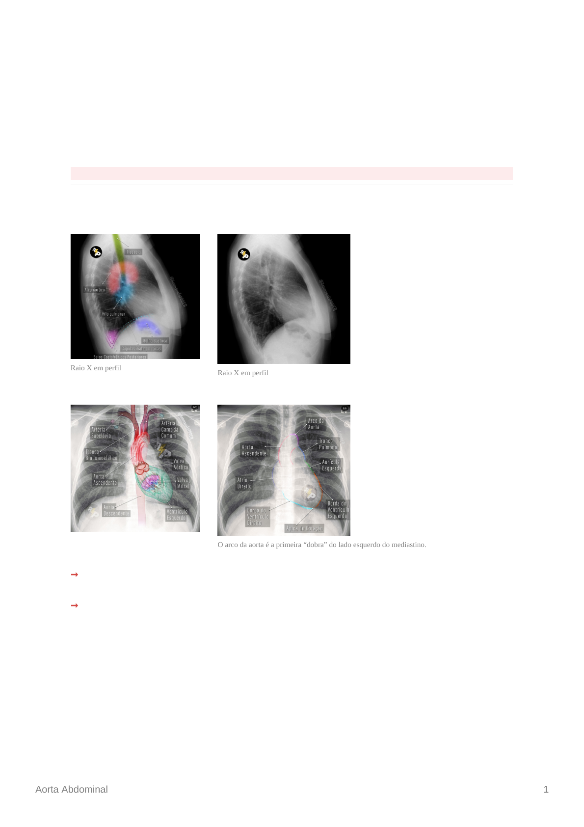 Aorta Abdominal 1 Aorta Abdominal JÚLIA MARIA CEOLIN 3º PERÍODO A avaliação da aorta torácica consiste em uma técnica de diagnóstico por imagem utilizada para examinar a aorta. AVALIAÇÃO DO RAIO X NORMAL A aorta fica meio sobreposta à coluna. É importante avaliar a aorta ascendente, o arco da aorta e a aorta descendente até o diafragma. ➞ Radiografia em PA - incidência postero-anterior: a maior parte da aorta fica sobreposta, não conseguimos delimitar um pedaço dela. Da para ver o contorno do arco aórtico. ➞ Em perfil: faz uma “bengala”, fica entre a coluna vertebral e o coração. Raio X em perfil Raio X em perfil O arco da aorta é a primeira “dobra” do lado esquerdo do mediastino. Aorta Abdominal 2 ⚠ Diâmetros do mediastino: PA - < 6 cm -, AP - < 8cm. HISTOLOGIA DA AORTA As artérias tem 3 camadas: túnica íntima - está em contato com o sangue -, túnica média e adventícia - camada externa. DOENÇAS DA AORTA Entre as principais doenças da aorta, destacam-se os aneurismas e a dissecção. 1. Aneurismas: são dilatações da aorta que evoluem cronicamente, podendo se romper e gerar a ocorrência aguda fatal. Aparecem no raio x como um alargamento do mediastino. Ocorre em 60% na aorta ascendente, 10% no arco aórtico e 40% na aorta descendente. Podem ser saculares ou fusiformes. ➞ Quando a camada íntima rompe, o sangue vai vazar para dentro da camada média e vai empurrar a adventícia para fora, vai ficar expandido. Isso pode estourar ou ser controlado. Pseudoaneurisma - composto pela camada meia e adventícia. 2. Dissecção: consiste na delaminação da parede do vaso agudamente, enfraquecendo sua estrutura e causando um risco de ruptura iminente. Aorta Abdominal 3 Em geral, são doenças associadas aos fatores de risco que causam aterosclerose, tais como: DM, HAS, tabagismo, altos níveis de colesterol e histórico familiar. CLASSIFICAÇÃO DA DISSECÇÃO A dissecção pode ser analisada através da classificação de DeBakey: Tipo I: Ocorre em 70% dos casos. Envolve a aorta ascendente e se estende para o arco e aorta descendente. Tipo II: Ocorre em 5% dos casos. Envolve apenas a aorta ascendente. Tipo III: Ocorre em 25% dos casos. Envolve apenas a aorta descendente. PRINCIPAL PATOLOGIA A HAS faz com que ocorra uma vasoconstrição periférica, dessa forma o coração começa a bombear com mais força. A porção ascendente da aorta é a mais acometida, na camada íntima, pois leva o impacto maior maior do sangue que está saindo do VE. ⇨ A camada íntima é muito sensível e ela pode começar a descamar, vai formar espaços nessa camada e, dentro desses espaços, podem ocorrer ulcerações - começa a ser preenchido por sangue. Nessa erosão pode ocorrer depósito de colesterol que pode calcificar. As calcificações podem ser observadas no raio x se presentes. Aorta Abdominal 4 ACHADOS RADIOLÓGICOS ➞ Alargamento do mediastino - > 8 cm, ao nível do arco aórtico. ➞ Sinal duplo arco aórtico ( quando é possível ver o aneurisma no arco). ➞ Contorno irregular do arco aórtico. ➞ Deslocamento > 1 cm de calcificação ateromatosa parietal. ➞ Desvio das estruturas do mediastino ( traquéia, por exemplo). Alargamento do mediastino Contorno irregular do arco aórtico Aneurisma da aorta descendente Aneurisma.