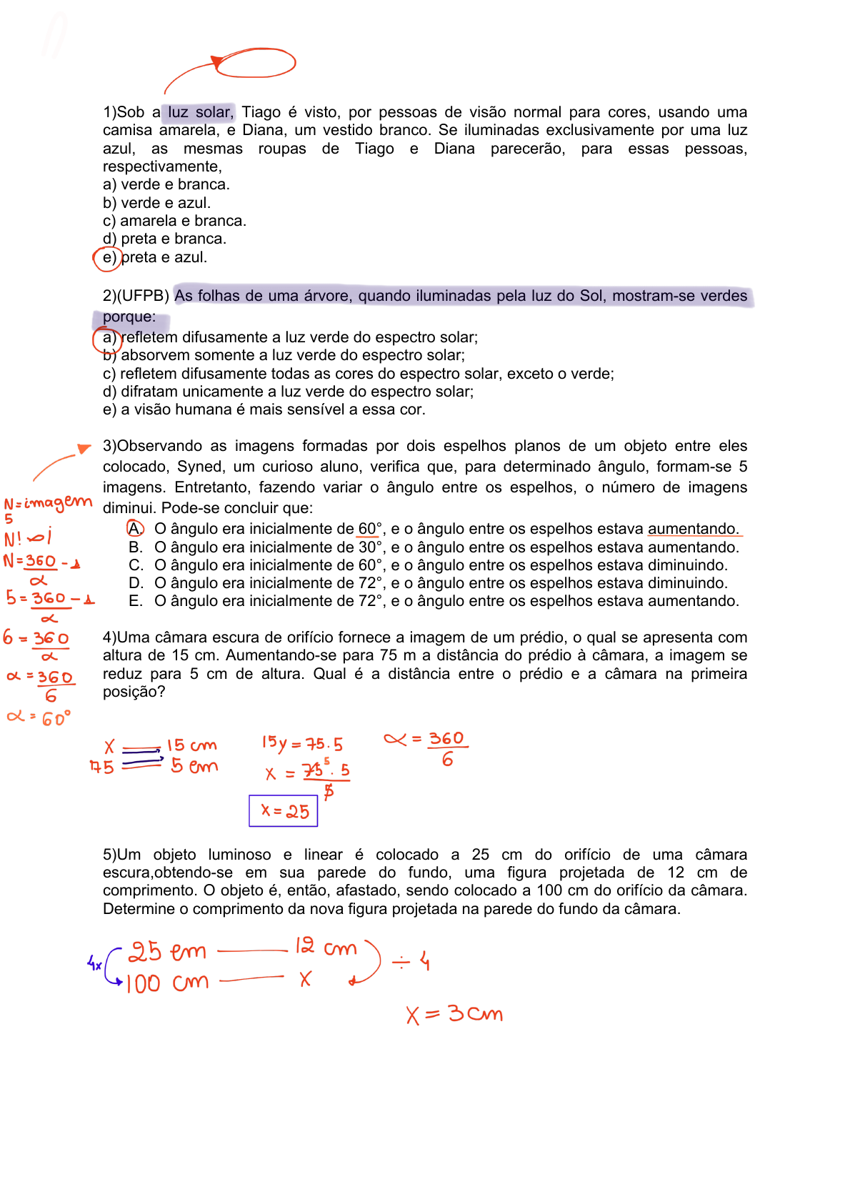 1)Sob a luz solar, Tiago é visto, por pessoas de visão normal para cores, usando uma camisa amarela, e Diana, um vestido branco. Se iluminadas exclusivamente por uma luz azul, as mesmas roupas de Tiago e Diana parecerão, para essas pessoas, respectivamente, a) verde e branca. b) verde e azul. c) amarela e branca. d) preta e branca. e) preta e azul. 2)(UFPB) As folhas de uma árvore, quando iluminadas pela luz do Sol, mostram-se verdes porque: a) refletem difusamente a luz verde do espectro solar; b) absorvem somente a luz verde do espectro solar; c) refletem difusamente todas as cores do espectro solar, exceto o verde; d) difratam unicamente a luz verde do espectro solar; e) a visão humana é mais sensível a essa cor. 3)Observando as imagens formadas por dois espelhos planos de um objeto entre eles colocado, Syned, um curioso aluno, verifica que, para determinado ângulo, formam-se 5 imagens. Entretanto, fazendo variar o ângulo entre os espelhos, o número de imagens diminui. Pode-se concluir que: A. O ângulo era inicialmente de 60°, e o ângulo entre os espelhos estava aumentando. B. O ângulo era inicialmente de 30°, e o ângulo entre os espelhos estava aumentando. C. O ângulo era inicialmente de 60°, e o ângulo entre os espelhos estava diminuindo. D. O ângulo era inicialmente de 72°, e o ângulo entre os espelhos estava diminuindo. E. O ângulo era inicialmente de 72°, e o ângulo entre os espelhos estava aumentando. 4)Uma câmara escura de orifício fornece a imagem de um prédio, o qual se apresenta com altura de 15 cm. Aumentando-se para 75 m a distância do prédio à câmara, a imagem se reduz para 5 cm de altura. Qual é a distância entre o prédio e a câmara na primeira posição? 5)Um objeto luminoso e linear é colocado a 25 cm do orifício de uma câmara escura,obtendo-se em sua parede do fundo, uma figura projetada de 12 cm de comprimento. O objeto é, então, afastado, sendo colocado a 100 cm do orifício da câmara. Determine o comprimento da nova figura projetada na parede do fundo da câmara. Sempre sera Luz branca sempre reflete 6)Em uma barbearia existem dois espelhos planos verticais, paralelos e distantes 3 m um do outro, com a face refletora de um voltada para a face refletora do outro. Um cliente está sentado de frente para um deles, a 1 m de distância dele. Na figura, fora de escala, pode-se notar a infinitude de imagens geradas devido a reflexões sucessivas nesses espelhos. Nessa situação, considerando as distâncias informadas e as características das imagens formadas por espelhos planos, a distância entre a cabeça do cliente, indicada pela seta azul na figura, e a imagem da sua cabeça, indicada pela seta vermelha, é de a) 3 m. b)4 m. c) 7 m. d) 5 m. e) 6 m. 7)Diante do espelho plano E encontram-se o observador O e os pontos A, B,C, D, E, F, G, H e I. Os pontos que serão vistos por reflexão no espelho pelo observador são: a) A, B, H e I; b) C, D, F e G; c) C, D e F; d) nenhum; e) todos. 8)Na figura seguinte, o ponto V representa os olhos de um observador, e A, B, C e D são objetos parados. Nessas condições, o observador verá, por meio do espelho, os objetos a) A e B. b) A e C. c) C e A. d) C e D. e) D e B. 9)Um homem coloca-se a 0,5 m de uma câmara escura (de orifício) de comprimento 30 cm. Verifica-se que o tamanho da imagem formada no interior da câmara é de 1,2 m. Calcule a altura deste homem. 10)Visando minimizar os custos em uma cena de um filme, um diretor de cinema decide usar seus conhecimentos de associação de espelhos planos e com apenas 8 figurantes colocados entre dois espelhos planos verticais fixos, ele consegue fazer uma cena que aparenta ter 48 figurantes. Qual é o ângulo entre os espelhos? 11)Uma foto de um casal foi tirada entre dois espelhos planos verticais que formam um ângulo de 45º entre si. Qual é a quantidade de indivíduos que aparecem nesta foto? 12) Na noite do réveillon de 2013, Lucas estava usando uma camisa com o ano estampado na mesma. Ao visualizá-la através da imagem refletida em um espelho plano, o número do ano em questão observado por Lucas se apresentava da seguinte forma a) b) c) d) 13)A figura a seguir representa um espelho plano, um objeto, 0, sua imagem, I, e cinco observadores em posições distintas, A, B, C, D e E. Entre as posições indicadas, a única da qual o observador poderá ver a imagem I é a posição a) A. b) B. c) C. d) D. e) E. 14)Um observador O observa a imagem de um objeto P refletida num espelho plano horizontal. A figura mostra um feixe de raios luminosos que partem de P. O raio que atinge o observador O é a) PEO b) PDO c) PCO d) PBO e) PAO