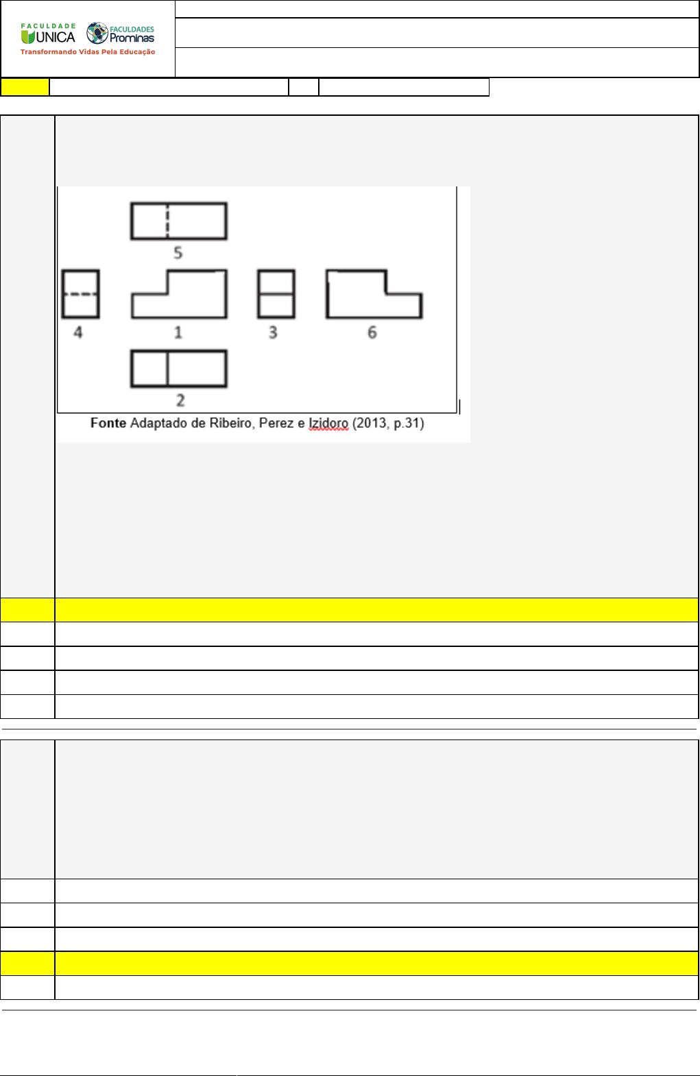 27/09/2022 10:34:00 1/5 REVISÃO DE SIMULADO Nome: FRANCISCO ALMEIDA DA SILVA Disciplina: Desenho Técnico Respostas corretas são marcadas em amarelo X Respostas marcardas por você. Questão 001 O primeiro diedro é mundialmente utilizado, com recomendações pela ABNT no Brasil. Essa representação é a primeira no sentido anti-horário na representação da intersecção entre os planos. Observe a figura: De acordo com a representação do primeiro diedro, enumere as projeções ortogonais com base no desenho. ( ) Vista frontal. ( ) Vista lateral posterior. ( ) Vista superior. ( ) Vista inferior ( ) Vista lateral esquerda. ( ) Vista lateral direita. X A) 1 – 6 – 2 – 5 – 3 – 4. B) 1 – 5 – 2 – 6 – 3 – 4. C) 1 – 6 – 5 – 2 – 3 – 4. D) 1 – 2 – 3 – 5 – 6 – 4. E) 1 – 4 – 2 – 5 – 3 – 6. Questão 002 Uma das representações muito utilizadas para complementar o desenho técnico são as perspectivas. Sobre essa representação leia o texto e assinale a alternativa que complementa as lacunas. Uma perspectiva é a representação _________ de um objeto de _______ dimensões em um plano de __________ dimensões (papel), ela é criada com a finalidade de instruir o observador da representação real do objeto contido no ________________. A) gráfica – três – duas – isométrico. X B) gráfica – duas – três – desenho. C) gráfica – uma – duas – desenho. D) gráfica – três – duas – desenho. E) isométrica – duas – três – desenho. 27/09/2022 10:34:00 2/5 Questão 003 O papel utilizado na produção de um desenho técnico pode ser o sulfite branco, ou papel já fabricado com legenda e margens. A orientação do uso é livre, mas independentemente dessa orientação é obrigatório que a legenda seja exibida no canto direito inferior da folha. A dimensão da legenda pode sofrer alterações mínimas conforme o tamanho de folha, especificamente para os papéis A4, A3 e A2 as dimensões são: A) 173 mm de comprimento e 100 de altura. X B) 178 mm de comprimento e 100 de altura. C) 178 mm de comprimento e 102 de altura. D) 178 mm de comprimento e 115 de altura. E) 175 mm de comprimento e 100 de altura. Questão 004 (Adaptada de ENADE-2008) A representação no terceiro diedro é utilizada por uma minoria de países ao redor do mundo, incluindo Estados Unidos e o Canadá. Nessa representação existe a presença de seis vistas ortogonais, assim como a primeira, entretanto o posicionamento delas é diferente em relação ao primeiro diedro. Observe a figura: Com base na representação em terceiro diedro, preencha a numeração correta. ( ) Vista frontal. ( ) Vista lateral posterior. ( ) Vista superior. ( ) Vista inferior. ( ) Vista lateral esquerda. ( ) Vista lateral direita. X A) 1 – 6 – 2 – 3 – 4 – 5 B) 2 – 1 – 3 – 5 – 6 – 4 C) 6 – 5 – 1 – 2 – 4 – 3 D) 1 – 3 – 2 – 5 – 6 – 4 E) 1 – 6 – 2 – 5 – 3 – 4 Questão 005 As vistas ortogonais são representações de um objeto tridimensional em um plano bidimensional. Sua representação é criada a partir do rebatimento da face vista para o plano 2D. Cada vista é resposta do ponto de vista do observador. Para a padronização do rebatimento de vistas, a geometria descritiva é utilizada. No Brasil e na grande maioria do mundo utiliza-se o primeiro diedro, mas uma pequena minoria trabalha em outro diedro, qual? 27/09/2022 10:34:00 3/5 A) Terceiro diedro. X B) Quinto diedro. C) Segundo diedro. D) Primeiro diedro. E) Quarto diedro. Questão 006 A representação das vistas ortogonais é importante para um desenho devido a quantidade de informações que ela reúne em um único documento. Sabe-se que a vista frontal sempre será a principal, isto é, a vista que mais apresenta informações do objeto. Assumindo a Figura abaixo, assinale qual vista melhor representa sua vista frontal: A) B) C) X D) E) Questão 007 Dentro do sistema de cotagem, as linhas de cota são a sustentação da cota. Ela é paralela ao desenho e perpendicular à linha auxiliar. A linha de cota pode ser apresentada em três estilos diferentes conforme NBR 10126/1998, que é A) uma linha contínua estreita, com setas vazias, setas preenchidas ou um traço e ponto. B) uma linha contínua estreita, com setas vazias, setas preenchidas ou um traço reto. X C) uma linha contínua estreita, com setas vazias, setas preenchidas ou um traço obliquo. D) uma linha contínua estreita, sem setas, setas preenchidas ou um traço obliquo. E) uma linha contínua estreita, com setas vazias, asterisco ou um traço obliquo. 27/09/2022 10:34:00 4/5 Questão 008 Croqui é um termo de origem francesa que traduzido para o português é o mesmo que esboço. Esses esboços representam os objetos de maneira rápida, sendo o estágio inicial de um desenho técnico. É feito de forma manual, não é obrigatório, mas agrega valor ao projeto final. Tendo como base o texto acima, assinale a opção que contenha uma representação por croqui: A) B) X C) 27/09/2022 10:34:00 5/5 D) E)