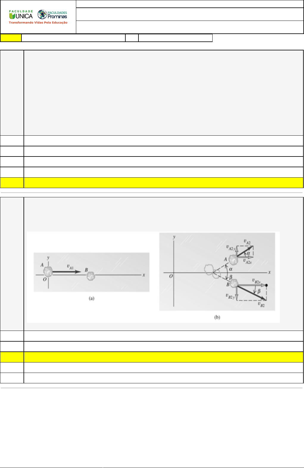 18/04/2022 11:53:03 1/4 REVISÃO DE SIMULADO Nome: FRANCISCO ALMEIDA DA SILVA Disciplina: Física I Respostas corretas são marcadas em amarelo X Respostas marcardas por você. Questão 001 Uma bola de borracha, m = 200 g, é arremessada contra com velocidade de 72 km/h após o impacto a bola retorna com a mesma velocidade em módulo. Com base nesses dados, avalie as afirmações abaixo: I. A colisão pode ser classificada como completamente inelástica. II. O impulso recebido pela bola foi de 8 N.s. III. Após o impacto a velocidade da bola permaneceu inalterada. IV. Se o tempo de contato bola-parede fosse de 0,1 s poderíamos afirmar que a força que a parede aplicou na bola foi de 144 N. É correto apenas o que afirma em X A) II e IV. B) I, II e III. C) I e IV. D) III. E) II. Questão 002 Um bloco A de massa 5 kg e velocidade 2,0 m/s colide com um bloco B, m = 3 kg, que está parado . Depois da colisão verifica-se que a velocidade do bloco A,1,0 m/s, é dada por com uma direção que faz um ângulo de 30º com a direção inicial. Qual é a velocidade final do bloco B ? A) 5,12 m/s X B) 1,04 m/s C) 2,06 m/s D) 3,08 m/s E) 4,10 m/s 18/04/2022 11:53:03 2/4 Questão 003 Considere uma bala de massa m = 8 g, representada na figura por uma seta, disparada com uma velocidade v, cujo valor desejamos medir. Fazendo a bala incindir contra um bloco de madeira de massa M, suspenso por um fio, a bala se engasta no bloco e o conjunto sobe até uma altura h. Suponha que, em uma experiência, na qual m = 8 g e M = 2 kg, tenha-se observado h = 20 cm . Determine a velocidade em que a bala foi disparada. A) 800 m/s X B) 700 m/s C) 400 m/s D) 600 m/s E) 500 m/s Questão 004 Um projétil de massa 15 g incide horizontalmente sobre uma tábua com velocidade igual a 600 m/s e abandona a mesma com a velocidade ainda horizontal e no mesmo sentido, no valor de 400 m/s. O impulso comunicado ao projétil pela tábua tem valor, em módulo, de A) 15,0 N.s X B) 3,0 N.s C) 9,0 N.s D) 6,0 N.s E) 1,5 N.s Questão 005 Uma bola de tênis, de massa 100 g e velocidade 1=20 m/s, é rebatida por um dos jogadores, retomando com uma velocidade 2 de mesmo valor e direção de 1, porém de sentido contrário. Supondo que a força média exercida pela raquete sobre a bola foi de 100N, qual o tempo de contato entre ambas?. X A) 0,03 s B) 0,04 s C) 0,02 s 18/04/2022 11:53:03 3/4 D) 0,05 s E) 0,01 s Questão 006 Uma granada m = 400 g é lançada horizontalmente, para a direita, com velocidade constante de 20 m/s; após explodir a granada se parte em três partes A,B e C, de massas mA = 50 g , mB = 150 g. Sabe-se que o pedaço A é lançado verticalmente para cima com velocidade de 30m/s, o pedaço B é lançado verticalmente para baixo com velocidade B e o pedaço C lançado para a direita com velocidade C os módulos das velocidades B e C ,bem como a são respectivamente: X A) 10 m/s,40 m/s B) 8 m/s,14 m/s C) 12 m/s,32 m/s D) 20 m/s,5 m/s E) 16 m/s,16 m/s Questão 007 Um objeto com 4,88 Kg e velocidade de 314 m/s atinge uma placa de aço a um ângulo de 42º e ricocheteia com a mesma velocidade e mesmo ângulo. Qual é a variação (intensidade e direção) da quantidade de movimento linear do objeto? A) 1.534,32 kg.m/s X B) 1.025,32 kg.m/s C) 2.050,64 kg.m/s D) 946,91 kg.m/s E) 3.531.21 kg.m/s Questão 008 Duas partículas de mesma massa começam a se mover simultaneamente a partir das posições mostradas na figura abaixo, com velocidades constantes e iguais em módulo. Após se deslocarem de uma mesma distância, as duas partículas se chocam elasticamente na posição C. Considerando que após o choque as duas partículas se moverão com velocidade de mesmo módulo, das opções abaixo a única que representa corretamente a direção de movimento das partículas é 18/04/2022 11:53:03 4/4 A) B) X C) D) E)