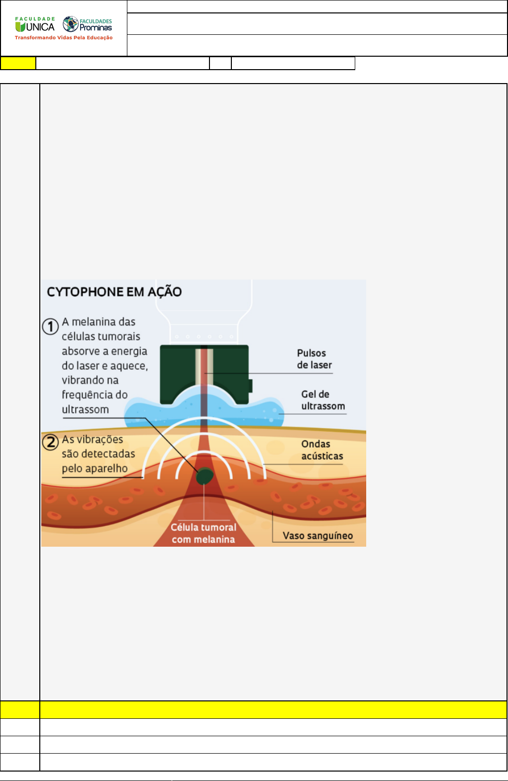15/06/2022 10:59:16 1/4 REVISÃO DE SIMULADO Nome: FRANCISCO ALMEIDA DA SILVA Disciplina: Física II Respostas corretas são marcadas em amarelo X Respostas marcardas por você. Questão 001 Leia o trecho abaixo: Um grupo internacional de pesquisadores desenvolveu um sistema não invasivo que usa laser e ultrassom para, através da pele, detectar células de melanoma no interior de vasos sanguíneos. Nos testes iniciais, o aparelho também destruiu as células em circulação desse tipo de câncer, o mais agressivo dos tumores de pele – células que se desprendem do tumor e viajam no sangue podem espalhar o câncer. Criado pela equipe de Vladimir Zharov, da Universidade do Arkansas para Ciências Médicas, nos Estados Unidos, o equipamento recebeu o nome de Cytophone, por detectar as células por meio de ondas acústicas. Colocado sobre o antebraço, ele emite pulsos de laser que atravessam a pele e penetram nos vasos sanguíneos. A luz é absorvida pela melanina, pigmento abundante nas células de melanoma. Aquecida pelo laser, a melanina vibra e emite ondas acústicas em ultrassom, captadas por um detector. Em um teste com 47 pessoas, o aparelho foi mil vezes mais sensível do que os métodos comerciais de detecção, que exigem a análise de sangue. Fonte: Adaptado de Pesquisa FAPESP. Ano 20, n° 282, ago de 2019. Disponível em https://revistapesquisa.fapesp.br/luz-e-som-para-detectar-celulas-tumorais/. Acesso em 25 fev. 2021. Considerando as informações contidas no trecho citado, avalie a seguintes asserções e a relação proposta entre elas. I. O uso das ondas no dispositivo criado para tratamento do câncer é eficaz. PORQUE II. As ondas sonoras propagam-se apenas em meios materiais e, no trecho citado, pode ser evidenciado por meio da palavra vibração. Além disso, há o uso também de ondas eletromagnéticas como o laser. A respeito destas asserções, assinale a opção correta. A) As asserçoÌ�es I e II saÌ�o proposiçoÌ�es verdadeiras, e a II eÌ� uma justificativa da I. B) A asserção I é uma proposição verdadeira e, a II é uma proposição falsa. X C) As asserções I e II são proposições falsas. D) A asserção I é uma proposição falsa e, a II é uma proposição verdadeira. 15/06/2022 10:59:16 2/4 E) As asserções I e II são proposições verdadeiras, mas a II não é uma justificativa da I. Questão 002 Os modelos científicos são parte do objeto de estudo da Física, pois A) contribuem apenas com textos de divulgação X B) mostram apenas cálculos matemáticos C) auxiliam apenas didaticamente os professores. D) também é objeto da religião e por isso pouco comentado E) contribuem para a construção de um entendimento. Questão 003 Sobre as ondas mecânicas, podemos afirmar que: A) Possui como valor aproximado a constante c. B) São formadas por partículas ultramassivas X C) Podem se propagar no meio material e no vácuo. D) Propagam-se apenas no meio material E) Tem como exemplo a luz do sol. Questão 004 Em razão das medidas de isolamento social adotadas para conter a pandemia, sismógrafos instalados em grandes cidades, como Los Angeles, Barcelona e Milão, registraram uma redução significativa da movimentação do solo. Com mais gente em casa e sobretudo menos veículos nas ruas, os ruídos sísmicos diminuíram. Segundo trabalho de pesquisadores da Universidade de São Paulo (USP) e do Observatório Nacional (ON), do Rio de Janeiro, esse tipo de dado pode ser usado como um indicador adicional do nível de adesão de uma população urbana às medidas de restrição de mobilidade (Geophysical Research Letters, 2 de agosto). Eles compararam os registros da estação sismológica do ON com as informações de uma empresa que monitora a movimentação das pessoas pelo rastreamento de seus celulares, técnica atualmente adotada como padrão para calcular o grau de isolamento social. Constataram que há boa correlação entre os dois tipos de medida: quando sobe o nível de isolamento, caem os ruídos sísmicos, causados essencialmente pelo deslocamento de carros, ônibus e trens. Fonte: Adaptado de Pesquisa FAPESP, edição 295, set 2020. São Paulo, disponível em https://revistapesquisa.fapesp.br/sismografos-para-medir-o-isolamento-social/. Acesso em 25 de fev. 2021. Qual é o agente físico que o sismógrafo destacado na notícia mede? A) Temperatura dos carros. X B) Ondas no chão. C) Umidade do ar. D) Luz do sol. E) Pressão do ar. Questão 005 Uma rádio local transmite sua programação numa frequência de 105 MHz. Considerando o intervalo de tempo de 30 minutos, quantos picos de onda serão emitidos? A) 1,78.10 X B) 1,50.1 C) 1,89.1 D) 1,64.10 E) 1,70.10 15/06/2022 10:59:16 3/4 Questão 006 Uma antena de rádio emite 8 picos de onda em um intervalo de 16 segundos. Qual é sua frequência? A) 0,1 Hz B) 0,5 Hz X C) 0,4 Hz D) 0,3 Hz E) 0,2 Hz Questão 007 Sobre as ondas eletromagnéticas podemos afirmar que: A) Propagam-se apenas em um meio material B) Propagam-se com uma velocidade variável. X C) São formadas por um campo elétrico longitudinal. D) Possuem comprimentos de onda variáveis com a pressão E) São formadas pelos campos elétrico e magnético Questão 008 Observe a imagem abaixo: Fonte: http://wiki.stoa.usp.br/Teced/textos/Grupo_8. Acesso em 25 fev. 2021. De acordo as informações apresentadas na imagem, avalie as afirmativas abaixo: I. O comprimento de onda é caracterizado como a distância entre dois picos consecutivos e é representado pela letra grega λ. II. A frequência de uma onda é dada pela relação entre o período e a quantidade de oscilações da mesma. III. De acordo com o espectro eletromagnético apresentado, quanto maior for o comprimento de onda menor será a frequência da mesma e, consequentemente, menos energia será transportada. É correto o que se afirma em A) II, apenas. B) III, apenas. X C) I e III, apenas. D) I, apenas. 15/06/2022 10:59:16 4/4 E) II e III, apenas.