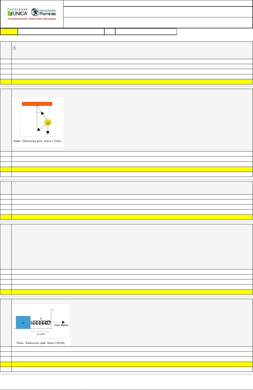 15/06/2022 11:01:42 1/2 REVISÃO DE SIMULADO Nome: FRANCISCO ALMEIDA DA SILVA Disciplina: Física II Respostas corretas são marcadas em amarelo X Respostas marcardas por você. Questão 001 Veja a imagem abaixo: Fonte: Instituto de Física da USP, São Paulo. Disponível em https://labdemo.if.usp.br/pendulo-simples-3/. Acesso em 26 fev. 2021. A imagem representa o chamado pêndulo de Newton. Tal dispositivo é muito utilizado na física para se estudar X A) a pressão hidrostática do mar. B) a pressão atmosférica do ar. C) as ondas eletromagnéticas. D) as superfícies equipotenciais. E) as oscilações harmônicas. Questão 002 No sistema da figura abaixo, m = 1 kg e o comprimento do fio é dada por l = 3 m. Considerando g = 10 e π = 3, o período de oscilação do pêndulo é aproximadamente igual a: A) 3,20 s. X B) 1,20 s. C) 1,78 s. D) 3,29 s. E) 2,54 s. Questão 003 Um carrossel gira com uma frequência angular ω = 3 rad/s. Considerando o valor de π = 3,14, podemos dizer que o período de rotação é aproximadamente igual a: A) 60,20 s. X B) 58,91 s. C) 53,25 s. D) 54,35 s E) 56,52 s. Questão 004 Leia o trecho abaixo: Quando carregamos um recipiente contendo líquido em seu interior percebemos um movimento característico. Assim, o fato de andarmos e, juntamente, carregarmos um recipiente contendo líquido mostra-nos que um segundo tipo de movimento também está acontecendo ali. Do mesmo modo, podemos pensar no movimento de rotação do planeta Terra. Este rotaciona com uma dada velocidade e produz movimentos internos, os quais permanecem devido à inércia. Adaptado de WALKER, J. O grande circo da física. Trad. Jorge Antonio Valadares. Grandiva publicações: Lisboa, 2001. Considerando as informações contidas no trecho citado, avalie a seguintes asserções e a relação proposta entre elas. I. O movimento que observamos no líquido contido no interior do recipiente dá-se na forma de oscilação harmônica. PORQUE II. A energia é transferida para o recipiente de modo contínuo e regular, fazendo com que o mesmo inicie um movimento oscilatório. A respeito destas asserções, assinale a opção correta. X A) As asserções I e II são proposições falsas. B) As asserções I e II são proposições verdadeiras, mas a II não é uma justificativa da I. C) A asserção I é uma proposição falsa e, a II é uma proposição verdadeira. D) A asserção I é uma proposição verdadeira e, a II é uma proposição falsa. E) As asserçoÌ�es I e II saÌ�o proposiçoÌ�es verdadeiras, e a II eÌ� uma justificativa da I. Questão 005 No sistema da figura abaixo, m = 60 kg e a constante elástica da mola é dada por k = 3,4.10 . A velocidade angular de oscilação ω da mola é aproximadamente igual a: A) 0,029 rad/s. X B) 0,920 rad/s C) 0,068 rad/s. D) 0,024 rad/s. E) 0,056 rad/s. 15/06/2022 11:01:42 2/2 Questão 006 Leia o trecho abaixo: Como o universo começou? E o que havia antes do Big Bang? Astrônomos e astrofísicos já se faziam essas perguntas muito antes que se descobrisse que o nosso Universo está em expansão. Mas as respostas não têm sido fáceis de encontrar. Não contando as teorias que descartam totalmente a ideia do Big Bang, o cenário teórico mais aceito para o início do Universo é a inflação cósmica, que prevê que o Universo se expandiu a uma taxa exponencial na primeira fração de segundo após o Big Bang. No entanto, vários cenários alternativos têm sido sugeridos, alguns prevendo um Big Crunch, um Grande Colapso, anterior ao Big Bang, ou Grande Explosão, com um Universo "elástico" que se contrai e se expande continuamente. A dificuldade é encontrar medidas que possam indicar quais desses cenários encontram mais respaldo nas observações astronômicas. Fonte: Site Inovação Tecnológica. Disponível em https://www.inovacaotecnologica.com.br/noticias/noticia.php?artigo=relogios-primordiais-mostrar-como-universo-comecou&id=010130160216#.YDuUjJNKjOQ. Acesso em 26 fev. 2021. De acordo com as informações do trecho citado, avalie as afirmativas abaixo: I. A teoria da origem do universo pode utilizar o modelo do oscilador harmônico, fato este evidenciado pelas palavras “contrai” e “expande”. II. Segundo o trecho, a dificuldade de encontrar medidas para utilizar o modelo do oscilador deve-se ao fato do universo ter uma massa constante. III. De acordo com o trecho citado, explicar o universo por meio de um oscilador faz sentido, pois observações astronômicas contribuem para o modelo de expansão e contração. É correto o que se afirma em A) II, apenas. X B) I, apenas. C) I e III, apenas. D) I e II, apenas. E) III, apenas. Questão 007 Considere o esquema abaixo: Fonte: Instituto de Física da USP, São Paulo. Disponível em https://efisica2.if.usp.br/pluginfile.php/7164/mod_resource/content/1/7-%20O%20pendulo%20simples.pdf. Acesso em 26 fev. 2021. Qual das expressões abaixo representa o período de oscilação do pêndulo simples esquematizado na imagem? A) B) X C) D) E) Questão 008 No sistema da figura abaixo, m = 5 kg e a constante elástica da mola é dada por k = 3,4.10 . A força elástica exercida pela mola sobre o bloco é igual a: A) - 0,056 N B) - 0,530 X C) - 0,045 N D) - 0,300 N E) - 0,068 N