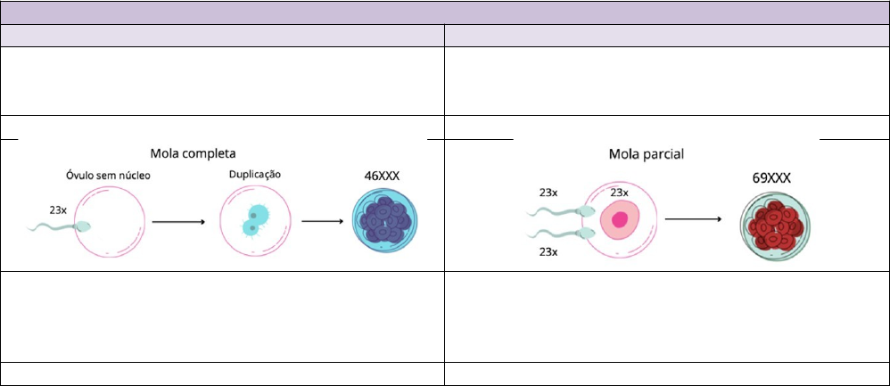 Doença Trofoblástica Gestacional (DTG) Thaynara Silva Definição: Anomalia proliferativa que acomete as células que compõem o tecido trofoblástico placentário (cito e sinciciotrofoblasto) - Cursa com degeneração hidrópica das vilosidades coriônicas acompanhadas de hiperplasia dos elementos trofoblásticos ou anaplasia consequente ao processo neoplásico benigno do trofoblasto. Epidemiologia: Incidência no Brasil: 1 aso de gestação molar a cada 200 a 400 gestações Fatores de risco: · Idade materna > 35-40 anos ou < 20 anos · Intervalo interpartal curto; · SOP; · Abortamentos prévios; · Mola hidatiforme prévia; · Inseminação artificial; · Tabagismo; · Exposição à radiação ionizante; · Uso de contraceptivos orais Classificação: DOENÇA TROFOBLASTICA GESTACIONAL: · Mola hidatiforme: · Completa · Incompleta/parcial · Neoplasia Trofoblástica Gestacional (NTG) · Mola Invasora · Coriocarcinoma · Tumor trofoblásticodo sítio placentário · Tumor trofoblástico epitelióide Mola hidatiforme COMPLETA INCOMPLETA/ PARCIAL O espermatozoide fecunda um ovócito II sem núcleo “vazio”. Posteriormente sofre uma duplicação para completar a carga genética. Ocorre a fecundação do ovócito II por dois espermatozoides, gerando um zigoto triploide Fecundação partenogenética Fecundação dispérmica Diploidia 46 XX (90%) 46 XY (10%)- fecundação de um óvulo vazio por 2 sptz, um X e um Y Triploidia 69 XXX 69 XXY Não forma o embrião, pois contém apenas cromossomos paternos “enxerto paterno” Forma embrião, pois há cromossomos paternos e maternos. β – hCG > 100.000 UI/l β – hCG < 100.000 UI/l Marcador P57KIP2 ausente Marcador P57KIP2 presente Malignização: 15-20% Malignização: 3-5% - Eliminação de vesículas é patognomônico (sangramento vaginal “em suco de ameixa”) - Pode haver abortamento precoce USG: Ausência de concepto Hiperplasia trofolástica difusa Hidropsia vilosa focal Imagem de cachos de uva/ flocos de neve Presença de cistos teca-luteínicos USG: Presença de concepto Muitas vezes feto com malformação Hiperplasia trofolástica difusa Hidropsia vilosa focal Placentomegalia Edema de vilo pronunciado e global Hiperplasia do trofoblasto generalizada Atipia dos trofoblastos Edema de vilo suave e focal Hiperplasia de vilo localizada Suave atipia do trofoblasto Manifestações clínicas - Sangramento vaginal (95%)- afinal é uma das causas de sangramento da 1° metade da gestação - Eliminação de vesículas hidrópicas pela vagina, de entremeio com sangue - Dores abdominais - Náuseas, vômitos (Hiperêmese gravídica) - Hipertireoidismo em 5 % dos casos - Discordância entre IG pela DUM e altura uterina - Aumento exagerado do útero - Molas volumosas podem causae hipertensão gestacional, eclampsia Propedêutica: A FIGO sugere que toda mulher com DTG seja realizado inicialmente: · Anamnese completa · Exame físico minucioso · Fundoscopia · Exames laboratoriais: · Dosagem de β –hCG; · Hemograma · Ureia, Creatinina; · Função hepática; · TSH e T4L; · Tipagem sanguínea e fator Rh · VDRL; · Anti-HIV; · Se HAS: Rotina para hipertrnsão gestacional · Raio-X de tórax · USG com doppler Avaliar grau de anemia, sangramento, estabilidade hemodinâmica Evitar aloimunização: Adm imunoglobulina anti-D a todas as pacientes com mola e com Rh negativo (trofoblasto apresenta antígeno D) + Coombs indireto negativo Tratamento: - Fazer estudo histopatológico (define qual tipo de doença molar) - A técnica de imuno-histoquímica, com marcador P57KIP2 e estudo genético ajudam no diagnóstico diferencial entre mola completa, parcial e aborto hidrópico Esvaziamento uterino: · AMIU; · Curetagem; · Vacuoaspiração Histerectomia indicada quando: · Prole definida · > 40 anos · Sepse · Tumor uterino grande · Hemorragia intensa CONTROLE DO TRATAMENTO Dosagem do β-hCG quantitativo: · Pré-tratamento; · No dia do esvaziamento; · Semanalmente até 3 exames negativos (< 5 mUI/ml); · Mensal até 6 meses. Anticoncepção. Não pode engravidar por até 2 anos em pacientes de baixo risco e 5 anos em pacientes de alto risco Malignização se: · Em 2 meses β-hCG aumentou; · Em 3 meses houve platô; · 6 meses ainda β-hCG + · Metástase Neoplasia Trofoblástica Gestacional (NTG) Critérios: - Manutenção dos valores de β-hCG em 4 ou mais dosagens (1°, 7°, 14° e 21° dia) por pelo menos 3 semanas consecutivas - Aumento do valor do β-hCG em 10% ou mais por pelo menos 2 semanas consecutivas (1°, 7° e 14° dia) - β-hCG detectável por mais de 6 semanas após o esvaziamento molar. - Diagnóstico histológico de Coriocarcinoma · Mola invasora É uma sequela da mola hidatiforme, as vilosidades invadem o miométrio e podem causar hemorragias, perfurações uterinas e infecção Pode emitir metástases para Pulmão e estruturas pélvicas · Coriocarcinoma - Cerca de 50 % dos casos de Coriocarcinoma surgem após uma mola hidatiforme completa - Hemorragia pós-parto tardia que persiste além de 6-8 semanas - Elevado poder de infiltração local - Pode emitir metástases para Pulmão, cérebro, rins, fígado e TGI - Cistos ovarianos bilaterais (teca-luteínicos) · Tumor trofoblástico do sítio placentário - Trofoblasto intermediário - Surge meses a anos após gestação a termo - Sangramento vaginal irregular, amenorreia - Níves baixos de β-hCG - Níveis elevados de hormônio lactogÊnio placentário · Tumor trofoblástico epitelioide Raro. Apresenta sangramento vaginal irregular após gestação ou abortamento Baixos níveis de β- hCG (< 2.500 mUI/ml) Metástase pulmonar em 25% dos casos Caso clínico no Hospital Santa Casa de Rondonópolis- 20/05/2023 LSN, 23 anos, G2 P1 A0 (1 PC- Há 3 anos por escolha materna), IG: 16 sem + 5 dias Toque vaginal: colo posterior, grosso, fechado. Discreto sangramento em dedo de luva