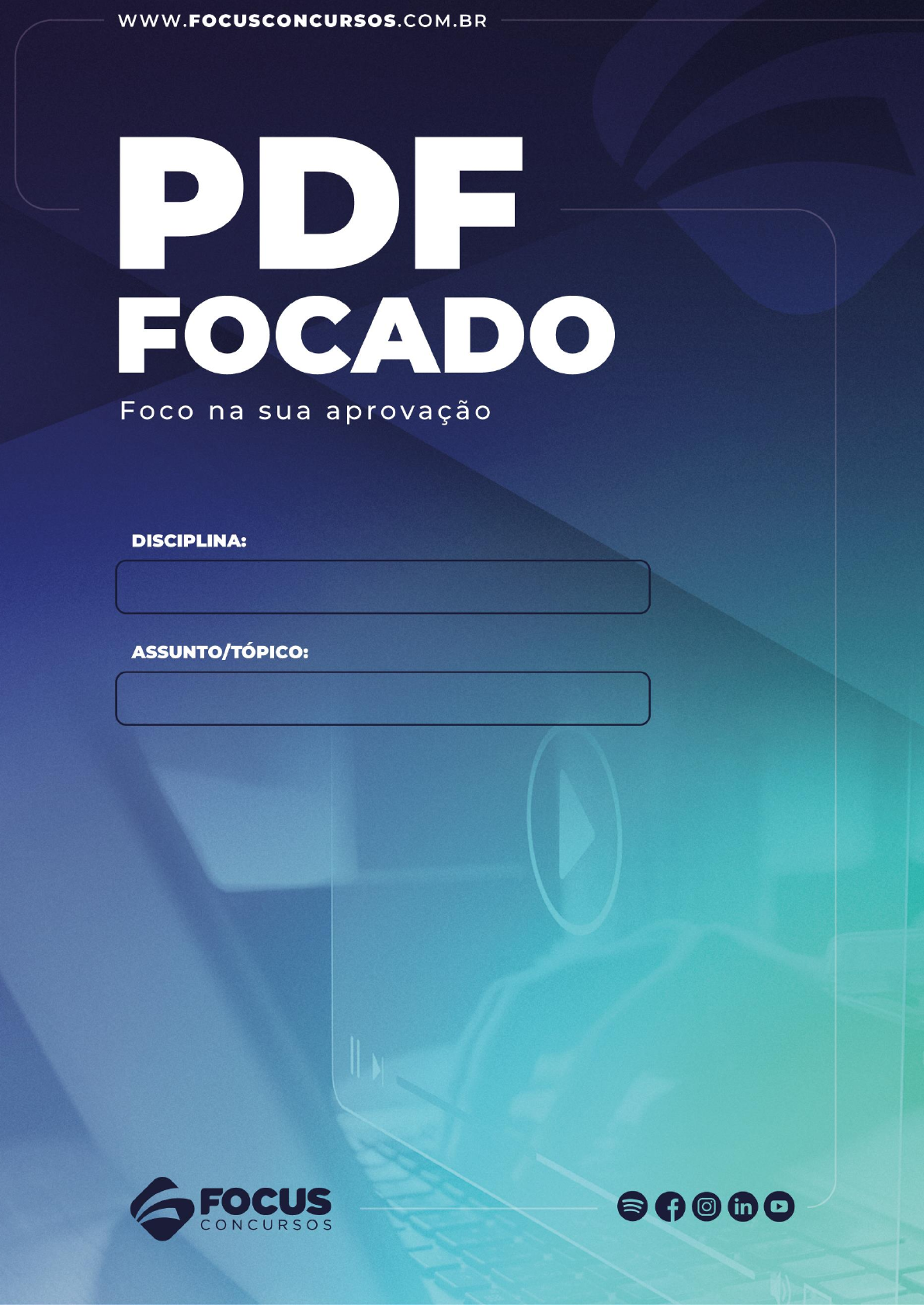 Focus Concursos www.focusconcursos.com.br | 1 | MÉTODO FOCUS DE APROVAÇÃO 5.0 Método Focus de Aprovação 5.0 Focus Concursos www.focusconcursos.com.br | 2 | 1 Apresentação Parabéns, este é o Método Focus de Aprovação 5.0, um guia completo que ensinará você, como estudar do jeito certo e como render mais nos estudos, garantindo assim uma preparação eficiente, para acelerar sua APROVAÇÃO! Sou o Professor Júlio Raizer, Historiador, especialista em Neuropsicopedagogia, Professor há 20 anos e autor do Método Focus de Aprovação. Antes de começar a nossa jornada, preciso que você fique por dentro de algumas “considerações gerais”: 1.1 O Método Focus de Aprovação 5.0 não serve para: Quem acredita que existe uma fórmula mágica de aprovação. Quem acha possível passar sem estudar, ou então para quem busca um caminho simples e sem esforço; Quem tem preguiça de estudar e imagina que a aprovação é resultado de mágica, e acontece de uma hora pra outra, como um coelho que sai da cartola e surpreende os espectadores. Quem está confortável na atual situação de vida; Quem já está satisfeito com o que ganha, e com o emprego que tem 1.2 O Método Focus de Aprovação 5.0 SERVE PARA: Quem realmente quer mudar de vida; Quem quer assumir a autoria da própria história; Quem quer aprender como aprender; Quem quer ser aprovado em concursos públicos (Federais, Estaduais, Municipais). Quem sonha passar em outros concursos e provas, e até agora não conseguiu achar um rumo certo para os estudos. 1.3 Sugestão de materiais Para um melhor aproveitamento das nossas aulas, você precisará de: Um caderno de 10 matérias ou mais (ou folhas de fichário), que será usado para Focus Concursos www.focusconcursos.com.br | 3 | separar as disciplinas que você estudará para sua prova; Canetas de várias cores; Fichas para fichamentos e mapas mentais (pode ser metade de uma folha sulfite); Imprimir o último edital do concurso desejado; Pastas sanfonadas para guardas os mapas mentais (opcional); Agora sim, vamos começar? Focus Concursos www.focusconcursos.com.br | 4 | Conteúdo Programático 1 Apresentação ....................................................................................................................... 2 1.1 O Método Focus de Aprovação 5.0 não serve para: ...................................................................... 2 1.2 O Método Focus de Aprovação 5.0 SERVE PARA:.......................................................................... 2 1.3 Sugestão de materiais ................................................................................................................. 2 2 Aula 01 – Aprendendo a Aprender ........................................................................................ 6 2.1 Pensamentos e ações .................................................................................................................. 6 2.2 Estimule o Aprendizado .............................................................................................................. 7 3 Aula 02: Análise de Edital ..................................................................................................... 9 3.1 A leitura do Edital ....................................................................................................................... 9 3.2 Principais Matérias Cobradas em Concursos .............................................................................. 11 4 Aula 03: Como Organizar os Estudos .................................................................................. 13 4.1 Ciclo do Foco Total .................................................................................................................... 13 4.2 Rotina da Semana: .................................................................................................................... 14 4.3 Sábado: .................................................................................................................................... 14 4.4 Domingo: .................................................................................................................................. 14 5 Aula 04 Plataforma Focus .................................................................................................. 15 5.1 Como Usar a Plataforma Focus .................................................................................................. 15 5.2 Novidades EXCLUSIVAS Focus Concursos ................................................................................... 16 6 Aula 05 – Como Assistir Videoaulas .................................................................................... 17 6.1 Demonstração .......................................................................................................................... 17 Confira o passo a passo. ........................................................................................................................................... 17 7 Aula 06: Como Fazer Resumos ............................................................................................ 20 7.1 Resumo Eficiente ...................................................................................................................... 21 8 Aula 07: Como Fazer Mapas Mentais e Revisão Imediata ................................................... 22 8.1 O que são mapas mentais ......................................................................................................... 22 8.2 Dicas Importantes ..................................................................................................................... 22 8.3 Mapa da Lei .............................................................................................................................. 22 8.4 Revisão Imediata ...................................................................................................................... 22 9 Aula 08