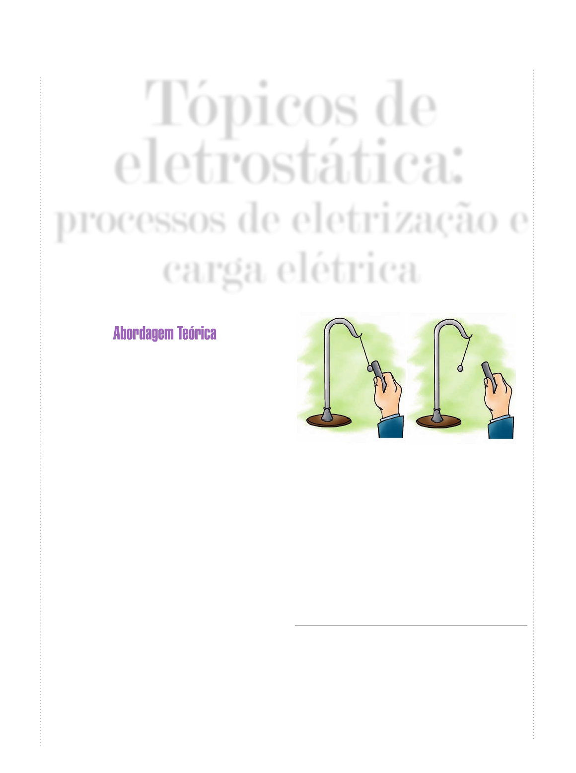 O objetivo deste tópico é constatar a existência das cargas elétricas e reconhecer os fatos fundamen- tais relativos às três partículas básicas que consti- tuem a matéria. Serão mostradas, também, algumas conceituações clássicas, como a dos condutores e isolantes e os processos mais comuns de eletrização dos corpos. As primeiras experiências de eletrização de objetos são creditadas a Thales de Mileto. Consta na história que ele atritou uma resina chamada âmbar (em grego electron) e observou que ela tinha a propriedade de atrair corpos leves. Já no século XVI, William Gilbert, médico da Rainha Elizabeth da Inglaterra, observou que vários outros corpos, atritados convenientemente, tinham também essa propriedade, e difundiu o termo eletrizado, isto é, se comportavam de forma semelhante ao âmbar. Tipos de eletrização Se atritarmos um bastão de vidro com seda e o aproximamos de uma bolinha muito leve como, por exemplo, uma bolinha de isopor, suspensa por um fio de seda (veja a figura em eletroscópios: pêndulo elétrico) notamos que, inicialmente essa bolinha será atraída pelo bastão; se tocar no bastão, observa-se que será repelida. A B A B Em seguida, atritamos um bastão de uma resina como a ebonite (borracha com excesso de enxofre) com seda e notamos que a bolinha que havia sido repelida pelo bastão de vidro passa a ser atraída pelo bastão de ebonite. Novamente, se houver contato entre o bastão e a bolinha, passa a ocorrer repulsão, voltando esta a ser atraída pelo vidro. Podemos evidenciar, com essa experiência, dois tipos de eletricidade: a vítrea, convencional- mente chamada positiva, e a resinosa, chamada negativa. O fenômeno da eletrização Atualmente, esse processo é entendido como a perda ou ganho de partículas subatômicas. Segundo o modelo do átomo conhecido hoje, o núcleo atômico contém partículas de carga positiva, chamadas prótons, e partículas sem carga elétrica, chamadas nêutrons. Orbitando em torno desse nú- Tópicos de eletrostática: processos de eletrização e carga elétrica 1 cleo encontramos partículas muito menores que os prótons, carregadas negativamente e chamadas elé- trons. O átomo no seu estado fundamental é neutro, isto é, o número de elétrons é numericamente igual ao número de prótons e a carga elétrica de um próton, em módulo, é igual à carga de um elétron. Um corpo neutro, portanto, não é um corpo sem carga elétrica, mas um corpo em que o número de cargas negativas é numericamente igual ao número de cargas positivas. Na eletrização, o corpo passa a apresentar um excesso ou uma carência de elétrons: no primeiro caso diz-se que o corpo está negativo e no segundo que está positivo. Condutores e isolantes Dividimos, geralmente, os corpos em dois grupos: corpos que têm grande número de elétrons • livres, chamados condutores; corpos cujos átomos se acham ligados de tal • forma que os elétrons não têm muita mobili- dade, chamados isolantes. Evidentemente, não existe um condutor ideal ou um isolante perfeito. Os isolantes só funcionam como tal até determinado limite. Processos de eletrização A eletrização é um fenômeno de redistribuição de cargas elétricas já existentes nos corpos. Não pode- mos criar ou destruir cargas elétricas, ou seja, existe um Princípio de Conservação de Cargas Elétricas. Os principais processos de eletrização eletros- tática são: por atrito – • (também chamada tribo-eletrici- dade): quando dois corpos neutros se eletri- zam por atrito, ambos ficam eletrizados com cargas de sinais opostos, porém de módulos iguais. Observe abaixo uma lista de algumas substâncias que ficam positivamente carre- gadas quando atritadas por um elemento que as segue e, negativamente, quando atritadas por um elemento que as antecede: pele de coelho algodão vidro madeira mica âmbar lã ebonite pele de gato enxofre seda celuloide • por contato – quando um corpo neutro é colocado em contato com um outro corpo já eletrizado adquire carga elétrica de mesmo sinal que o corpo primitivamente carregado. O módulo das cargas dos corpos dependerá, entre outras coisas, das dimensões desses corpos. A quantidade total de carga se con- serva. por calor – • alguns corpos, como a turmali- na, quando aquecidos, apresentam cargas de sinais opostos em dois pontos de sua superfície. por pressão – • também chamado fenômeno piezo-elétrico, é muito bem observado em cristal de quartzo. Quando o cristal é subme- tido à pressão, apresenta pontos com cargas de sinais opostos. Como exemplo prático temos o dispositivo chamado magic click. por indução – • quando colocamos um corpo neutro próximo a um corpo eletrizado, sem que haja contato entre eles, e, em seguida, ligamos o corpo neutro com a terra, o corpo neutro torna-se eletrizado. O corpo previa- mente eletrizado é chamado de indutor e o que será eletrizado é chamado de induzido. Neste caso, esses corpos terão obrigatoria- mente cargas de sinais contrários. Imaginemos que haja uma esfera S positivamen- te carregada e que aproximemos dela um corpo alon- gado, neutro, sendo A e B as suas extremidades. A extremidade A, que está mais próxima da esfera, apresentará carga negativa e a extremidade B, que está mais distante, apresentará carga positiva (figura1). S + A - C B+ Figura 1 Ligando-se por um fio condutor o corpo alon- gado à Terra, desaparecerá a carga de mesmo sinal que a carga indutora (figura 2). 2 + A - C B Figura 2 Removendo-se primeiro o fio e depois afastando o indutor, observa-se que o corpo alongado fica com as cargas induzidas negativas distribuídas em toda a sua extensão. Distribuição de cargas A eletrização eletrostática é um fenômeno de superfície. As cargas tendem a se distribuir na su- perfície externa dos corpos. Se eletrizarmos um corpo maciço ou um corpo oco, a eletrização será igual. Uma experiência notável, mostrando isso, é a 