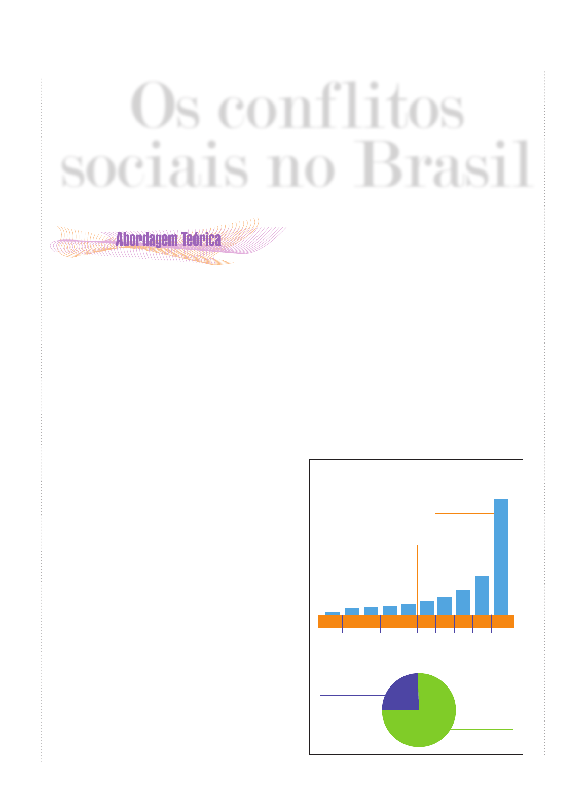 Os conflitos sociais no Brasil Vivemos em um país marcado pelos conflitos so- ciais, onde mansões dividem a paisagem com favelas; 10% da população vive com 75% das riquezas geradas, enquanto os 90% restantes têm que se contentar com os 25% que sobram da renda. A concentração de renda gera uma desigualdade social, promovendo conflitos nas cidades e no campo. O Brasil possui um dos piores indicadores sobre a distribuição de renda do mundo. Tal fato expõe os setores mais pobres de nosso país a problemas como baixa escolaridade, desem- prego, baixa renda, exposição à violência e má qua- lidade de vida. Histórico da concentração de renda A concentração de renda no Brasil tem sua ori- gem no período colonial, ou seja, desde a chegada dos portugueses ao nosso território. A política de dis- tribuição de sesmarias (grandes extensões de terra) criou uma elite latifundiária, que tinha nos escravos a sua mão-de-obra. Entre latifundiários e escravos estavam os comerciantes e trabalhadores livres. Em 1872, segundo o censo demográfico, 2% da população detinha dois terços da riqueza do país, uma distri- buição próxima a que se tem atualmente. O fim da escravidão, em 1888, não significou, por exemplo, uma redistribuição de terras, pois em 1850 fora assinada a Lei de Terras, determinando que as terras devolutas só poderiam ser adquiri- das pela compra. Essa lei se antecipou à abolição da escravatura, não permitindo o acesso às terras por parte dos negros, já que estes não possuíam dinheiro. Sendo assim, continuamos, a ter um país com extrema concentração fundiária, monocultor com mão-de-obra barata, beirando a miséria. Com a crise de 1929, temos o início de um período urbano-industrial com a quebra dos cafei- cultores, que acabaram investindo seus capitais no setor secundário da economia. Isso no Sudeste brasileiro, pois no Nordeste a economia continuava baseada no latifúndio. Durante o governo Vargas, com a industrializa- ção, houve uma série de conquistas sociais, como o salário mínimo e as leis trabalhistas. Entretanto, isso não significou uma verdadeira mudança na distribuição de renda no país. A falta de uma verdadeira reforma agrária e de uma eficiente reforma tributária é, talvez, um dos motivos pelo qual não se tem distribuição de ren- da efetiva no Brasil. A reforma agrária promoveria uma redistribuição de terras, por consequência de renda, enquanto a reforma tributária poderia levar aqueles que possuem mais riquezas a pagarem mais impostos. A riqueza e a exclusão no Brasil Mas quando se consideram, além da renda, os bens acumulados, a concentração é ainda maior 1% 2,5% 3% 46,9% 10% 7,3% 5,7%4,5% 3,4% 15,7% O IBGE mostra que um pequeno grupo detém grande porção da renda do país A metade mais pobre de toda população brasileira não chega a ter nem 15% da renda nacional Os 10% mais ricos ficam com quase metade de toda renda 10% + pobres 10% + ricos 10 9080706050403020 75,4% 90% da população tem apenas um quarto da riqueza Os 10% mais ricos ficam com três quartos de toda a riqueza do país 24,6% A tu al id ad es V es ti b ul ar 2 00 5 – E d . A b ri l. 1 A desigualdade social Aproximadamente 1,16 milhão dos 50 milhões de núcleos familiares do país possui renda mensal superior a 11 mil reais, segundo pesquisa das universidades paulistas. Isso demonstra a concentração de renda exis- tente no Brasil, bem ao contrário da boa distribuição, comum a grande parte dos países europeus. Segundo os especialistas, podemos chamar esta situação vivida no país de polarização social. Esta polarização é definida pela lógica “poucos com mais e muitos com menos”. Entre esses dois polos está a classe média, cuja qualidade de vida piorou signifi- cativamente nos últimos anos. Durante a década de 1990, a renda da classe média caiu cerca de 17%. Com a queda desse padrão de vida, houve a migração da classe média para a classe pobre, que cresceu 18%. A distribuição das riquezas no território A concentração das riquezas no país também tem conotação geográfica, quanto a sua localização. Das famílias que possuem renda superior a 11 mil reais, 70% está na região Sudeste – sendo 60% con- centrado apenas do estado de São Paulo, seguido do Rio de Janeiro, Minas Gerais e Rio Grande do Sul, os estados que possuem a maior presença de famílias de classe mais alta, respectivamente. Somente em 200 municípios brasileiros – ou seja, 4% do todo – a população encontra uma infraestrutu- ra econômica e serviços considerados satisfatórios. Nesses municípios vivem 26% da população brasilei- ra. Embora haja uma boa infraestrutura nesses locais, é importante salientar a existência da pobreza nos mesmos, entretanto, os acessos à educação, saúde e mercado de trabalho são facilitados. M au ro S ilv a. A situação é preocupante em 42% dos municí- pios brasileiros que possuem condições totalmente insatisfatórias. Esses locais, onde vivem 21% da população brasileira, são marcados pela falta de recursos, de comida, de trabalho e de assistência social. A maior parte desses municípios desestru- turados está no Nordeste (72%), seguido pelo Norte (14%) e pelo Sudeste (10%). Nas regiões Nordeste e Norte, problemas como a ausência de escolaridade e as poucas ofertas de emprego têm sido fonte de exclusão social. Nas demais regiões, temos a violência e a falta de emprego, mesmo para pessoas de maior escolaridade, surgindo como grandes agravantes de problemas sociais. Pobreza no país – 2000 Exclusão social Ao longo da história, a exclusão social – que caracteriza população de baixa renda, exposição à violência, má qualidade de vida – é associada ao grau de escolaridade, o menor tempo de estudo, limita as possibilidades de obtenção de um bom emprego e, por consequência, de participação da distribuição da riqueza. Entretanto, no Brasil, o aumento gradativo