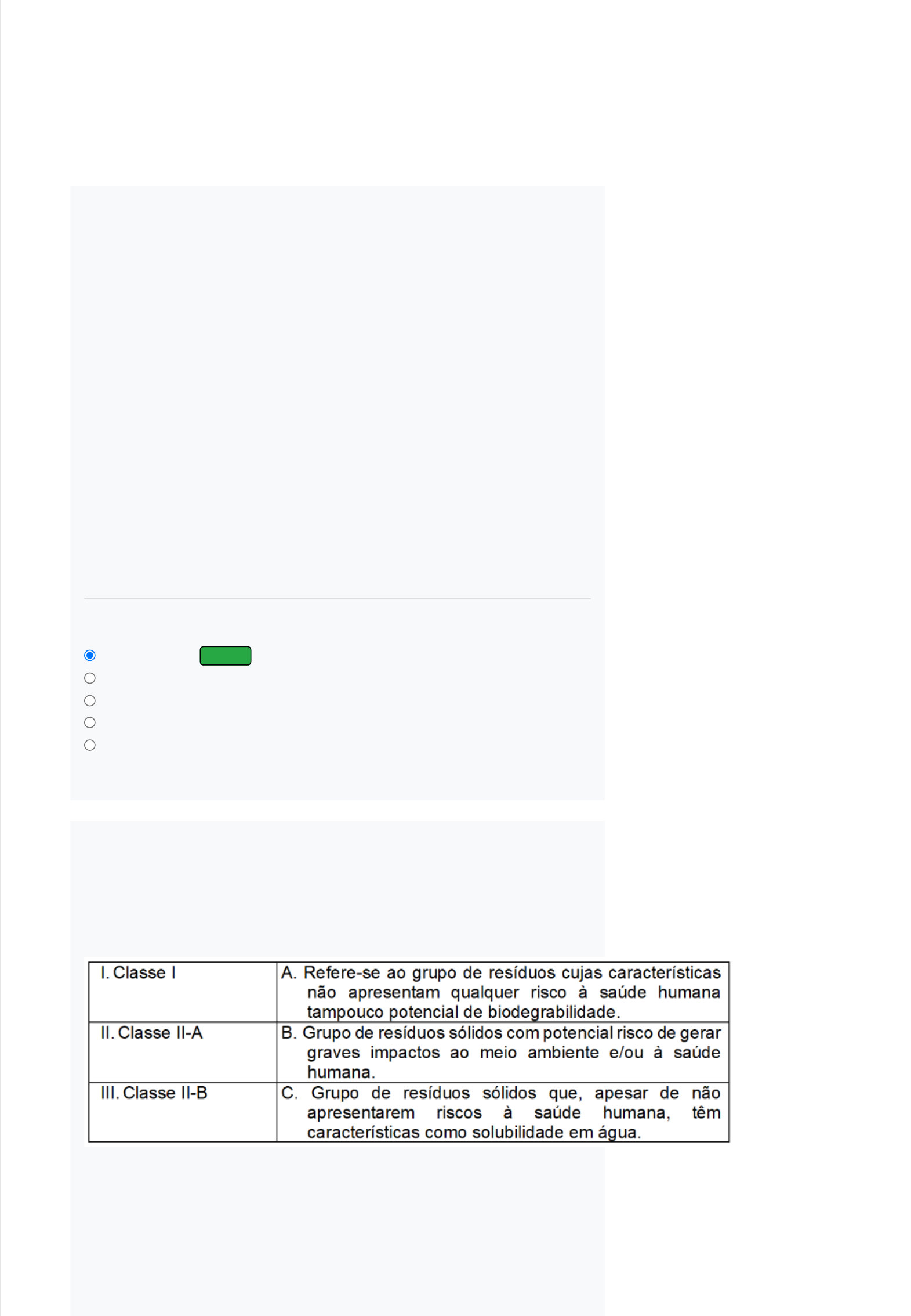 24/05/2023, 15:27 Cosmos · Cosmos https://kroton.platosedu.io/lms/m/aluno/disciplina/index/2809065/5978892 1/5 Análises ambientais Professor(a): João Vitor Rodrigues de Souza (Mestrado acadêmico) 1) 2) Prepare-se! Chegou a hora de você testar o conhecimento adquirido nesta disciplina. A Avaliação Virtual (AV) é composta por questões objetivas e corresponde a 100% da média final. Você tem até cinco tentativas para “Enviar” as questões, que são automaticamente corrigidas. Você pode responder as questões consultando o material de estudos, mas lembre-se de cumprir o prazo estabelecido. Boa prova! Com relação às etapas de gerenciamento de resíduos sólidos, analise as afirmativas a seguir e assinale-as com V (verdadeiro) ou F (falso): ( ) Diferentemente dos resíduos sólidos, um único aterro sanitário é projetado e pode receber resíduos de diferentes características, incluindo, por exemplo, resíduos de Classe I e aterro sanitário Classe II. ( ) O monitoramento ambiental dos parâmetros do solo e da qualidade das águas subterrâneas são exemplos de acompanhamentos que devem ser realizados para se medir impactos ambientais de aterros. ( ) Os aterros sanitários, popularmente denominados lixões, são áreas projetadas e concebidas para receber resíduos sólidos sem causar impactos severos no ambiente. ( ) A etapa de segregação dos resíduos sólidos, quando realizada na cadeia de gerenciamento de resíduos, corrobora para uma maior eficiência das demais etapas. ( ) A etapa de tratamento de resíduos sólidos baseia-se em métodos físicos, químicos e/ou biológicos, e um dos objetivos é reduzir os potenciais danos que estes resíduos poderiam provocar no ambiente. Assinale a alternativa que contenha a sequência correta de V e F: Alternativas: Código da questão: 75666 Para ajudar os geradores de resíduos a classificar os resíduos que produzem, a Associação Brasileira de Normas Técnicas (ABNT) desenvolveu diretrizes de classificação de resíduos. Tais diretrizes se caracterizam por um conjunto de processos, passo a passo, que resultam em três diferentes classes de resíduos sólidos. Em relação a esses conceitos, julgue os itens a seguir: Início da descrição. O quadro é formado por duas colunas e três linhas. A primeira coluna traz três opções: 1. Classe I, 2. Classe II-A; e 3. Classe II-B. A segunda coluna traz também três opções: A. Refere-se ao grupo de resíduos cujas características não apresentam qualquer risco à saúde humana tampouco potencial de biodegrabilidade.; B Grupo de resíduos sólidos com potencial risco de gerar graves impactos ao meio ambiente e/ou à saúde humana.; e C. Grupo de resíduos sólidos que, apesar de não apresentarem riscos à saúde humana, têm características como solubilidade em água. Assinale a alternativa que traz a associação correta entre as duas colunas: F – V – F – V – V. CORRETO V – F – F – V – F. V – V – F – V – V. F – V – V – V – F. V – F – V – V – F. 24/05/2023, 15:27 Cosmos · Cosmos https://kroton.platosedu.io/lms/m/aluno/disciplina/index/2809065/5978892 2/5 3) 4) Alternativas: Código da questão: 75667 O futuro da economia oceânica global é atualmente visto como um avanço em direção a uma “economia azul” – indústrias oceânicas socialmente equitativas, ambientalmente sustentáveis e economicamente viáveis. Assim, para alcançar a sustentabilidade, devemos encontrar um equilíbrio entre os três pilares em relação a ser viável, equitativo e suportável. Em relação a esses conceitos, julgue os itens a seguir: Início da descrição. O quadro é formado por duas colunas e três linhas. A primeira coluna traz três opções: 1. Suportável; 2. Equitável; e 3. Viável. A segunda coluna traz também três opções: A. Ocorre quando uma nação se esforça para atender ao crescimento econômico e ao desenvolvimento, enquanto as operações são realizadas com a proteção dos recursos ambientais.; B. Ocorre quando a sociedade trabalha para ajustes de estilo de vida. Com isso, estamos cientes do nosso impacto e, a partir de então, contribuímos para um ambiente mais saudável e para o bem-estar.; e C. Equilíbrio necessário para atingir plenamente uma parcela igual e justa dos recursos de uma nação para seu povo. Final da descrição. Assinale a alternativa que traz a associação correta entre as duas colunas: . Alternativas: Código da questão: 75657 Os Objetivos de Desenvolvimento Sustentável (ODS) foram adotados pelas Nações Unidas, em 2015, como uma chamada universal à proteção ambiental e ao combate às desigualdades sociais. Assim, pode-se afirmar que os ODS são descritos na Agenda 2030 para o Desenvolvimento Sustentável com intuito de que: Alternativas: I-A; II-B; III-C. I-A; II-C; III-B. I-C; II-B; III-A. I-B; II-C; III-A. CORRETO I-B; II-A; III-C. I-A; II-C; III-B. I-C; II-A; III-B. CORRETO I-B; II-A; III-C. I-C; II-B; III-A. I-A; II-B; III-C. Sejam obrigatoriamente implementados em países da União Europeia. 24/05/2023, 15:27 Cosmos · Cosmos https://kroton.platosedu.io/lms/m/aluno/disciplina/index/2809065/5978892 3/5 5) 6) Código da questão: 75654 A respeito dos conceitos e aplicação de ciclos biogeoquímicos, analise as afirmativas a seguir e assinale-as com V (verdadeiro) ou F (falso): ( ) Os ciclos biogeoquímicos são importantes para os organismos vivos e incluem os ciclos da água, carbono, nitrogênio, fósforo e enxofre. ( ) Os ciclos biogeoquímicos são críticos para a existência da vida, transformando energia e matéria em formas utilizáveis para apoiar o funcionamento do ecossistema. ( ) O carbono é um elemento essencial nos corpos de todos os organismos vivos e uma fonte essencial de energia para muitos organismos. Seu ciclo ocorre exclusivamente por meio do ambiente terrestre, em diferentes escalas espaciais e temporais. ( ) Os nutrientes devolvidos ao solo não estão dispon