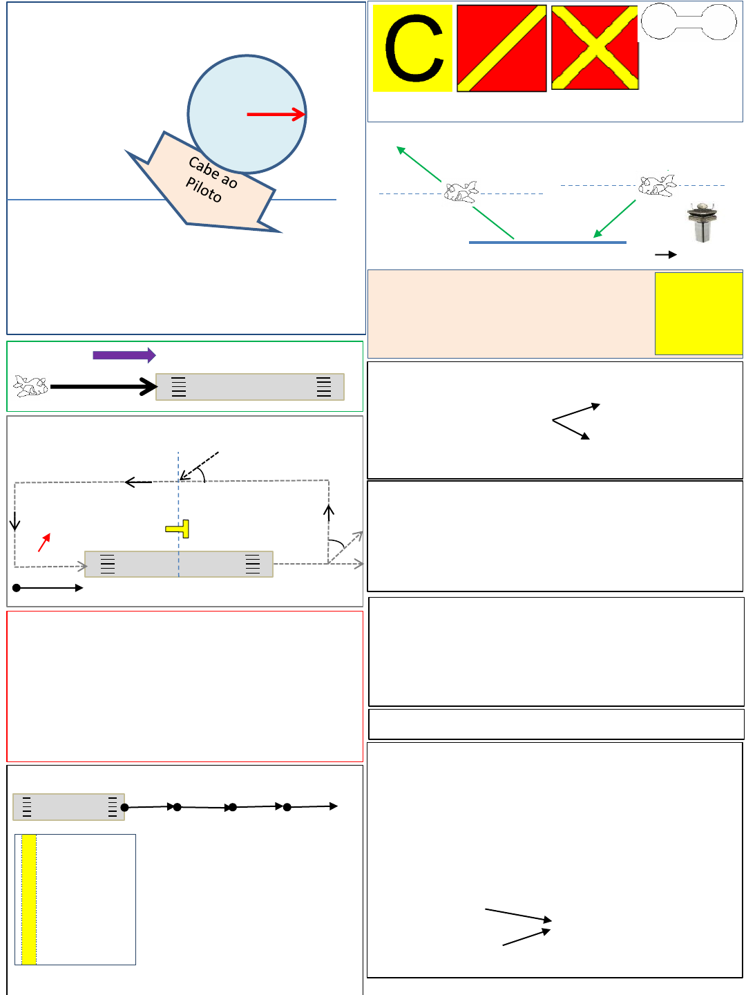 Órgão Estação Aeronáutica (RÁDIO) Para tráfego essencial e espaço aéreo inferior Serviços: AFIS AS Meteorologia Vento QNH Temperatura - Manter escuta - Informar posições críticas - Escolher RWY - Separação no solo e no ar - Informar hora de decolagem - Informar e esclarecer quando indagado 50km Sem TWR PROIBIDO POUSO DIRETO 15 km Pouso direto TRÁFEGO EM AERÓDROMO NÃO CONTROLADO 45º 500’ 1000’ 1000’ 45º 1000’ Reta final 300m = 1000’ 1000’ Razão de descida = 500’/min O QUE É VOO EM ROTA: - Acima de 50 km (27NM) do aeródromo - Além do limite da TMA - Dentro ou fora das AWY - VFR noturno em ROTA pode...desde que: piloto e avião : IFR - separação vertical: aviões ajustam 1013,2 MENSAGEM DE POSIÇÃO 30 min 1h 1h 1h Onde reportar: - No cruzamento das CTA e FIR - Pontos compulsórios - Quando solicitado I dentificação P osição H ora zulu A ltitude E stimativa I dentificação NOS ESPAÇOS B, C, D Sala AIS Precaução no pouso Pouso proibido Pousar, Decolar, Taxiar só em pista pavimentada ou compactada Altitude De transição: QNH >QNE Nível De transição: QNE >QNH aeródromo O ajuste despreza a decimal: 1018,9 1018 I 7500 Ilícito C 7600 Comunicação E 7700 Emergência e interceptação SERVIÇO DE ALERTA estimado de fonia INCERFA 30 min após (incerteza) estimado de chegada ACC notifica ao explorador antes do RCC ALERFA - após INCERFA (alerta) - 5 min após estimado de pouso - operação anormal sem indicação de pouso forçado - Interferência ilícita = 7500 ACC notifica ao explorador antes do RCC DETRESFA - após ALERFA (perigo) - Falta de combustível - operação anormal indicação pouso forçado - fará ou fez pouso forçado ACC notifica ao RCC antes do explorador Frequência Internacional de Emergência: 121,5 SINAIS DE SOCORRO: SOS = telegrafia MAY DAY (3x) = fonia Foguetes com luz vermelha em espaços curtos de tempo PAN PAN (3x) = fonia (aviso que fará mensagem importante) SINAIS DE URGÊNCIA: (necessito pousar, mas não preciso de assistência Imediata) Farol de pouso apaga-acende-apaga ........ Luz de navegação Recomendado mas não previsto no ICA100-12 2000 Aguarda instrução do ATC b io gl en io @ ig .c o m .b r ÓRGÃO ATS CONTROLA (ou ____, se delegado) ACC (ou APP).................................CTA, UTA, FIR APP (ou TWR) ............... TMA, CTR, aproximação TWR ...................................ATZ Estação aeronáutica (Rádio) ...................AFIZ Autorização de tráfego .....................Tráfego Controle de solo .................................Solo Além do circuito, Circuito e Solo 1: autorização para taxiar Antes de acionar: chamar Tráfego, Solo ou TWR Se autorizado ...... 5min para acionar e taxiar TWR dá: pista em uso, vento, ajuste, temp., RVR, hora 2: 50m de distância se pista ≥ 900m 30m de distância se pista < 900m Solo transfere para TWR 3: autorização para decolagem 4: perna do vento: autorização para pouso perna base: reportar “trem baixado e travado” 5: hora do pouso, desligar transponder, autorização para táxi, TWR tranfere para Solo 6: estacionar Vento < 6kt: piloto escolhe cabeceira Vento < 1kt: torre informa vento calmo Altura: hélice – 1000’ reação – 1500’ Final longa > 7km Aprox. Direta = 15km (sem TWR: proibido aprox. Direta) O QUE É TRÁFEGO ESSENCIAL? a) Aviões nas vizinhaças do aeródromo. Veículos, e pessoas na área de manobra que ofereçam perigo b) Aviões em voo e sob controle e separação dos demais. Ex: Um voo VFR não é essencial para outro no espaço C PARA INICIAR POUSO OU DECOLAGEM: A outra aeronave deve estar em A, B ou C curvou passou cabeceira livrou ESTEIRA DE TURBULÊNCIA Efeitos: Balanço violento (mais perigoso) perda de altura e velocidade esforços na estrutura Leve ≤ 7000kg < Média < 136.000kg ≤ H Pesada Pouso: 3min Decolagem: 2min Tempos acima em: Mesma pista Pistas paralelas < 760m de separação Transversais Trajetórias que se cruzam Defende a (defesa aérea) Guerra, Ferido, e Salva o Presidente da Manobra Na Emergência, o Planador Ferido Salvou da (SAR) Guerra o Presidente da Manobra Luzes da TWZ Verde Branco vermelho Pouse ... Livre Pouse ... Regresse Pouse ... Estacionamento Não pouse ... Por enquanto Não pouse ... Impraticável Não pouse ... Dê passagem PRIORIDADES Pouso Convergência Decolagem b io gl en io @ ig .c o m .b r AEROVIAS (AWY) – LIMITES LATERAIS UTA CTA Limite vertical: 500’ abaixo do FL mínimo indicado na ERC LUZES DO AVIÃO Voando: Após por-do-sol: navegação e anticolisão Após nascer-do-sol: anticolisão VMC: condições meteorológicas visuais 1000’ 1500m 1000’ Visibilidade = 5km Não pode decolar, pousar nem Entrar no circuito de tráfego se... Teto < 1500’ (450m) e Visibilidade < 5km Nível máximo = FL 145 ... < 150 Acima do FL 100, inclusive visibilidade = 8km velocidade máxima = 380kt Abaixo do FL 100 visibilidade = 5km velocidade máxima = 250kt no espaço B = 380kt NÃO É OBRIGATÓRIO RÁDIO Avião agrícola onde há AFIS Planador e avião onde há TWR ou AFIS Avião em traslado LIMITES DOS ESPAÇOS AÉREOS UNL superior (UTA) FL 245 exclusive FL 245 inferior (CTA) FL 245 inclusive solo ou água (MSL) Limites laterais: indicados na ERC ESPAÇOS CONDICIONADOS P = proibido D = danger R = restrito Exemplo: SBD – 310 FL-20 GND 3° COMAR ÁREA nº 10 Do solo ao nível 20 ROTAS ATS Além da TMA Além de 25NM Aerovia (AWY) superior (UTA) > FL245 = U Aerovia inferior < FL245 = W Assessoramento = D Informação = F Saída, chegada e RNAV (navegação de área) 80km 40km 400km 200km 200km 40km auxílio auxílio auxílio 30km 15km 100km 100km 100km 20km auxílio auxílio auxílio Solo: metade da Área de visão V c A B C D E F G I i c c i i a i i VFR sujeito a controle VFR não Precisa PLN IFR sujeito a controle Espaço Controlado ESPAÇOS AÉREOS AUTONOMIA (RBHA 91.151) VFR diurno = A + B + 30 min VFR noturno = A + B + 45 min QUEM AUTORIZA O USO Aeródromo Público = ANAC (Ho