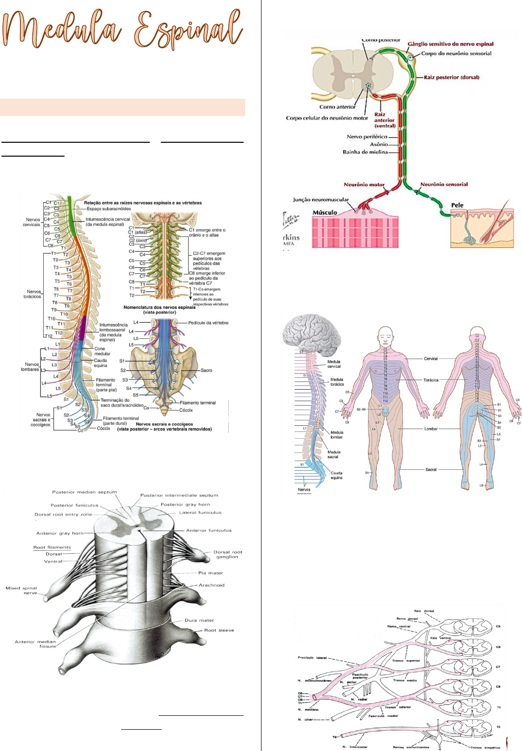 João Manuel – Medicina Nove de Julho ANATOMIA INTRODUÇÃO O sistema nervoso periférico é constituído por 12 pares de nervos cranianos e 31 pares de ner- vos espinais, distribuídos da seguinte forma: 8 cervicais, 12 torácicos, 5 lombares, 5 sacrais, 1 coccígeo. Sistema nervoso periférico (os nervos) em cone- xão com o sistema nervoso central (medula). A medula possui células permanentes . As radículas se unem para formar as raízes, quando as raízes se juntam forma os nervos mistos, esse nervo misto tem axônios sensitivo (posterior a medula) e motores (anterior a me- dula), uma parte vai para os músculos e outra parte vai para pele (na segunda camada, derme, onde tem os receptores). Quando uma informação chega é aferente, quando ele volta é eferente. Dermátomo: território cutâneo inervado por fi- bras de uma única raiz dorsal (raiz posterior). Vale lembrar que todos os nervos espinais são formados por 2 raízes, uma posterior (sensitiva) e uma anterior (motora). Essas raízes se unem para formar os nervos mistos (31 pares de ner- vos espinais), o qual adiante se separa em ra- mos, motor quando atinge músculo (miótomo) e sensitivo quando alcança a pele (dermátomo). João Manuel – Medicina Nove de Julho O neurônio existente na raiz posterior é classifi- cado como pseudounipolar. Na raiz anterior en- contramos neurônios classificados morfologica- mente como multipolar. A embriologia do sistema nervoso é de origem ectodérmica: SNC (tubo neural) e SNP (crista neural). MEDULA ESPINAL A medula espinal pertence ao SNC e representa a principal via de comunicação entre a periferia e o encéfalo; o inverso também é verdadeiro. Esse órgão encontra-se dentro do canal verte- bral, tem início na base do crânio e se estende por 45 cm até o nível vertebral de L1/L2. Partes anatômicas da medula: Intumescência cervical (é uma dilatação que tem relação com plexo braquial, encontra-se entre os segmentos de C3-T2). Intumescência Lombar, encontra-se entre os segmentos L1-S3 e tem relação direta com o plexo lombosacral. Cone medular, repre- senta o término da medula, encontra-se entre as vertebras L1-L2. Filamento terminal, repre- senta a pia-máter, esse ligamento irá se trans- formar no ligamento coccígeo. Ligamento coccí- geo, tem origem a partir da pia-máter, sendo responsável por estabilizar a medula espinal dentro do canal vertebral no sentido craniocau- dal (prova). Ligamento denticulado, tem origem a partir da pia-máter, sendo responsável por es- tabilizar a medula no sentido laterolateral. Cauda equina, é constituída por raízes dos ner- vos espinais que compõe o plexo lombossacral. ANATOMIA EXTERNA Anatomia externa da medula espinal: exter- namente é levemente achatada na região ante- rior e apresenta as seguintes impressões. 1- Fissura mediana anterior 2- Sulco lateral anterior 3- Sulco lateral posterior 4- Sulco mediano posterior (está presente só na questão cervical da medula). Divisão da substância branca da medula es- pinal: 1- ligamento coccígeo encontra-se entre a fissura mediana anterior e sulco lateral anterior. Nessa região a presença de axô- nios, já que é substância branca, que transmite informações de pressão e tra- toprotopático. 2- Funículo lateral: encontra-se entre o sulco lateral anterior e o posterior. Nessa região encontramos axônios e neurônios que transmitem informações de dor, temperatura, propriocepção inconsci- ente (pois a informação vai para o cere- belo e não para o córtex). 3- Funículo posterior: encontra-se entre o sulco lateral posteiro e o sulco mediano posterior, sendo responsável por conter axônios que transmitem informações de vibração, propriocepção consciente (vai para o córtex) e tato epicrítico. Na região central da medula, encontramos a substância cinzenta, a qual fica distribuída em forma de H medular. A substância cinzenta é for- mado por corpos de neurônios, sendo dividida da seguinte forma: João Manuel – Medicina Nove de Julho 1- Coluna anterior: local que se encontra corpos de neurônios motores. 2- Coluna lateral: está presente da T1-L2, local em que se origina o sistema nervoso simpático (sistema nervoso autônomo). 3- Coluna posterior: local em que encon- tramos corpos de neurônios sensitivos. Na região central H medular, há um orifício de- nominado de canal medular, o qual possui lí- quor. MENÍNGES O sistema nervoso é envolto por 3 membranas de tecido conjuntivo, chamadas de meninges: 1- Dura-máter: meninge mais externa. 2- Aracnóide-máter: meninge média. 3- Pia-máter: meninge mais externa. Essas meninges são responsáveis por isolar, proteger e revestir o sistema nervoso. Trajeto da agulha nas anestesias gerais: Epi- derme à derme à hipoderme (tecido adiposo) à ligamento supraespinal à ligamento interes- pinal à ligamento amarelo à espaço epidural (entre a dura-máter e canal vertebral) à dura- máter à espaço subdural à aracnóide-máter à espaço subaracnóide (possui líquor).