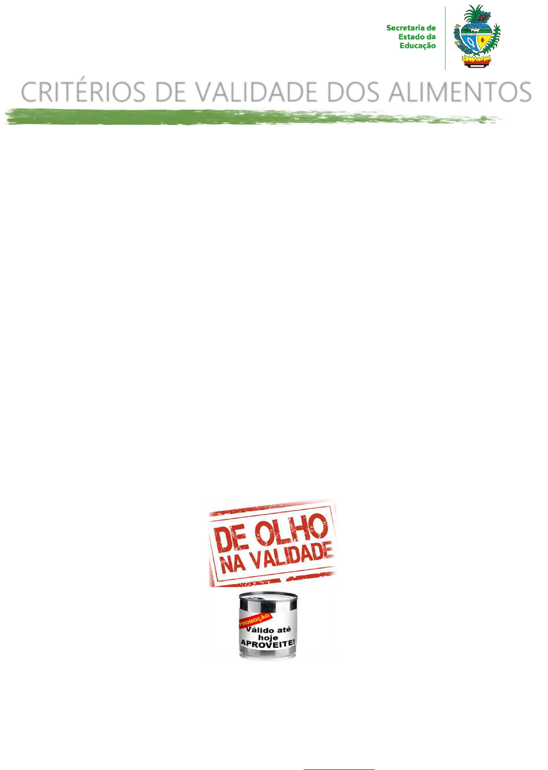 Secretaria de Estado de Educação Gerência de Alimentação Escolar – gae@seduc.go.gov.br Av. Anhanguera, nº 1630 – Leste Vila Nova – Goiânia – GO. CEP: 74643-10 As recomendações dos fornecedores quanto ao critério de validade encontram-se no rótulo de cada produto e quando estes não determinarem o prazo de validade do produto após abertura, é considerado o prazo estabelecido de acordo com a tabela abaixo. Importante: Os critérios de validade definidos nessa tabela só são considerados quando forem inferiores ao prazo de validade para produto aberto informado pelo fabricante ou forem inexistentes. CRITÉRIOS DE VALIDADE DOS ALIMENTOS mailto:gae@seduc.go.gov.br Secretaria de Estado de Educação Gerência de Alimentação Escolar – gae@seduc.go.gov.br Av. Anhanguera, nº 1630 – Leste Vila Nova – Goiânia – GO. CEP: 74643-10 ARMAZENAMENTO EM TEMPERATURA AMBIENTE TIPOS PRODUTOS ABERTOS OU RETIRADOS DA EMBALAGEM VALIDADE/ CONSERVAÇÃO Temperos secos, especiarias, e pós para infusões Sal, chá, leite em pó, fermento químico. 30 dias Bicarbonato de sódio, noz-moscada, colorau, curry, orégano, louro 60 dias Sobras não manipuladas de produtos estocáveis Açúcar, adoçante 30 dias Pós para gelatina, curau, pudim, flan Achocolatado, chocolate em pó Ervilha seca, canjica, grão-de-bico, lentilha, feijão, arroz, soja em grãos Óleos Óleo de soja, azeite de oliva 30 dias Farinhas e massas secas Farinha de trigo, farinha de rosca e de mandioca, fubá, trigo para quibe, mistura para bolo, macarrão, amido de milho 30 dias Frutas secas e oleaginosas Coco ralado, damasco, figo, tâmara e castanha. 15 dias Produtos de panificação Pão francês (sem recheio) 24 h Pão de leite sem recheio, torradas, bolo em pedaço (sem recheio/cobertura), petit four com recheio e confeitos. 3 dias mailto:gae@seduc.go.gov.br Secretaria de Estado de Educação Gerência de Alimentação Escolar – gae@seduc.go.gov.br Av. Anhanguera, nº 1630 – Leste Vila Nova – Goiânia – GO. CEP: 74643-10 ARMAZENAMENTO SOB REFRIGERAÇÃO (0 °C A 10°C) CONGELAMENTO (INFERIOR A -12 °C) CONFORME ORIENTAÇÃO DO FORNECEDOR *Produto Industrializado PRODUTOS ABERTOS OU RETIRADOS DA EMBALAGEM VALIDADE/ CONSERVAÇÃO Doces industrializados Goiabada, marmelada, marrom glacê, beijinho, brigadeiro, doce de leite, mel de abelha, frutas secas e frutas cristalizadas 15 dias Creme de leite. 3 dias Enlatados e conservas Pêssego, abacaxi, cereja, figo em calda, leite de coco, ervilha, milho verde, extrato de tomate, palmito, ameixa-preta, leite condensado 7 dias Azeitonas, alho processado. 15 dias Temperos líquidos Vinagre, molho shoyo, inglês, Catchup, mostarda, maionese 15 dias Óleos Manteiga 15 dias Frios, embutidos, defumados e laticínios Embalagem aberta: salsicha, mortadela, presunto, apresuntado, salame, bacon, linguiça calabresa, paio, peito de peru, ricota, queijo minas, muçarela, prato 3 dias Embalagem aberta: catupiry, requeijão 3 dias Manipulados, fatiados, ralados: salsicha, mortadela, presunto, apresuntado, salame, bacon, linguiça calabresa, paio, peito de peru, ricota, queijo minas, muçarela, queijo prato 24 h 48 h 72 h Hortifrúti minimamente processados Resfriado. 24 h Congelado. 15 dias Fermento Fermento biológico. 5 dias Suco Conc. Líquido - galão 15 dias Pães Pão congelado. 7 dias mailto:gae@seduc.go.gov.br Secretaria de Estado de Educação Gerência de Alimentação Escolar – gae@seduc.go.gov.br Av. Anhanguera, nº 1630 – Leste Vila Nova – Goiânia – GO. CEP: 74643-10 ARMAZENAMENTO DE ALIMENTOS MANIPULADOS/PREPARADOS PRODUTOS ABERTOS OU RETIRADOS DA EMBALAGEM VALIDADE/ CONSERVAÇÃO Hortifruti Folhas desinfetadas sem tempero ou decoração Frutas desinfetadas inteiras ou cortadas (mamão, melancia, melão, etc) Legumes ou grãos cozidos sem tempero 12 h (≤ 4 °C) Sobremesas Doce em calda/calda de açúcar 3 dias (≤10 °C) Temperos Alho, sal 5 dias (≤ 10 ºC) Alho e sal e (batidos) 24 h (≤ 10 °C) Marinados (desde que com temperos ácidos, como vinagre e limão) 24 h (≤ 4 °C) Salsa, manjericão, cebolinha, alecrim desidratados 3 dias (ambiente) Multiprodutos Salgados crus (empada, coxinha, esfirra) 24 h (≤ 4 °C) 7 dias (≤ -12 °C) Sanduíche natural 24 h (≤ 4 °C) Batata palha 3 dias (ambiente) Sucos naturais Diversos sabores Imediato Salada de Frutas Salada de frutas/frutas picadas 12 h (≤ 4 °C) Doces manipulados Brigadeiro/Beijinho/Trufas/Mousses/Tortas /Pudins/ Bolo com recheio 24 h (≤ 10 °C) Outros Bolo sem recheio/biscoitos secos /farinha de rosca/torradas 3 dias (ambiente) Bacon frito 24 h (ambiente) Carnes bovinas Aparas/Carne moída 24 h (≤ 4 °C) Carnes pré-preparadas sem tempero (iscas e cubos) 2 dias (≤ 4 °C) Carnes com tempero 24 h (≤ 4 °C) mailto:gae@seduc.go.gov.br
