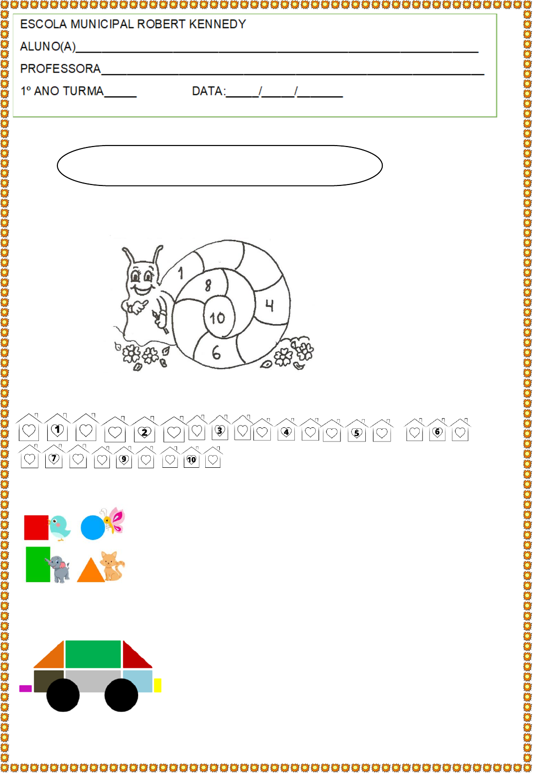 ATIVIDADE AVALIATIVA I UNIDADE – MATEMÁTICA 1- COMPLETE COM O NUMERAL QUE FALTA NO CARACOL PARA COMPLETAR A SEQUÊNCIA: 2- VAMOS COLOCAR O ANTECESSOR E O SUCESSOR DOS NÚMEROS ABAIXO? 3- QUAL O NOME DA FIGURA ABAIXO QUE ESTÁ PERTO DO GATINHO? RESPOSTA: _____________________________ 2. QUANTOS CÍRCULOS APARECEM NA FIGURA ABAIXO? RESPOSTA: _____________________________ 3. QUE FORMA GEOMÉTRICA PLANA A NOTA DE 10 REAL REPRESENTA? a) CÍRCULO. b) QUADRADO. c) RETÂNGULO. d) TRIÂNGULO. 4.CIRCULE O OBJETO ABAIXO QUE POSSUI O FORMATO DE UM CILINDRO. 5.LIGUE OS SÓLIDOS GEOMÉTRICOS AOS OBJETOS CORRESPONDENTES. 6. VEJA A ALTURA DAS CRIANÇAS NA RÉGUA E RESPONDA AS PERGUNTAS ABAIXO QUAL DELES É O MAIS ALTO? __________________ QUAL DELES É O MAIS BAIXO? _________________ QUEM TEM MENOS DE UM METRO? _____________