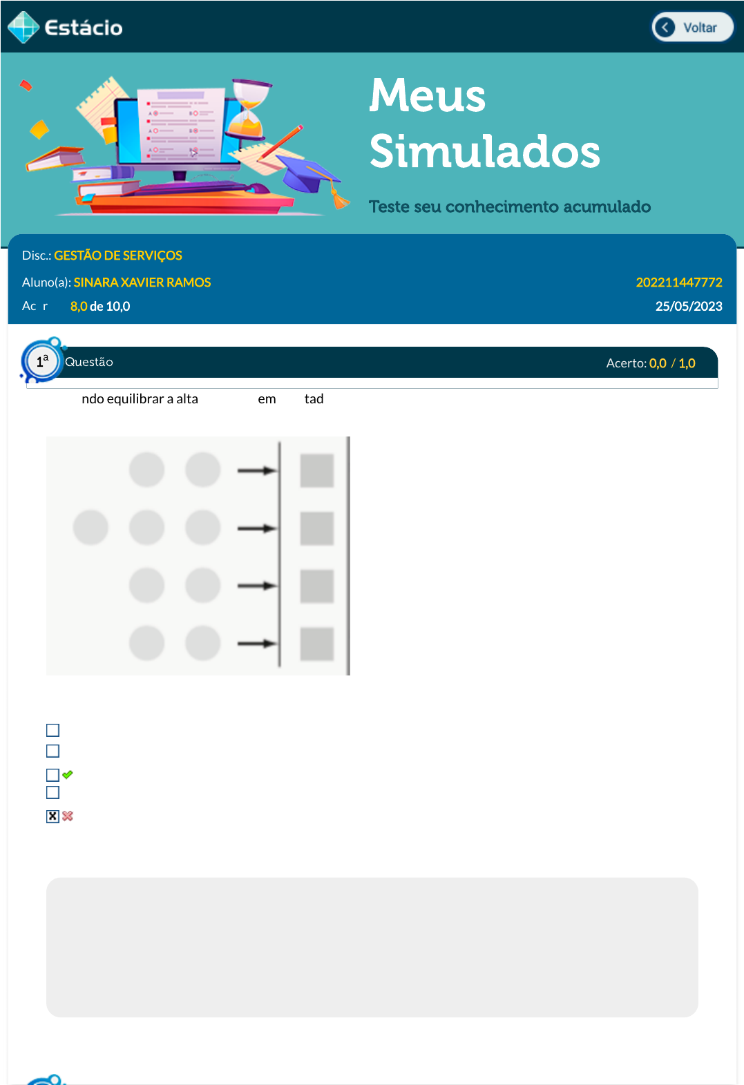 25/05/2023, 20:27 Estácio: Alunos https://simulado.estacio.br/alunos/ 1/6 Meus Simulados Teste seu conhecimento acumulado Disc.: GESTÃO DE SERVIÇOS Aluno(a): SINARA XAVIER RAMOS 202211447772 Acertos: 8,0 de 10,0 25/05/2023 Acerto: 0,0 / 1,0 Buscando equilibrar a alta demanda em prestadores de serviços, muitas gerências adotam o sistema de �las. Nesse contexto, observe a imagem a seguir. Assinale a alternativa que descreve a situação representada na imagem. Filas únicas - estágios sequenciais. Fila ordenada por senha. Filas paralelas para vários atendentes. Filas únicas - atendente único. Fila única para vários atendentes. Respondido em 25/05/2023 19:51:09 Explicação: Filas paralelas para vários atendentes: Oferecem mais de uma estação de atendimento, permitindo que os clientes escolham a menor �la, como em supermercados e bilheterias. Em restaurantes de fast-food, geralmente, também existem diversas �las de atendimento em horários movimentados. A desvantagem desse tipo de �la é que, normalmente, não anda com a mesma velocidade. Você já deve ter escolhido uma �la que parecia menor e, depois, percebeu que as outras andavam mais rápido, porque alguém a sua frente executava uma transação mais demorada ou complexa. Questão1 a https://simulado.estacio.br/alunos/inicio.asp javascript:voltar(); 25/05/2023, 20:27 Estácio: Alunos https://simulado.estacio.br/alunos/ 2/6 Acerto: 0,0 / 1,0 No âmbito do gerenciamento de operações de serviços os estudos e práticas mais modernas apontam para a vantagem do gerenciamento da cadeia de fornecimento como um todo. Essa atividade, apesar de parece simples, precisa lidar incertezas de diversas origens. São elas: I. Desempenho do fornecedor; II. Con�abilidade no processo produtivo; III. Demanda dos consumidores. IV. Custos do processo. Assinale a alternativa que indica os itens corretos: II, III e IV, apenas. I, II e IV, apenas. I, II, III e IV. I, II e III, apenas. I, III e IV, apenas. Respondido em 25/05/2023 19:52:26 Explicação: O gerenciamento de uma cadeia de fornecimento seria uma tarefa direta, exceto pela incerteza advinda de três fontes principais: 1. Desempenho do fornecedor; 2. Con�abilidade no processo produtivo; 3. Demanda dos consumidores. Acerto: 1,0 / 1,0 Segundo Kotler, são características dos serviços: ser heterogêneos, com possibilidade de desempenho e julgamentos diferentes, dependendo do fornecedor e do cliente. ter a produção e o seu consumo inseparável, facilitando sobremaneira o controle e o julgamento em sua avaliação. ser basicamente intangíveis, julgados pelo desempenho e pelas experiências vivenciadas pelo fornecedor. ser quantitativos. apresentar a percepção e avaliação da qualidade dos serviços pelos consumidores, baseando-se principalmente em critérios de julgamento objetivos. Respondido em 25/05/2023 19:08:47 Explicação: A resposta correta é: ser heterogêneos, com possibilidade de desempenho e julgamentos diferentes, dependendo do fornecedor e do cliente. Acerto: 1,0 / 1,0 Questão2 a Questão3 a Questão 4 a 25/05/2023, 20:27 Estácio: Alunos https://simulado.estacio.br/alunos/ 3/6 Os desa�os de distribuição em âmbito nacional são inúmeros. Em um país do tamanho do Brasil, de dimensões continentais com 5.570 municípios o desa�o torna-se maior. Um dos maiores problemas para quem precisa distribuir seus serviços em outros locais que não a sua sede e que exige conhecimento tributário é: diferenças de legislação entre os estados. padronização dos serviços. restrição dos serviços de autoatendimento. extinção do "facilitador de �la" (pré-atendimento). falta de informações sobre desejos e necessidades dos clientes. Respondido em 25/05/2023 19:09:39 Explicação: A resposta correta é: diferenças de legislação entre os estados. Acerto: 1,0 / 1,0 Além de questões técnicas referentes à função especí�ca, um funcionário que atua na linha de frente de um serviço deve ser treinado também para habilidades interpessoais. Existem itens importantes que devem ser aprendidos pelos funcionários de serviços desde o momento da sua contratação. Assinale a alternativa que não corresponde a um desses itens: A cultura da empresa. As habilidades pessoais para o trabalho. O conhecimento técnico sobre o produto ou serviço. Os objetivos e a estratégia da empresa. As habilidades interpessoais e técnicas de trabalho. Respondido em 25/05/2023 19:11:51 Explicação: A resposta correta é: As habilidades pessoais para o trabalho. Acerto: 1,0 / 1,0 O objetivo do Marketing de Relacionamento não é vender mais para o maior número de consumidores, e sim vender mais para cada cliente atual. Diante dessa a�rmação, assinale a alternativa correta a respeito de Marketing de Relacionamento: O Marketing de Relacionamento trata de uma mudança profunda na forma de entender e trabalhar o relacionamento com os mercados. O Marketing de Relacionamento é de extrema di�culdade por não ser possível a utilização de banco de dados para a manutenção continua de duas vias com os clientes. O Marketing de Relacionamento deve buscar o conhecimento íntimo do indivíduo para estimular a compra de produtos na concorrência. A vantagem do Marketing de Relacionamento é a facilidade de ser implantado sem o envolvimento dos funcionários. O Marketing de Relacionamento defende que o trabalho de marketing deve ser direcionado para a massa e não para cada cliente individual. Respondido em 25/05/2023 19:13:35 Questão5 a Questão6 a 25/05/2023, 20:27 Estácio: Alunos https://simulado.estacio.br/alunos/ 4/6 Explicação: A resposta correta é: O Marketing de Relacionamento trata de uma mudança profunda na forma de entender e trabalhar o relacionamento com os mercados. Acerto: 1,0 / 1,0 Um aluno de Administração de Empresas estudou, na disciplina de Marketing de Serviços, que os serviços se distinguiam dos bens basicamente em função das característi