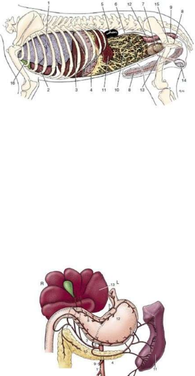 ♡ Complete: 8. Ureta 1. Pulmão 9. Reto 2. Coração 10. Intestino 3. Figado 11. Baço 4. Estomago 12. Colon 5. Rim 13. Ducto eferente / aferente 6. Ureter 14. Testiculo 7. Visicula Urina - Bexiga 15. Femur / 15 Timo ♡ Qual a diferença entre as camadas visceral e parietal da pleura? Pleura Pulmonar visceral reveste a cobertura interior e a a camada parietal reveste a cobertura exterior. ♡ Cite os órgãos que fazem parte do: a) Mediastino Cranial: - Vasos, nervos (passagem p/ cabeça e pescoço - Traqueia - Esôfago - Arco aórtico e veia cava cranial - Timo (animais jovens) b) Mediastino Médio: - Coração + pericárdio - Grandes vasos (base do coração) - Traqueia (Carina) e Esôfago - Ducto torácico c) Mediastino Caudal: - Aorta - Esôfago - Nervos - Ligamento pulmonar ♡ A respeito dos planos e eixos dos animais domésticos é correto afirmar que: A) O plano mediano divide o corpo em duas porções: dorsal e ventral. B) Os termos: palmar e plantar são aplicados a partir dos ossos carpianos e tarsianos, respectivamente. C) O termo axial é aplicado a estruturas pertencentes aos membros. D) O plano horizontal ou também chamado de dorsal divide o corpo em: direito e esquerdo ♡ Delimite a Cavidade Abdominal. ♡ Parede dorsal: - Vértebras lombares - Músculos lombrares - Parte lombar do diafragma ♡ Paredes laterais: - Músculos abdominais oblíquos e transversos - Fáscia abdominal - Partes craniais dos ílios com músculos ilíacos - Cartilagens das costelas esternais e costelas caudais que estão abaixo do diafragma ♡ Parede ventral: - 2 Músculos retos + aponeuroses dos músculos oblíquo e transverso - Fáscia abdominal - Cartilagem xifoide ♡ Parede Cranial: - Diafragma (profundamente côncavo) aumenta o tamanho da cavidade ♡ Quais estruturas comunicam a Cavidade Torácica (Pleural) e a Cavidade Abdominal (Peritoneal) ? Qual é a topografia destas estruturas? ♡ Hiato aórtico: Localizado ventralmente às vértebras entre os pilares diafragmáticos direito e esquerdo ♡ Hiato esofágico: Entre os ramos do pilar diafragmático direito, onde os troncos do nervo vago também passam pelo diafragma ♡ Forame da veia cava Localizado na cúpula do diafragma ♡ O que são órgãos Retroperitoneais? Cite os nomes e sua topografia. Órgãos localizados fora da cavidade peritoneal Ex: Rins e Glândulas adrenais Topografia: retroperitoneal (fora do peritônio) ♡ Descreva a posição Anatômica Correta de um cão: Olhar direcionado para o horizonte, pescoço 90 graus, membros apontados para o solo. ♡ Descreva a topografia da Vesícula Urinária Vesícula urinária (bexiga) quando repleta é localizada na região hipogástrica e quando vazia é localizada na cavidade pélvica. ♡ O Diafragma separa a Cavidade Torácica da Cavidade Abdominal Plano Mediano divide o corpo em dois antimeros, direito e esquedo Cranio-caudal e Dorso- ventral. Plano Horizontal divide o corpo em dois paquimeros Latero-Lateral e Dorsal Ventral Plano Transversal divide o corpo em dois metameros Latero Lateral e Dorso Ventral ♡ Delimite a Cavidade Torácica. Parde Dorsal: Vértebras torácicas - Músculos e ligamentos Paredes laterais: - Costelas - Músculos intercostais Parede ventral - Esterno - Cartilagens costais - Músculos ♡ Quais órgãos estão dentro do tórax mas pertencem a Cavidade Abdominal? Órgãos intratorácicos: fígados, vesícula e parcialmente o estômago (órgãos são da cavidade torácica) ♡ Qual a diferença entre Mesentério e Omento? Omento: curvatura menor do estomago se liga ao figado por meio do omento e a curvatura maior do estomago se liga ao baço , por meio do Omento. Já o menenterio liga (fixa) o intestino junto a parede do abdomen. ♡ Delimite a Cavidade Pélvica. ♡ Parede dorsal: - Sacro e asas do ílio ♡ Parede ventral: - Púbis (sínfise) ♡ Paredes laterais: - Ílio (direito e esquerdo) ♡ Porção dorsal: reto/ ânus ♡ Porção média: útero ♡ Porção ventral: vesícula urinária ♡ Descreva a Topografia do Coração O ápice do coração projeta-se para o antímero direito. Fica no centro da cavidade toracica, no mediastino médico. Aproximadamente entre a 3 e 6 costela. _____ _ ♡ Ligue os órgãos que fazem sintopia: ESÔFAGO TR AQUEIA PULMÃO CORAÇÃO DIAFRAGMA FÍGADO VESÍCULA BILIAR ESTÔMAGO DUODENO INTESTIGO GROSSO PÂNCREAS BAÇO RIM ESÔFAGO TR AQUEIA PULMÃO CORAÇÃO DIAFRAGMA FÍGADO VESÍCULA BILIAR ESTÔMAGO DUODENO INTESTIGO GROSSO PÂNCREAS BAÇO RIM O que é paquimeria? a) Construção do corpo dividido em dois antímeros dado pelo plano mediano b) Construção do corpo dado por porções sequenciais de cranial para caudal dado pelos planos transversos c) Construção do corpo dado por dois tubos: dorsal (neural) e ventral (visceral) d) Construção do corpo dado por camadas sobrepostas, de superficial pa ra profundo e) Nda O que é holotopia? a) Relação do órgão com o corpo b) Relação do ór gão com seus vizinhos imediatos c) Relação do órgão consigo mesmo d) Relação do órgão com o esqueleto e) Nda 03. O que é sintopia? a) Relação do órgão com o corpo b) Relação do órgão com seus vizinhos imediatos c) Relação do órgão consigo mesmo d) Relação do órgão com o esqueleto e) Nda ♡ O fígado pertence a qual Cavidade? Qual porção? Cavidade Addominal – Porção ♡ Porque o coração se localiza o antímero esquerdo? Porque existe mais quantidade de lobos pulmonares (tecidos pulmonares) do lado direito ♡ O pâncreas faz sintopia com quais órgãos? Sintopia com duodeno, piloro (corpo) estômago e caudalmente com o fígado _____