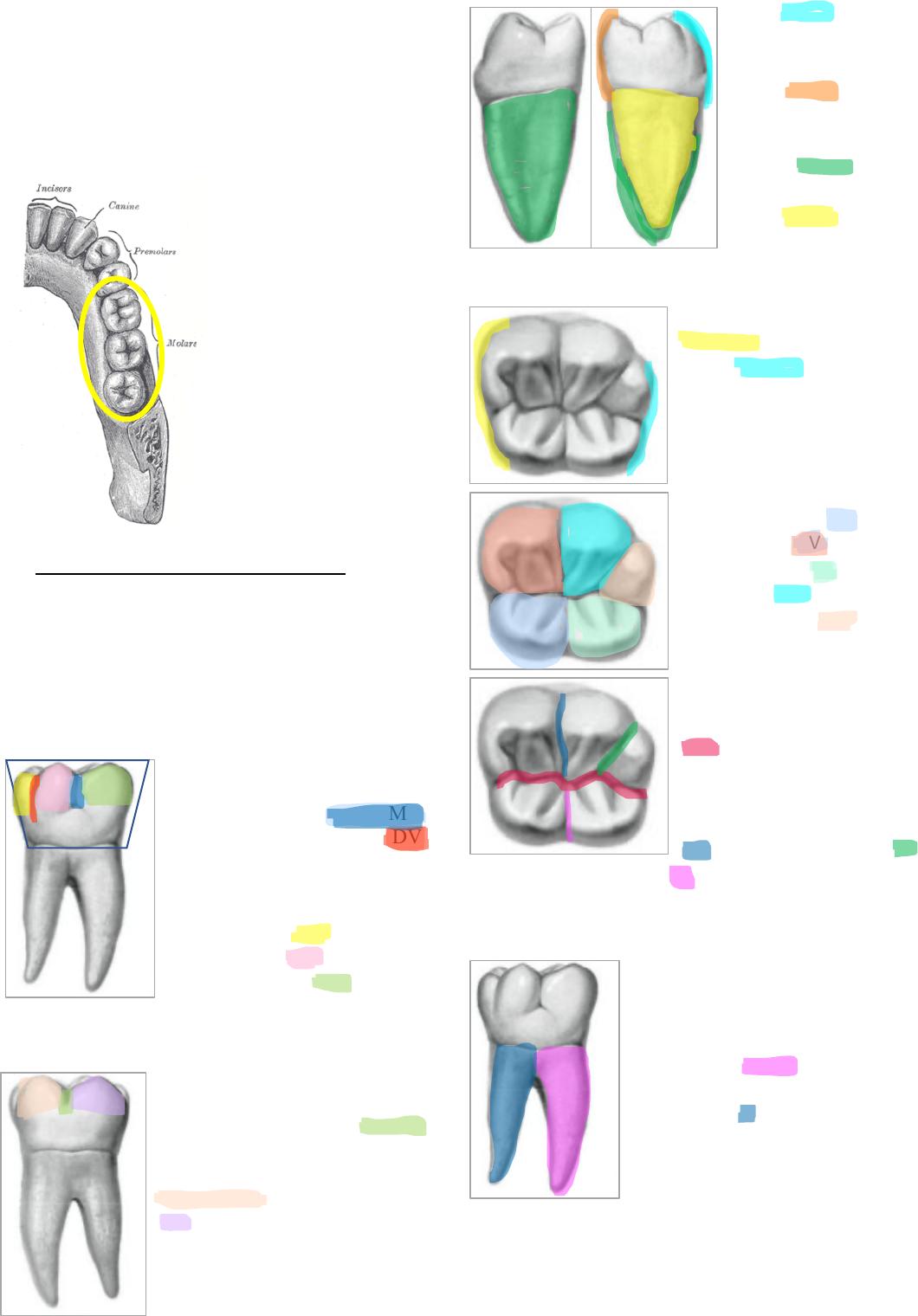 Odontologia Morfo Funcional è MOLARES INFERIORES Tem três em cada hemiarcada Sua formação é decrescente Tetra ou penta cuspidados Possui duas raízes è PRIMEIRO MOLAR INFERIOR: Considerado o maior dente da boca com uma coroa alongada no sen2do M (mesio) – D (distal), tetracuspidado ou em alguns casos pentacuspidado, com duas raizes M (mesial) e D (distal). Face vestibular: Possui um formato trapezoidal, com a presença de dois sulcos, o sulco MV (mesio vestibular) e o DV (disto vestibular). Na face vestibular podemos notar a presença de três cúspides, DV (disto vestibular), VM (vestíbulo mediana) e a MV (mesio vestibular maior). Face lingual: Sua face lingual é semelhante a face vestibular, porem, seu tamanho é menor, o seu sulco L (lingual) termina em depressão e tem a presença de duas cúspides ML (meseio lingual) e DL (disto lingual). Faces de contato: A sua face V (ves2bular) tem uma grande inclinação para a face L (lingual), com uma grande diferença de tamnho entra a face M (mesial) que é maior que a face D (distal). Face Oclusal: De uma vista oclusal, a sua borda M (mesial) é maior que a borda D (distal). Tem a presença de cinco cúspides de tamanho desigual. Em ordem decrescente, as cúspides são classificas da seguinte forma: ML (mesio Lingual), MV (mesio ves2bular), DL (disto lingual), VM (vesKbulo mediana) e DV (disto ves2bular). Para a separação dessas cúspides, contamos com a presença de quatro sulcos: MD (mesio distal) que é classificado como um sulco paracentral, que não está ao centro da colusal do dente, VO (vesKbulo oclusal), DO (disto oclusal) e o sulco OL (ocluso lingual). Raízes: Com a presença de apenas duas raizes, que se desenvolve separadamente, são largas no sentido V (vestibular) – L (lingual), e a raiz M (mesial) tem a caraterística de ser mais longa e sulcada, já a D (distal) é curta e curvada. è SEGUNDO MOLAR INFERIOR: Conhecido como o dente da adolescência, que ira erupcionar a partir dos treze anos de idade. Ele é menor que o primeiro molar inferior e possui apenas quatro cúspides. Face vestibular: A sua morfologia é semelhante a do primeiro molar inferior (possui um formato trapezoidal), se diferencia por ser maior do que a face lingual, o seu sulco V (vestibular) é menor e termina suavemente sem uma fosseta. Face lingual: A sua morfologia é semelhante a do primeiro molar inferior (possui um formato trapezoidal), é menor que a face V (vestibular), e pode ter a ausência do sulco L (lingual). Faces de contato: A sua morfologia é semelhante a do primeiro molar inferior (possui um formato trapezoidal), a sua face D (distal) é consideravelmente menor do que a face M (mesial). M D E I S S I T A A L L Raizes: As suas raízes são menores e mais curtas se comparadas com as do primeiro molar inferior, são menos divergentes. Face Oclusal: Apresenta dois sulcos, com um aspecto cruciforme (em formato de cruz, com um sulco paracentral. O sulco MD (mesio distal), e o VL (vestíbulo lingual), e no encontro cental destes sulcos se encontra uma fosseta central losangica. è TERCEIRO MOLAR SUPERIOR: Conhecido como o dente do siso ou do juízo, que pode apresentar um grande número de sulco secundários, e na maioria dos casos tem coalescência e má formação das raízes, que acaba dificultando a sua extração. As formas mais comuns que vemos em consultórios, são os pentacuspidados e tetracuspidados.
