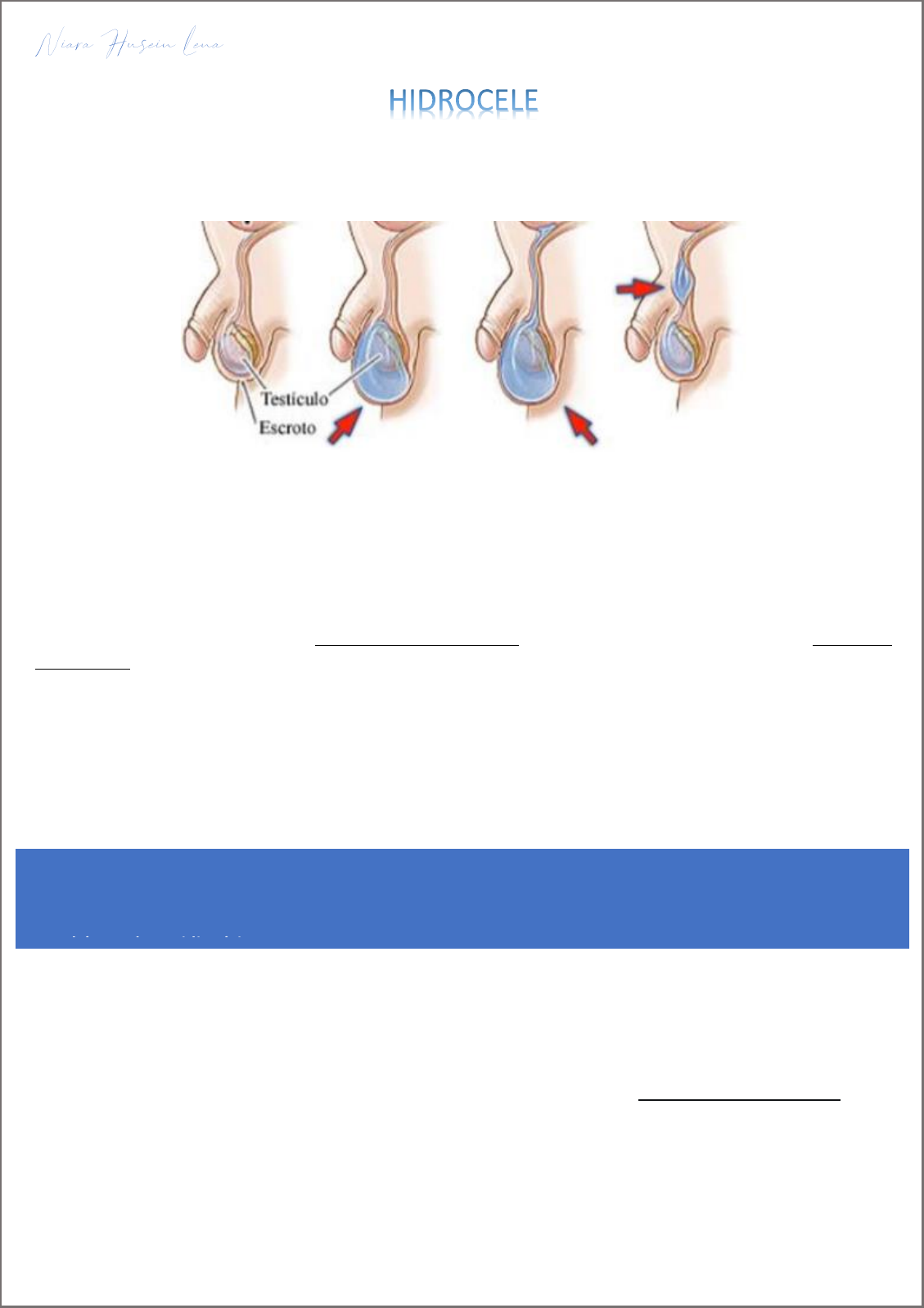 É o acúmulo de líquido dentro do escroto, que é a bolsa externa de pele que contém os testículos. É uma doença benigna comum em recém nascidos e normalmente não provoca dor ou qualquer outro sintoma além do inchaço que pode afetar um ou os dois testículos. Geralmente desaparece em torno de um ano de idade, sem necessitar de tratamento. Caso o inchaço se torne muito intenso, pode surgir uma dor leve e desconforto na região escrotal. FISIOPATOLOGIA Ao redor das 20 a 28 semanas de gestação, ocorre a passagem do testículo através do canal inguinal devido à abertura do processo vaginal. Este, geralmente fechará após essa passagem. Entretanto, na hidrocele comunicante, não ocorre a obliteração do processo vaginal, o que explica a ocorrência de tal patologia. A túnica vaginal é uma camada fascial que encapsula um espaço potencial que abrange os dois terços anteriores do testículo. Diferentes tipos de líquido podem se acumular dentro da túnica vaginal, como líquido peritoneal na hidrocele. Já a hidrocele não comunicante consiste na presença de líquido na bolsa escrotal sem comunicação com a cavidade peritoneal, podendo ser idiopática ou secundária. CLÍNICA O principal quadro clínico na hidrocele é de um abaulamento indolor na região escrotal, que apresenta aumento volumétrico pior durante o dia. A presença de dor e incapacidade geralmente se relacionam com o tamanho. Sinais flogísticos falam a favor de condições subjacentes, como epididimite e torção testicular. O exame físico é marcado pela transiluminação positiva da região escrotal, sendo a técnica auxiliar mais comum no diagnóstico de hidrocele. Enquanto em neonatos são de origem congênita, associada a um processo vaginal patente que permite a passagem de líquido peritoneal para o escroto, nas crianças mais velhas, adolescentes e adultos, a hidrocele é usualmente adquirida e relacionada a processos inflamatórios, torção testicular, trauma, tumor, mas também pode ser idiopática. Transiluminação: exame do interior de uma cavidade natural do corpo mediante uma forte luz que a ilumina por dentro e passa através de suas paredes; demonstra a passagem da luz através da coluna líquida comparado com a não transmissão através de um testículo ou massa sólida. DIAGNÓSTICO A ultrassonografia é o exame adicional de primeira escolha na avaliação da bolsa testicular, e coleções são encontradas frequentemente nestes exames. TRATAMENTO A maioria das hidroceles não requer intervenção na maioria dos indivíduos, pois, em geral, a hidrocele tende a reabsorver espontaneamente neste período. O tratamento fica reservado em pacientes sintomáticos com dor ou sensação de pressão ou quando a integridade da pele escrotal está comprometida por irritação crônica. Entretanto, alguns especialistas recomendam a cirurgia em casos de hidroceles volumosas ou comunicantes (abordagem inguinal aberta através da ligadura alta da persistência do conduto peritônio-vaginal). Nos casos de hidroceles não comunicantes, mas que são volumosas e sintomáticas, o procedimento cirúrgico mais comum é a excisão do saco da hidrocele. DIAGNÓSTICO DIFERENCIAL Hérnia inguinal; Tumor testicular; Hematocele