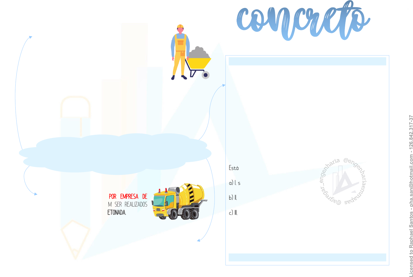 NBR 12655:2015 – Ensaios de Consistência OBS: NO CASO DE CONCRETO AUTOADENSÁVEL, A FREQUÊNCIA DE REALIZAÇÃO DOS ENSAIOS ESTÁ ESTABELECIDA NA ABNT NBR15823-1. FGV, 2019 De acordo com a ABNT NBR 12655:2015, “Concreto de cimento Portland — Preparo, controle, recebimento e aceitação — Procedimento”, para o concreto não autoadensável preparado por empresa de serviços de concretagem, devem ser realizados ensaios de consistência I. apenas na primeira amassada do dia. II. apenas ao reiniciar o preparo após uma interrupção da jornada de concretagem de pelo menos 2 h. III. a cada betonada. Está correto o que se afirma em: a) I, somente; b) II, somente; c) III, somente; d) II e III, somente; e) I e II, somente. Gabarito: Letra c. PARA O CONCRETO PREPARADO PELO CONSTRUTOR DA OBRA, DEVEM SER REALIZADOS ENSAIOS DE CONSISTÊNCIA SEMPRE QUE OCORREREM ALTERAÇÕES NA UMIDADE DOS AGREGADOS E NAS SEGUINTES SITUAÇÕES: A) NA PRIMEIRA AMASSADA DO DIA; B) AO REINICIAR O PREPARO APÓS UMA INTERRUPÇÃO DA JORNADA DE CONCRETAGEM DE PELO MENOS 2 H; C) NA TROCA DOS OPERADORES; D) CADA VEZ QUE FOREM MOLDADOS CORPOS DE PROVA. PARA O CONCRETO PREPARADO POR EMPRESA DE SERVIÇOS DE CONCRETAGEM, DEVEM SER REALIZADOS ENSAIOS DE CONSISTÊNCIA A CADA BETONADA. L ic en se d t o R ap h ae l S an to s - p h a. sa n @ h o tm ai l.c o m - 1 26 .8 42 .3 17 -3 7 NBR 12655:2015 – Armazenamento dos materiais componentes do concreto cimento DE ACORDO COM A MARCA, TIPO E CLASSE. CIMENTO FORNECIDO EM SACOS DEVE SER GUARDADO EM PILHAS, EM LOCAL FECHADO E PROTEGIDO. AS PILHAS DEVEM SER SEPARADAS POR LOTE RECEBIDO. AS PILHAS DEVEM SER SEPARADAS POR CORREDORES (PARA PERMITIR O ACESSO) E DEVEM SER APOIADAS EM ESTRADO OU PALETES DE MADEIRA. OS SACOS DEVEM SER EMPILHADOS EM PILHAS MÁXIMAS DE 15 UNIDADES – QUANDO FICAREM RETIDOS POR PERÍODO INFERIOR A 15 DIAS NO CANTEIRO DE OBRAS; OU DE 10 UNIDADES, QUANDO FICAREM POR PERÍODO MAIS LONGO. SILOS: ESTANQUES, PROVIDOS DE RESPIRADOURO COM FILTRO, TUBULAÇÃO DE CARGA E DESCARGA E JANELA DE INSPEÇÃO; CADA SILO DEVE TER IDENTIFICAÇÃO COM O REGISTRO DE TIPO, CLASSE E MARCA DE CIMENTO. DEVEM SER ARMAZENADOS SEPARADAMENTE EM FUNÇÃO DA SUA GRADUAÇÃO GRANULOMÉTRICA, DE ACORDO COM AS CLASSIFICAÇÕES INFICADAS NA NBR 7211; NÃO PODE HAVER CONTATO FÍSICO DIRETO ENTRE AS DIFERENTES GRADUAÇÕES; CADA FRAÇÃO GRANULOMÉTRICA DEVE FICAR SOBRE UMA BASE QUE PERMITA O ESCOAMENTO DA ÁGUA; DEVE SER EVITADO O CONTATO COM O SOLO E A CONTAMINAÇÃO. agregados água ARMANEZADA EM CAIXAS ESTANQUES E TAMPADAS, DE MODO A EVITAR A CONTAMINAÇÃO POR SUBSTÂNCIAS ESTRANHAS. DEVEM FICAR, ATÉ O INSTANTE DO SEU USO, EM SUAS EMBALAGENS ORIGINAIS OU EM LOCAL QUE ATENDA ÀS ESPECIFICAÇÕES DO FABRICANTE. O RECIPIENTE PARA O ARMAZENAMENTO DE ADITIVOS DEVE ESTAR MUNIDO DE IDENTIFICAÇÃO QUE PERMITA SUA RASTREABILIDADE. aditivos Lic en se d t o R ap h ae l S an to s - p h a. sa n @ h o tm ai l.c o m - 1 26 .8 42 .3 17 -3 7