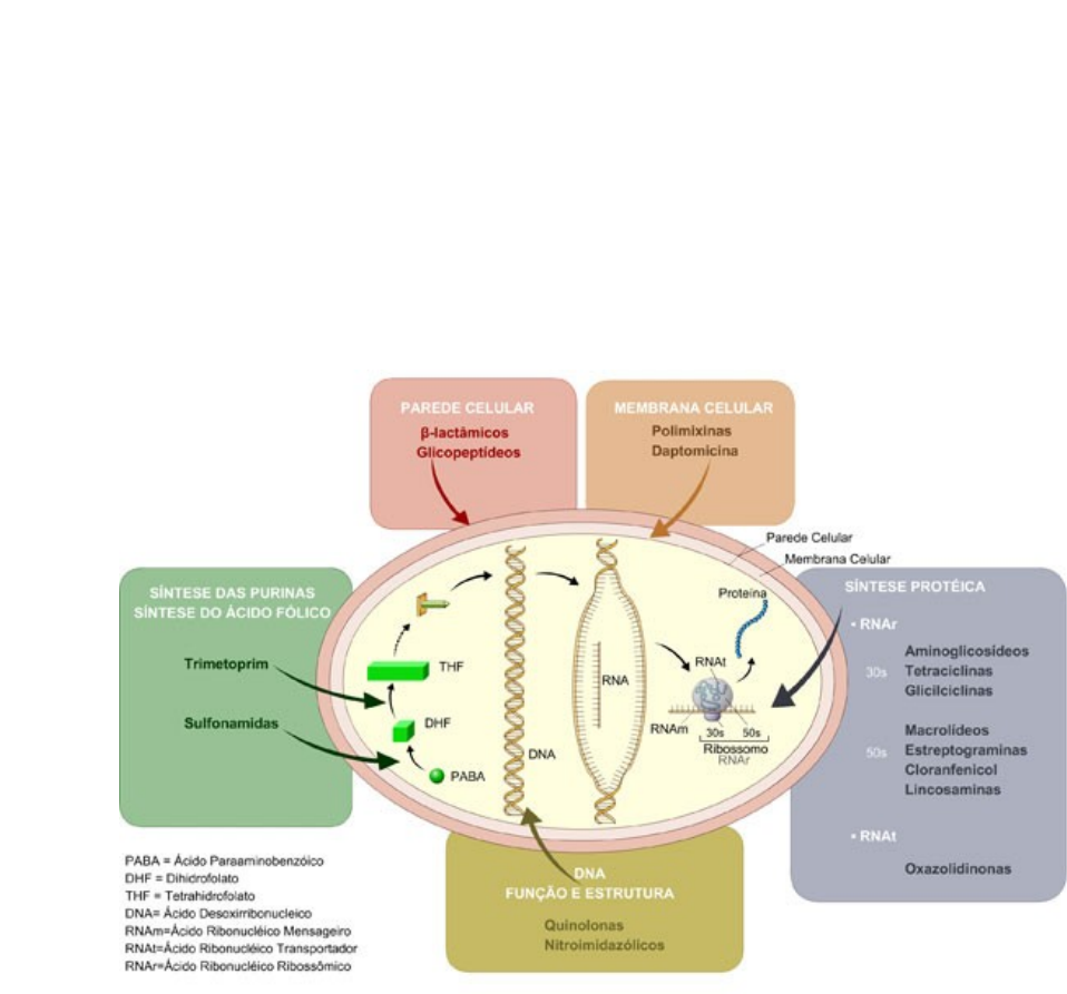 ANTIBIÓTICOS Qual é a finalidade dos antibióticos? Antibiótico é uma substância capaz de eliminar ou parar a reprodução de microorganismos – as bactérias. Classificações: · Mecanismo de ação (inibição da síntese da parede celular, inibição da síntese de proteínas, alteração do metabolismo bacteriano dos ácidos nucleicos, inibição do metabolismo bacteriano, alteração da permeabilidade da membrana) · Estrutura química (betalactâmicos, aminoglicosídeos, quinolonas, tetraciclinas, glicopeptídicos, polipeptídicos, macrolídeos, derivados do nitrobenzeno, sulfonamidas) · Espectro de atividade (amplo ou estreito) · Tipo de ação (Bactericida ou bacteriostático) Bactericida: destrói as bactérias que estão dentro do seu espectro de atividade; exerce um efeito letal e irreversível. Bacteriostático: inibe a multiplicação da bactéria, mas não a destrói. Com a suspensão desse tipo de droga a bactéria pode voltar a crescer (efeito reversível). · Origem Antibióticos devem ser utilizados somente se houver evidências clínicas ou laboratoriais de infecção bacteriana. Em geral, os médicos devem tentar usar antibióticos com o espectro mais estreito possível de atividade e pelo menor período de tempo. MACROLÍDEOS Representantes: Eritromicina, Claritromicina e Azitromicina (espectro mais ampliado) MECANISMO DE AÇÃO: Inibição da síntese proteica Efeitos adversos: dor epigástrica, diarreia, erupções cutâneas e febre SULFONAMIDAS Constituem a principal classe antibacteriana antes do advento da penicilina. Possuem ação bacteriostática Representantes: Sulfametoxazol (utilizado no tratamento das infecções tanto sistêmicas quanto do trato urinário, muito associado com trimetoprim = BACTRIM), sulfadoxina, sulfadiazina MECANISMO DE AÇÃO: Atuam na inibição do metabolismo, bloqueando a conversão de PABA (ácido para-aminobenzoico) em dihidrofolato (é usado para sintetizar purinas, que são necessárias para a síntese de DNA). Efeitos adversos: dor epigástrica, náuseas e vômitos. QUINOLONAS Representantes: Norfloxacina, Ciprofloxacino, Levofloxacino MECANISMO DE AÇÃO: Inibição da DNA girase e da topoisomerase IV, afetando o DNA. Efeitos adversos: dor epigástrica, náuseas e vômitos, risco de convulsões BETA-LACTÂMICOS Representantes: Penicilinas, Cefalosporinas MECANISMO DE AÇÃO: Inibição da síntese da parede celular Penicilinas Representantes: Ampicilina, Amoxacilina, Oxacilina Por quê associar ácido clavulânico a amoxicilina? Para proteger a amoxicilina da degradação das enzimas betalactamases e estende de forma efetiva o espectro antibiótico desse fármaco por abranger muitas bactérias normalmente resistentes a esse e a outros antibióticos betalactâmicos. Indicações clínicas: pneumonias, otites e sinusites, infecções cutâneas, meningites bacterianas Efeitos adversos: rach cutâneo, toxicidade renal Cefalosporinas São de amplo espectro. Indicações clínicas: AMINOGLICOSÍDEOS Representantes: Estreptomicina, Gentamicina, Amicacina MECANISMO DE AÇÃO: Inibem a síntese proteica ou produzindo proteínas defeituosas. Indicações clínicas: septicemias, infecções do trato urinário, infecções respiratórias. Efeitos adversos: nefrotoxicidade. Todos os aminoglicosídeossão potencialmente nefrotóxicos. GLICOPEPTÍDEOS Representante: Vancomicina (por via intravenosa tem boa distribuição na maioria dos tecidos) MECANISMO DE AÇÃO: Apresentam um múltiplo mecanismo de ação (Inibição da síntese do peptideoglicano, alteração da permeabilidade da membrana citoplasmática e interferem na síntese de RNA citoplasmático) Indicações clínicas: Infecções em próteses, endocardites. Vancomicina pode ser usada como alternativa aos beta-lactâmicos em pacientes alérgicos. Efeitos adversos: febre e calafrios. Nefrotoxicidade (vancomicina) TETRACICLINAS Representante: Tetraciclina, Minociclina e Doxiciclina Amplo espectro de ação e bacteriostáticos (quando em concentrações terapêuticas). MECANISMO DE AÇÃO: Ligam-se de maneira reversível à uma porção específica do ribossoma, bloqueando a ligação do RNA transportador, impedindo a síntese proteica. Efeitos adversos: urticárias, náuseas, vômitos, diarreia, cefaleia Absorção oral prejudicada pela ingesta concomitante de alimentos, antiácidos, leite e ferro. NITROIMIDAZOIS Representante: Metronidazol (forma oral, tópica e intravenosa) Ação bactericida. MECANISMO DE AÇÃO: Inativam o DNA e impedem a síntese enzimática. Efeitos adversos: cefaleia, náuseas, secura e gosto metálico na boca