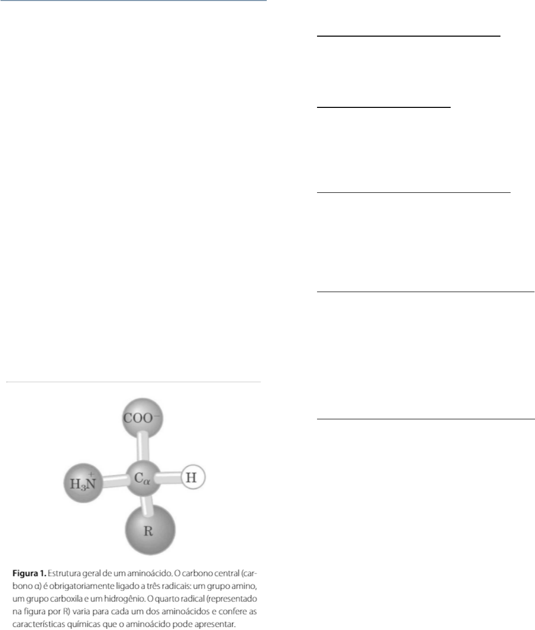 Unidade IV – Bioquímica aplicada 4º período - Farmácia Metabolismo da fenilamina e da tirosina Estrutura química dos aminoácidos · As propriedades químicas de uma molécula nos sistemas biológicos dizem muito sobre sua função, localização celular e importância para as células. Os aminoácidos são constituintes obrigatórios das proteínas, importantes macromoléculas fisiológicas, e no contexto celular eles são indispensáveis em várias funções, como por exemplo geração de energia, síntese proteica, síntese de nucleotídeos, síntese de antioxidantes, entre outros compostos necessários ao funcionamento celular. · Estruturalmente, os aminoácidos são compostos orgânicos que apresentam um átomo de carbono central (carbono α) que está sempre ligado aos três mesmos radicais: um grupo amino, um grupo carboxila e um átomo de hidrogênio (Figura 1). Em todos os aminoácidos que constituem as proteínas, exceto glicina, a quarta ligação se dá com um hidrogênio. Isso confere à molécula a propriedade de ter isomeria ótica, visto que o carbono α é quiral. Portanto, para todos os aminoácidos (excerto a glicina) existirá a forma D e a forma L, sendo a L a mais comum e, logo, a utilizada pela maquinaria celular para aplicações biológicas dos aminoácidos. Esse aspecto é importante porque as enzimas celulares são estereoespecíficas, ou seja, reconhecem a conformação das moléculas. · O radical presente nos aminoácidos é frequentemente chamado de cadeia lateral, e suas propriedades são as que ditam as características de toda molécula. Dessa forma, uma maneira de classificar aminoácidos é por meio das características químicas da sua cadeia lateral, o que gira cinco grupos diferentes (Figura 2), considerando o pH do meio sendo o pH biológico (próximo do pH 7,0). · Cadeia lateral apolar e alifática – neste grupo estão os aminoácidos hidrofóbicos, alanina, valina, metionina, prolina, leucina e isoleucina. Neste grupo está também a glicina, apesar de sua cadeia lateral não ser significativamente apolar. · Cadeia lateral aromática – grupo composto por fenilalanina, tirosina e triptofano. Os aminoácidos deste grupo são relativamente hidrofóbicos, entretanto, a cadeia lateral da tirosina e do triptofano podem realizar interações polares com outras moléculas. · Cadeia lateral polar, não carregada: grupo composto por serina, treonina, cisteína, asparagina e glutamina. Esses aminoácidos têm a habilidade de realizar ligações de hidrogênio com a água. Essas características são importantes para a estrutura das proteínas e, consequentemente, para a sua função fisiológica. · Cadeia lateral carregada positivamente – grupo formando por lisina, arginina e histidina, e tem um grupo amino extra em sua estrutura. São, juntamente com os aminoácidos carregados negativamente, os aminoácidos mais hidrofílicos. Os resíduos desses aminoácidos são utilizados em reações catalisadas por enzimas, pois as cadeias laterais funcionam como doadores ou aceptores de prótons. · Cadeia lateral carregada negativamente – os aminoácidos glutamato e aspartato apresentam carga negativa em pH fisiológico em razão da presença de um segundo grupo carboxila em sua estrutura. A fenilalanina, após ser hidroxilada, gera tirosina, precursora de dopamina, noradrenalina e adrenalina, neurotransmissores no sistema nervoso central (SNC). A tirosina é precursora da melanina, pigmento escuro presente na pele e nos cabelos. Via de síntese e de catabolismo da fenilalanina e tirosina · Outra maneira de classificarmos os aminoácidos é com relação à capacidade que os animais têm de produzi-los ou não. Assim, podemos classificar os aminoácidos em nutricionalmente essenciais (que precisamos ingerir na dieta) ou nutricionalmente não essenciais (que podemos produzir no nosso organismo). Todos os aminoácidos derivam de intermediários da glicólise, da via das pentoses fosfato ou do ciclo do ácido cítrico. Seres mais simples, como bactérias e plantas, têm capacidade de sintetizar todos os 20 aminoácidos que compõem as proteínas. Já os mamíferos foram perdendo a capacidade de produção ao longo da evolução, visto que o custo metabólico de produção de vários sistemas enzimáticos não compensaria, considerando a relativa abundância dos aminoácidos na dieta. A fenilalanina e a tirosina encontram-se no grupo de aminoácidos nutricionalmente essenciais. · A via de síntese desses aminoácidos não é simples, visto que a sua estrutura química tem um anel aromático. Essa via ocorre em bactérias, fungos e plantas e utiliza como precursores a eritrose-4-fosfato (intermediário da via das pentoses fosfato) e o fosfoenolpiruvato (intermediário da via glicolítica). Esses dois precursores, ao longo de sete passos enzimáticos, com emprego de energia na forma de ATP e de poder redutor na forma de NADPH, geram corismato. · O corismato é precursor tanto da síntese de fenilalanina e tirosina quanto da síntese de triptofano, outro aminoácido de estrutura complexa. Na síntese de fenilalanina e tirosina, outro aminoácido de estrutura complexa. Na síntese de fenilalanina e tirosina, o corismato é transformado em prefenato e pode seguir duas vias, sendo que ambas culminam em uma reação de transaminação com o glutamato (Figura 3), e liberam os aminoácidos fenilalanina e tirosina e o alfa-cetoglutarato. A tirosina também pode ser produzida a partir de fenilalanina pela ação hidroxilase, que promove a hidroxilação no carbono 4. Por esse motivo, a tirosina é considerada condicionalmente essencial e a necessidade de ingestão de fenilalanina dependerá de quanta tirosina é ingerida, visto que a fenilalanina será desviada para produção de tirosina dependendo da necessidade. · A reação da fenilalanina hidroxilase é também a primeira da via de degradação da fenilalanina, portanto, ambas seguem a mesma rota catab