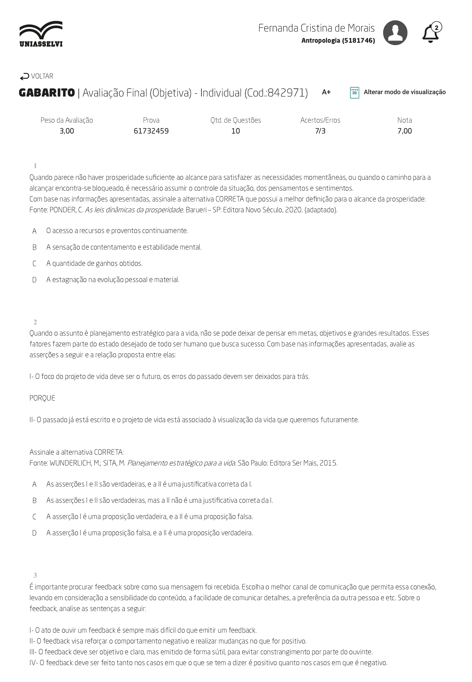 GABARITO | Avaliação Final (Objetiva) - Individual (Cod.:842971) Peso da Avaliação 3,00 Prova 61732459 Qtd. de Questões 10 Acertos/Erros 7/3 Nota 7,00 Quando parece não haver prosperidade suficiente ao alcance para satisfazer as necessidades momentâneas, ou quando o caminho para a alcançar encontra-se bloqueado, é necessário assumir o controle da situação, dos pensamentos e sentimentos. Com base nas informações apresentadas, assinale a alternativa CORRETA que possui a melhor definição para o alcance da prosperidade: Fonte: PONDER, C. As leis dinâmicas da prosperidade. Barueri – SP: Editora Novo Século, 2020. (adaptado). A O acesso a recursos e proventos continuamente. B A sensação de contentamento e estabilidade mental. C A quantidade de ganhos obtidos. D A estagnação na evolução pessoal e material. Quando o assunto é planejamento estratégico para a vida, não se pode deixar de pensar em metas, objetivos e grandes resultados. Esses fatores fazem parte do estado desejado de todo ser humano que busca sucesso. Com base nas informações apresentadas, avalie as asserções a seguir e a relação proposta entre elas: I- O foco do projeto de vida deve ser o futuro, os erros do passado devem ser deixados para trás. PORQUE II- O passado já está escrito e o projeto de vida está associado à visualização da vida que queremos futuramente. Assinale a alternativa CORRETA: Fonte: WUNDERLICH, M.; SITA, M. Planejamento estratégico para a vida. São Paulo: Editora Ser Mais, 2015. A As asserções I e II são verdadeiras, e a II é uma justificativa correta da I. B As asserções I e II são verdadeiras, mas a II não é uma justificativa correta da I. C A asserção I é uma proposição verdadeira, e a II é uma proposição falsa. D A asserção I é uma proposição falsa, e a II é uma proposição verdadeira. É importante procurar feedback sobre como sua mensagem foi recebida. Escolha o melhor canal de comunicação que permita essa conexão, levando em consideração a sensibilidade do conteúdo, a facilidade de comunicar detalhes, a preferência da outra pessoa e etc. Sobre o feedback, analise as sentenças a seguir: I- O ato de ouvir um feedback é sempre mais difícil do que emitir um feedback. II- O feedback visa reforçar o comportamento negativo e realizar mudanças no que for positivo. III- O feedback deve ser objetivo e claro, mas emitido de forma sútil, para evitar constrangimento por parte do ouvinte. IV- O feedback deve ser feito tanto nos casos em que o que se tem a dizer é positivo quanto nos casos em que é negativo. VOLTAR A+ Alterar modo de visualização 1 2 3 Fernanda Cristina de Morais Antropologia (5181746) 2 Assinale a alternativa CORRETA: Fonte: BENATTI, C. Comunicação assertiva: o que você precisa saber para melhorar suas relações pessoais e profissionais. São Paulo: Literare Books International, 2021 (adaptado). A Somente a sentença III está correta. B As sentenças I, II e IV estão corretas. C As sentenças I e II estão corretas. D As sentenças III e IV estão corretas. "(...) o empreendedor é alguém capaz de desenvolver uma visão, mas não só. Deve persuadir terceiros, sócios, colaboradores, investidores, convencê-los de que sua visão poderá levar todos a uma situação confortável no futuro". De posse das informações apresentadas e considerando as características de um perfil empreendedor, avalie as asserções a seguir e a relação proposta entre elas: I- A responsabilidade quanto a seus atos é uma característica do perfil empreendedor. PORQUE II- Os empreendedores tendem a culpar outras pessoas quando fracassam. Assinale a alternativa CORRETA: Fonte: DOLABELA, F. Oficina do empreendedor: a metodologia de ensino que ajuda a transformar conhecimento em riqueza. São Paulo: Cultura, 1999, p. 44. A A asserção I é uma proposição verdadeira e a II é uma proposição falsa. B As asserções I e II são verdadeiras, mas a II não é uma justificativa correta da I. C As asserções I e II são verdadeiras, e a II é uma justificativa correta da I. D A asserção I é uma proposição falsa e a II é uma proposição verdadeira. A aplicação mais prática das finanças certamente é no âmbito pessoal, ou seja, durante a rotina individual de cada indivíduo. Por exemplo, pagar as contas faz parte desse conceito, bem como administrar o salário para quitar todas as dívidas, usar o cartão de crédito sem comprometer seu orçamento ou provisionar um dinheiro para as situações de maior necessidade. Ou, ainda, escolher colocar parte do dinheiro em um investimento para comprar um carro no futuro em vez de contratar um financiamento. Então, suas finanças não estão relacionadas apenas ao que você ganha, mas às escolhas e estratégias que usa no gerenciamento das suas receitas e despesas. Por isso, cuidar das finanças pessoais é garantir que a renda mensal seja suficiente para suprir as necessidades básicas do cotidiano. Sobre as finanças pessoais, analise as sentenças a seguir: I- As finanças pessoais se referem às contas de cada pessoa II- As finanças pessoais mostram como gastamos ou guardamos nosso dinheiro. III- As finanças pessoais, bem controladas, ajudam a manter um saldo positivo no final do mês. IV- As finanças pessoais auxiliam o individuo a manter positivo a sua renda mensal, mas não ajudam na compra de bens caros. Assinale a alternativa CORRETA: Fonte: https://bityli.com/GOBEh. Acesso em: 16 jan. 2023. A As sentenças I, II e III estão corretas. B As sentenças III e IV estão corretas. C As sentenças I e IV estão corretas. D Somente a sentença I está correta. “O insucesso, assim como o sucesso, é de responsabilidade do indivíduo: quando não conseguir algo, não culpe Deus, os outros, o governo: a responsabilidade pelos resultados é única e exclusivamente sua. Essas são as condições, supere-as. Há um efeito de universalização dos sujeitos, pois qualquer pessoa é sig