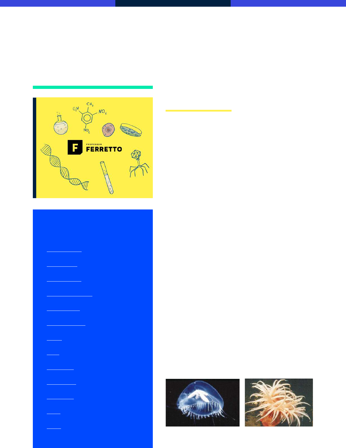 Biologia @p r o f e s s o r f e r r e t t o w w w . p r o f e s s o r f e r r e t t o . c om . b r f b . c om / P r o f e s s o r F e r r e t t o PROFESSOR FLÁVIO LANDIM ASSUNTOS DA AULA. • Características gerais • Tipos morfológicos • Organização corporal • Tipos celulares em cnidários • Células da epiderme • Células da gastroderme • Fisiologia • Classes • Classe Hydrozoa • Classe Scyphozoa • Classe Anthozoa • Leitura 1 • Leitura 2 FILO CNIDARIA Os cnidários (knide = urtiga), incluídos no filo Cnidaria, são ani- mais aquáticos caracterizados pela presença de células denominadas cnidócitos, com capacidade de produção e inoculação de neuro- toxinas urticantes. Essas toxinas causam queimaduras e, em algu- mas espécies, as toxinas podem causar parada respiratória e cardíaca. É o caso da vespa-do-mar (Chironex fleckerii), água-viva australiana que possui um dos venenos mais ativos do Reino Animália, sendo responsável por mais acidentes fatais do que tubarões na Austrália. O nome celenterados (koele = cavidade, enteron = intestino) se refere à existência de uma cavidade digestiva, a cavidade gas- trovascular (CGV). Os celenterados devem ser o primeiro grupo na escala evolutiva a apresentarem um tubo digestivo. Na verdade, o termo celenterados se refere a dois filos, o filo Cnidaria e o filo Ctenophora, de poucos representantes e que não será estudado detalhadamente. Assim, celenterados e cnidários, apesar de não serem exatamente termos sinônimos, serão usados como referência ao mesmo grupo, o filo Cnidaria. O filo Cnidaria é representado por cerca de 11 mil espécies de animais, todas obrigatoriamente aquáticas, predominantemente marinhas, mas eventualmente dulcícolas. Não existem represen- tantes terrestres. Alguns representantes dos cnidários são sésseis, como anêmonas- do-mar e corais, e outros são vágeis (móveis), como hidras e me- dusas em geral. Os menores representantes do grupo são algumas microscópicas medusas e as hidras de água doce, com 1 a 2 mm; os maiores são algumas medusas, com alguns metros, que nadam livre- mente em alto-mar. DIVERSIDADE E HABITATS Medusa. Anêmona-do-mar Isoteallia antarctica. Clique no assunto desejado e seja direcionado para o tema. 2 BIOLOGIA w w w.professor ferretto.com.br A maior importância dos cnidários está no aspecto médico. A toxina de cnidários pode causar desde lesões leves até acidentes fatais, como no caso da já citada vespa- do-mar australiana. Nenhuma medusa brasileira, no entanto, apresenta esse nível de toxicidade. Na verdade, a toxina de águas-vivas não produz queimaduras, mas sim a sensação de queimaduras, devido à sua ação sobre o sistema nervoso e à reação inflamatória que pode promover. O maior perigo está na dor provocada, que pode fazer um nadador perder a concentração e aca- bar se afogando. No caso de medusas como a vespa-do- mar, o veneno pode levar à parada cardíaca ou respiratória. Outros efeitos das toxinas podem ser sudorese intensa, náuseas, vômitos e reações alérgicas. Nos mares brasileiros, quatro espécies principalmente estão relacionadas a acidentes: as medusas Tamoya haplonema, Chi- ropsalmus quadrimanus e Olindias sambaquiensis (conhecida como “reloginho” na região sudeste), além da caravela (Physalia physalis). No caso das caravelas, o mais comum dos cnidários a provocar acidentes no litoral brasileiro, as lesões podem ser reconhecidas pela presença de erupções cutâneas, vesículas (minúsculas bolhas), pápulas (pequenas elevações sólidas), ver- melhidão, eventualmente necrose, e dor intensa. O tratamento das lesões deve ser feito à base de com- pressas de água do mar gelada, para aliviar a dor e im- pedir que os cnidócitos que ainda não dispararam liberem seu veneno (uma vez que água doce hipotônica entraria nos cnidócitos por osmose e os levaria a romperem, liberando mais veneno), e vinagre, uma vez que o ácido acético pode neutralizar o veneno. Em caso de dor intensa, pode ser feita a aplicação de analgésicos via intramuscular. Há dois tipos morfológicos em cnidários, denominados pó- lipos e medusas. Os pólipos são dotados de corpo cilíndrico e tentácu- los circundando a boca, que está voltada para cima, na ex- tremidade livre, havendo um pé na extremidade oposta, em contato com o solo. São geralmente fixos (como anêmonas- do-mar e corais), mas eventualmente móveis (como hidras). As medusas têm forma de calota esférica, com tentácu- los nas bordas, circulando a boca, que está voltada para baixo, em sua face oral; a outra face é denominada face aboral. São livres e nadam ativamente. De uma certa maneira, pólipos e medusas são inversas, com a posição da boca determinando a caracterização. Assim, a inversão da posição da boca pode representar a mudança de formato, o que ocorre em algumas espécies, quando o pó- lipo volta sua boca para o solo e passa à forma medusoide, ou quando a medusa volta sua boca para cima e passa à forma polipoide. Cnidários são: - radiados, apesar de algumas anêmonas apresentarem simetria bilateral na idade adulta (simetria 2ª bilateral); - 1os animais enterozoários da escala evolutiva, ou seja, com tubo digestivo, o que lhes permite realizar digestão ex- tracelular; o tubo digestivo é incompleto, com um único ori- fício funcionando como ânus e boca; - 1os animais eumetazoários da escala evolutiva (com or- ganização tecidual, mas ainda sem órgãos nem sistemas); - únicos animais diblásticos, possuindo somente dois Tanto em pólipos como em medusas, a parede do corpo é formada por apenas duas camadas celulares. A epiderme, mais externa, deriva da ectoderme, e a gastroderme, mais interna, deriva da endoderme e forra a cavidade gastrovas- cular. Entre as duas fica um material gelatinoso, denominado de mesogleia. CARACTERÍSTICAS GERAIS TIPOS MORFOLÓGICOS ORGANIZAÇÃO CORPORAL IMPORTÂNCIA folhetos germinativ