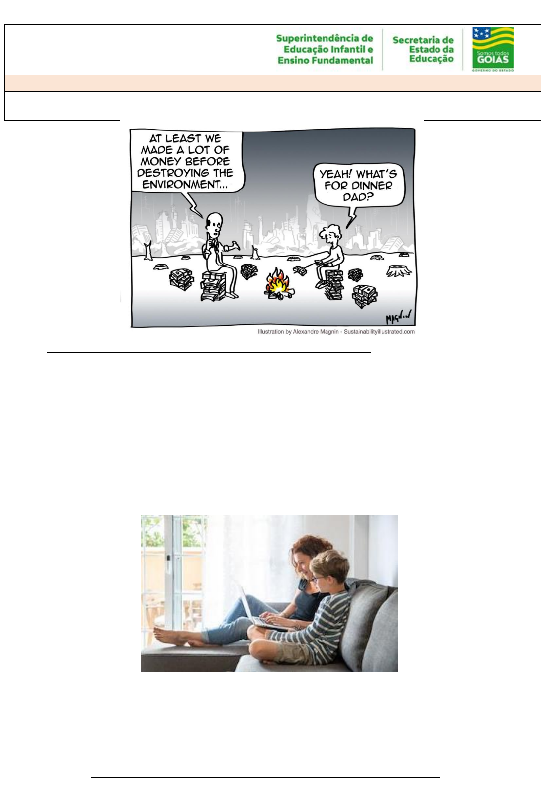 7º ANO LÍNGUA INGLESA ATIVIDADE 5 – REVISÃO DO 1º CORTE NOME: UNIDADE ESCOLAR: Disponível em: https://sustainabilityillustrated.com/en/2019/01/29/economy-vs-environment-cartoon/ Acesso em: 26 de mar. de 2020 1. Ao lermos os elementos não verbais e a linguagem verbal do cartum, observamos que o autor aborda um tema relevante para o nosso planeta. Identifique-o e estabeleça a relação existente entre a linguagem verbal e a não verbal. 2. Ao analisarmos a fala do pai “At least we made a lot of money before destroying the environment…”, observamos que ele utilizou o verbo “made”. Identifique o tempo verbal usado nessa frase e a intencionalidade do autor ao usar esse tempo verbal. 3. De acordo com a linguagem não verbal (expressão facial do garoto), observamos que ele está preocupado com algo. Identifique o motivo dessa preocupação. 4. Read the text and answer the questions. (Leia o texto e responda as perguntas.) Hello, my name’s Daniel. I live with my mom. Yesterday, she helped me with my homework. After that, we watched a great movie. When we were watching the movie, my grandmother called her. Disponível em: https://www.shutterstock.com/pt/image-photo/happy-mother-son-sitting-on-sofa-1296691297 Acesso em: 12 de fev. de 2021 https://sustainabilityillustrated.com/en/2019/01/29/economy-vs-environment-cartoon/ https://www.shutterstock.com/pt/image-photo/happy-mother-son-sitting-on-sofa-1296691297 a) Who does Daniel live with? b) Did his mom do his homework for him? c) Who called his mom? Disponível em: http://www.englishact.com.br/2018/02/tirinha-em-ingles-past-simple-e-past.html Acesso em 07 de abr.de 2020 5. No segundo quadrinho, a gatinha afirmou que a) ( ) teve um pesadelo com Garfield. b) ( ) teve um sonho com Garfield. c) ( ) viveu um desentendimento com Garfield. d) ( ) viveu momentos de alegria com Garfield. 6. A partir do terceiro quadrinho, a gatinha narra uma sequência de acontecimentos. Escreva um pequeno texto, em português, contando sobre esses acontecimentos. 7. Mark an X TRUE or FALSE according to the text. (Marque um X no verdadeiro ou falso de acordo com o texto. TRUE FALSE a) Garfield had a nightmare last night. b) A huge bear jumped out and attacked them. c) Garfield did not fight the bear off with his bare paws. http://www.englishact.com.br/2018/02/tirinha-em-ingles-past-simple-e-past.html%20Acesso%20em%2007