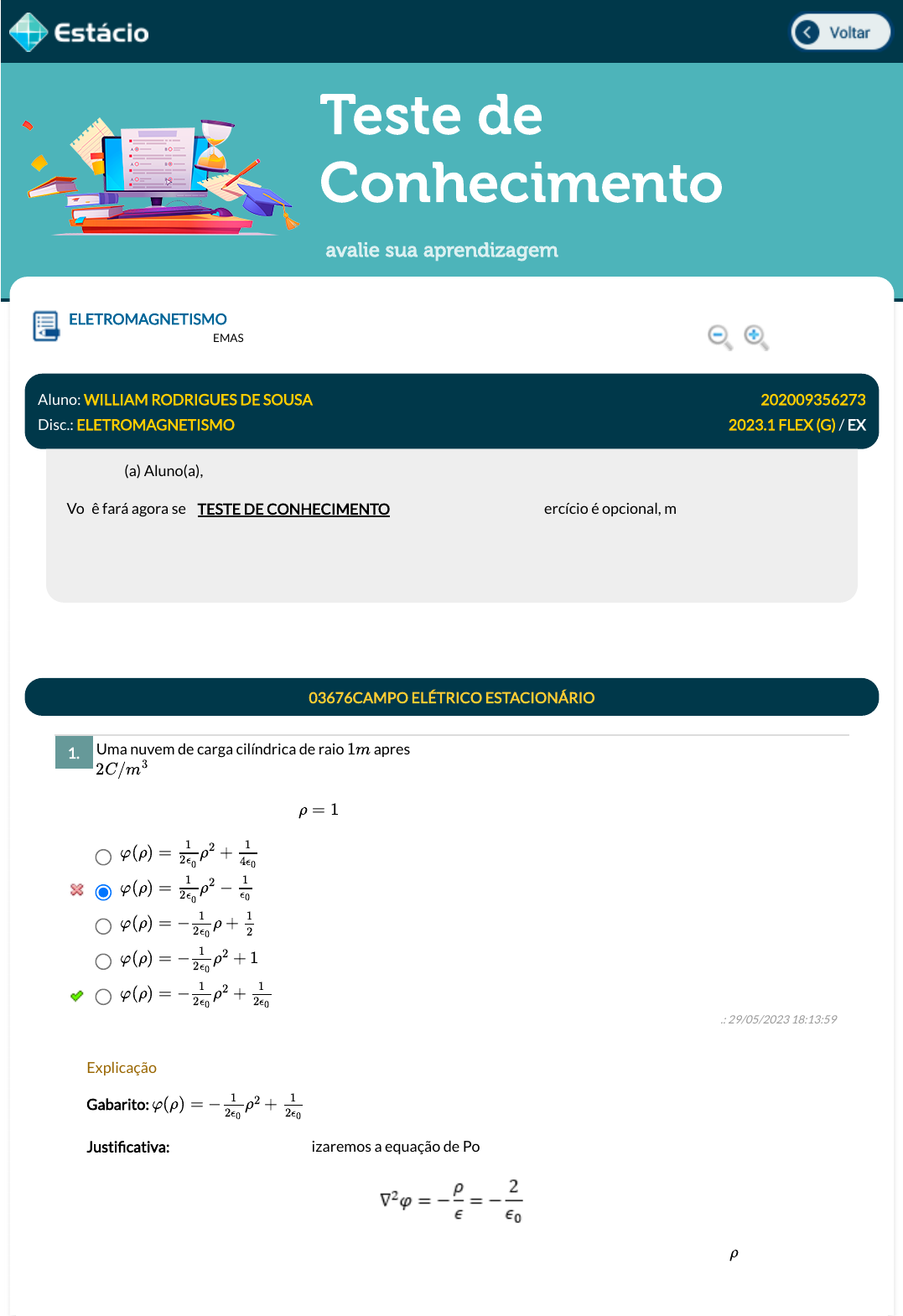 29/05/2023, 18:17 Estácio: Alunos https://simulado.estacio.br/alunos/ 1/8 Teste de Conhecimento avalie sua aprendizagem Uma nuvem de carga cilíndrica de raio apresenta uma densidade volumétrica de carga constante igual a . Esta nuvem está no ar. Determine a distribuição de potencial elétrico dentro da nuvem, considerando que só haverá variação do potencial com a distância ao eixo do cilindro. Considere como referência que o potencial elétrico na casca desta nuvem ( ) é nulo. ELETROMAGNETISMO Lupa DGT0246_202009356273_TEMAS Aluno: WILLIAM RODRIGUES DE SOUSA Matr.: 202009356273 Disc.: ELETROMAGNETISMO 2023.1 FLEX (G) / EX Prezado (a) Aluno(a), Você fará agora seu TESTE DE CONHECIMENTO! Lembre-se que este exercício é opcional, mas não valerá ponto para sua avaliação. O mesmo será composto de questões de múltipla escolha. Após responde cada questão, você terá acesso ao gabarito comentado e/ou à explicação da mesma. Aproveite para se familiarizar com este modelo de questões que será usado na sua AV e AVS. 03676CAMPO ELÉTRICO ESTACIONÁRIO 1. Data Resp.: 29/05/2023 18:13:59 Explicação: Gabarito: Justi�cativa: Dentro da nuvem utilizaremos a equação de Poisson. Pela simetria, utilizaremos coordenadas cilíndricas e o potencial dependerá apenas da coordenada , assim 1m 2C/m3 ρ = 1 φ(ρ) = ρ2 + 1 2ϵ0 1 4ϵ0 φ(ρ) = ρ2 − 1 2ϵ0 1 ϵ0 φ(ρ) = − ρ + 1 2ϵ0 1 2 φ(ρ) = − ρ2 + 1 1 2ϵ0 φ(ρ) = − ρ2 + 1 2ϵ0 1 2ϵ0 φ(ρ) = − ρ2 +1 2ϵ0 1 2ϵ0 ρ javascript:voltar(); javascript:voltar(); javascript:diminui(); javascript:aumenta(); 29/05/2023, 18:17 Estácio: Alunos https://simulado.estacio.br/alunos/ 2/8 Uma carga pontual de 2C é colocado dentro de um dielétrico com permissividade elétrica relativa de 60. Determine o módulo do campo de polarização, a uma distância r da carga. onde é uma constante real. onde também é uma constante real. Usando uma condição de contorno que para se tem . No eixo do cilindro, isso é, , o campo elétrico deve ser nulo. Em coordenadas cilíndricas dependendo apenas da coordenada Assim Somente com se obtém . Retornando a equação 2. k1 k2 r = 1 φ = 0 ρ = 0 ρ k1 = 0 → E (ρ = 0) = 0 φ(ρ) = − ρ2 + k1ln(ρ) + k2 = − ρ 2 + 1 2ϵ0 1 2ϵ0 1 2ϵ0 49 60πϵ0 1 r2 79 120πϵ0 1 r2 99 60πϵ0 1 r2 59 120πϵ0 1 r2 29/05/2023, 18:17 Estácio: Alunos https://simulado.estacio.br/alunos/ 3/8 Seja uma carga de -5C que se encontra �xa, no vácuo. Uma outra carga de -10C foi colocada em um ponto distante 8m da primeira. Determine que velocidade a carga que está livre terá no in�nito após se repelida pela primeira. A carga livre tem massa de 200g. Data Resp.: 29/05/2023 18:14:30 Explicação: Gabarito: Justi�cativa: O campo gerado por uma carga puntiforme no ar vale Se esta carga for colocada no isolante, que possui , o campo gerado será O módulo do campo de polarização (P), gerado pelas cargas de polarização da água: 3. Data Resp.: 29/05/2023 18:14:55 Explicação: Gabarito: Justi�cativa: Quando a carga for solta toda a energia potencial será convertida em cinética no in�nito, assim 99 120πϵ0 1 r2 59 120πϵ0 1 r2 ϵR = 60 105.104 m s 125.104 m s 75.104 m s 95.104 m s 45.104 m s 75.104 m s 29/05/2023, 18:17 Estácio: Alunos https://simulado.estacio.br/alunos/ 4/8 Dois condutores retilíneos, de tamanho 1 m, paralelos entre si, se encontram no ar a uma distância 1m. Os dois condutores são atravessados por uma corrente de 2A com sentidos contrários. Determine a força que surge entre os condutores. Determine potencial vetor magnético gerado por um �o de comprimento 6m, percorrido por uma corrente A, em um ponto P a uma distância 4m do �o, localizado na metade do �o. 03677CAMPO MAGNÉTICO ESTACIONÁRIO 4. de atração de atração de repulsão de repulsão de atração Data Resp.: 29/05/2023 18:15:15 Explicação: O condutor 1 com corrente 1A produz um campo magnético a uma distância D dado por Usando a regra da mão direita a direção de FM será da direita para esquerda, sendo de repulsão. 5. Data Resp.: 29/05/2023 18:15:26 Explicação: Considerar comprimento 2L. Vamos colocar o condutor no eixo z e a metade do condutor na origem. Assim o ponto P estará localizado sobre o eixo y. N 2μ0 π N μ0 π N 2μ0 π N μ0 π N 4μ0 π 16π 43ln(9)ẑ(T .m) 4μ0 ln(3)ẑ(T .m) 2μ0 ln(2)ẑ(T .m) 4μ0 ln(4)ẑ(T .m) 4μ0 ln(5)ẑ(T .m) 29/05/2023, 18:17 Estácio: Alunos https://simulado.estacio.br/alunos/ 5/8 Determine a densidade de corrente em um ponto P (X,Y,Z) = (1, 1, 2) , com coordenadas medidas em m, que se encontra em uma região que possui um campo magnético, medido em A/m, . Como o condutor está no eixo z teremos . Cada elemento , localizado em um ponto (0, 0, z), apresenta uma distância r ao ponto P. Usando a tabela de integral: Então: Substituindo valores: L = 3m, ρ=4m e I = 16π A 6. Data Resp.: 29/05/2023 18:15:38 Explicação: Id→L = Idzẑ ld→L →H(x, y, z) = yz2x̂ = 4x2yŷ + yx3ẑ 6x̂ − ŷ + ẑ (A/m2) x̂ + 4ŷ + ẑ (A/m2) x̂ − ŷ − ẑ (A/m2) x̂ + ŷ + 4ẑ (A/m2) 6x̂ + ŷ + 6ẑ (A/m2) 29/05/2023, 18:17 Estácio: Alunos https://simulado.estacio.br/alunos/ 6/8 A fem pode ser descrita como a diferença de potencial. Ela pode receber duas denominações, quando é induzida pela variação do módulo do campo magnético é chamada de: Existem quatro equações de Maxwell que descrevem fenômenos eletromagnéticos. Marque a alternativa que apresenta uma lei que não faz parte das quatro equações de Maxwell. 03678CAMPOS VARIANTES NO TEMPO E EQUAÇÕES DE MAXWELL 7. fem de capacidade. fem de variação. fem de transformação. fem de movimento. fem de intensidade. Data Resp.: 29/05/2023 18:16:02 Explicação: fem de transformação Quando a fem é induzida pela variação do módulo do campo magnético, ela é denominada fem de transformação. fem de movimento Quando a fem é induzida pela variação da área ou do ângulo entre a 
