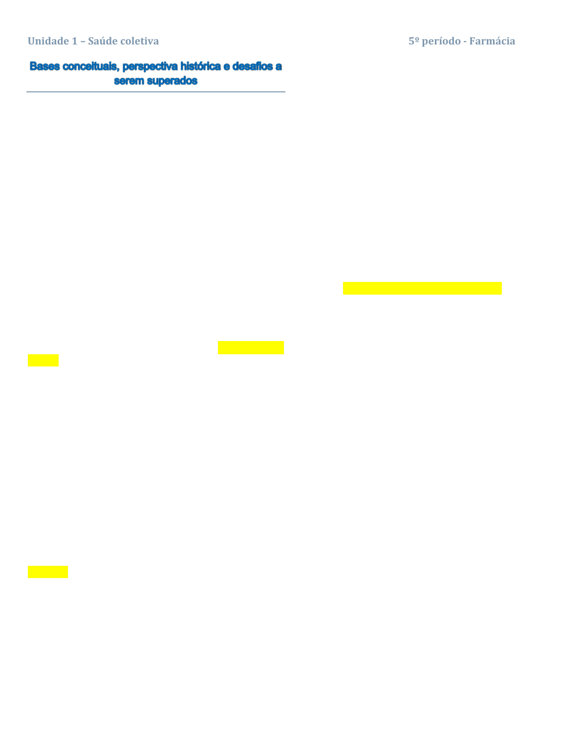 Unidade 1 – Saúde coletiva 5º período - Farmácia 1 Apresentação A saúde coletiva, como uma área de atuação interdisciplinar e multiprofissional, possui o desafio de desenvolver soluções que integrem diferentes profissionais com a mesma premissa: a de considerar sempre o ser humano além de sua doença, analisando cada indivíduo como um ser único e especial, o qual está conectado a aspectos familiares, econômicos, culturais e sociais. Agora, lhe convido a estudar e compreender melhor essa área tão importante para a sociedade que é a saúde coletiva. Introdução e alguns conceitos básicos O sistema de saúde brasileiro vem passando, como era de se esperar, por mudanças e readequações. Estas transformações foram e são essenciais para que seja possível enfrentar os desafios que surgem continuamente e que acompanham o crescimento populacional e o desenvolvimento do país. É importante ressaltar que a definição de saúde, um termo que inicialmente configurava-se como sinônimo da ausência de doença, passou a ser mais ampla, levando também em consideração aspectos relacionados ao bem-estar físico, psíquico e social de cada indivíduo. Um dos grandes marcos na história da construção política da saúde pública brasileira foi a criação do Sistema Único de Saúde, o SUS, em 1988. O SUS é um sistema reconhecido internacionalmente como um dos programas de saúde pública mais completos a nível global, uma vez que suas diretrizes asseguram o acesso a saúde a todos os cidadãos (princípio da universalidade), nos diferentes níveis de atenção e complexidade (princípio da integralidade). Embora o SUS tenha ampliado o acesso à saúde, muitos problemas ainda persistem, e um dos desafios enfrentados atualmente pelo país é o de desenvolver programas de intervenção em saúde que sejam sensíveis e efetivos no que tange à realidade das diversas categorias populacionais. É importante ressaltar que o Brasil possui um vasto território, fortemente marcado por contrastes econômicos e pela presença de grande desigualdade social. Frente às características, deficiências e necessidades da saúde brasileira, destaca-se o desenvolvimento dos programas em saúde coletiva. Para melhor compreensão da situação atual do sistema de saúde vigente, assim como dos programas de saúde coletiva, é necessário retroceder e levar em consideração as mudanças que ocorreram na maneira da sociedade pensar e conceituar o processo saúde- doença. Para isso, é importante revisitar alguns aspectos significativos e que remetem à época do Brasil colonial. História das políticas públicas de saúde no Brasil As políticas de saúde no Brasil foram desenvolvidas em consonância com o momento histórico e a situação econômica do país. Durante o período colonial, os cuidados com a saúde, de modo geral, eram muito limitados, e quando alguém necessitava de assistência, esta restringia-se à indivíduos sem formação profissional específica, como curandeiros que utilizavam ervas, crenças religiosas e técnicas empíricas como forma de tratamento. Foi somente em 1808, com a vinda da família real, que as primeiras mudanças nesse sentido começaram a ocorrer. A chegada da família real ao Brasil suscitou a necessidade da implantação de uma estrutura sanitária básica, capaz de atender a corte que se instalava no Rio de Janeiro. A falta de saneamento representava um risco à saúde e vida da família real, uma vez que as más condições sanitárias da cidade propiciavam o desenvolvimento e o contágio de pestes e doenças graves, como a malária e a varíola, por exemplo. Foi no mesmo ano da chegada da família real que se instituiu a primeira faculdade de medicina do Brasil; fato este que contribuiu para que a medicina empírica fosse lentamente substituída por uma medicina baseada na ciência. Todavia, apesar do crescente número de profissionais da área médica que o país ganhava, o acesso à saúde nessa época se restringia à parcela da população que possuía condições financeiras superiores. Os demais contavam apenas com filantropia e hospitais de caridade, mantidos na maioria das vezes pela Igreja. É importante ressaltar que a assistência relacionada à saúde nessa época restringia-se ao tratamento de doenças. Não havia, até então, programas de saúde coletiva, campanhas de educação em saúde para conscientizar a população sobre a prática de hábitos saudáveis e, tampouco, ações de promoção à saúde e de prevenção de doenças. Esse fato pode ser explicado pelo conceito simplista vigente nessa época, que definia saúde como a mera ausência de doença, sem levar em consideração aspectos psíquicos, sociais, culturais e econômicos, conforme afirma Lopes em seu livro Políticas de saúde pública, de 2017. Educação em saúde: da prevenção à promoção Durante muito tempo, o sistema de saúde brasileiro se preocupou apenas em tratar e curar doenças. Unidade 1 – Saúde coletiva 5º período - Farmácia 2 Expressões como prevenção, promoção e educação em saúde simplesmente não faziam parte das pautas de políticas públicas. A chamada Revolta da Vacina (Figura 1) é considerada um marco de transição entre uma medicina exclusivamente curativa para a implementação de uma medicina preocupada em garantir a saúde da população como um todo. O termo "prevenção" pode ser entendido como uma ação prévia que tem como objetivo impedir o desenvolvimento e evolução de determinada doença. Uma das primeiras ações de caráter preventivo no Brasil foi a vacinação em massa da população contra a varíola, em 1904. O responsável por coordenar essa ação foi o médico Oswaldo Cruz, que, embora tenha tido boas intenções ao propor a imunização da população, não foi bem-visto pela sociedade na época. Um dos motivos para isto foi o fato de que nenhuma campanha educativa sobre os benefícios da vacinaç