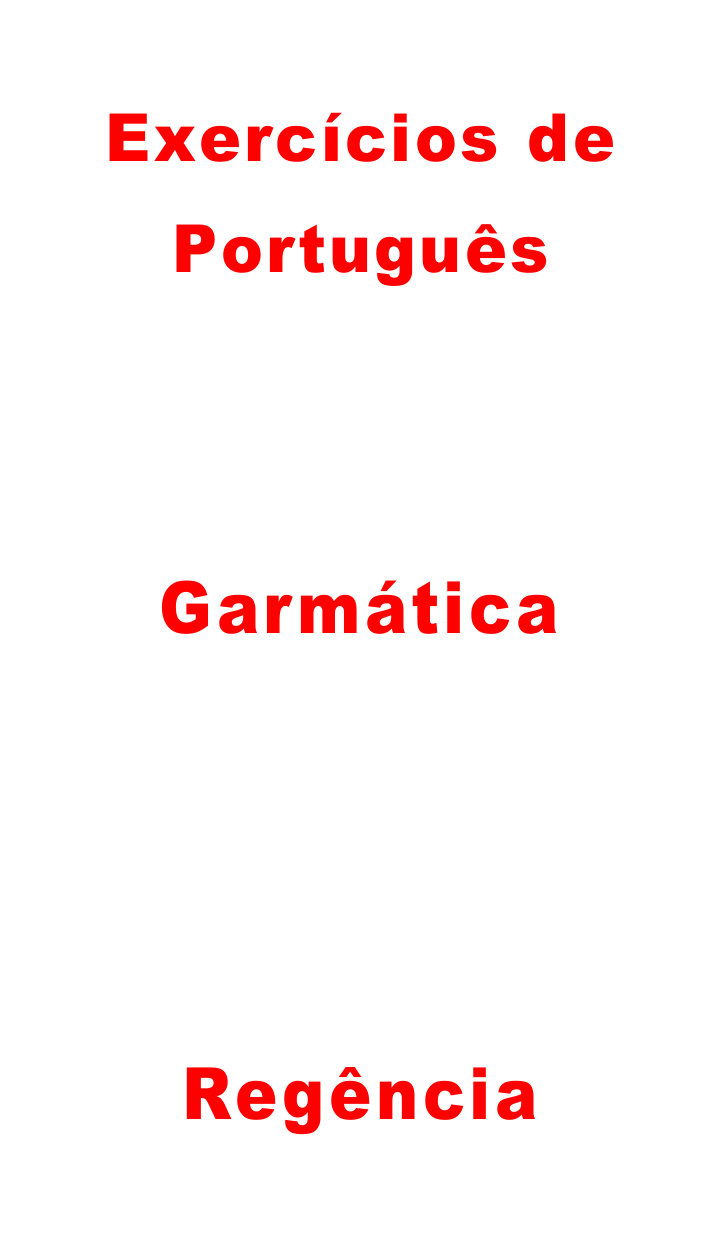 GOSTARIA DE BAIR Exercícios de Português Garmática Regência BR/ PRODUTOS Exercícios com Gabarito de Português Sintaxe - Regência 1) (ITA-2002) Leia com atenção a seguinte frase de um letreiro publicitário: Esta é a escola que os pais confiam. A) Identifique a preposição exigida pelo verbo e refaça a a) de que, cuja, para que, com os quais, sobre que, em que. b) que, de cuja, com que, para quem, no qual, que. c) em que, cuja, de que, para os quais, onde, na qual. d) a que, a cuja, em que, com que, que, em que. e) a que, a cuja, por que, com quem, sobre o qual, onde. 5) (FGV-2002) Assinale a alternativa que completa corretamente as lacunas da frase: construção, obedecendo à norma gramatical. “Eu encontrei ontem, mas não reconheci B) Justifique a correção. 2) (ITA-2002) O Programa Mulheres está mudando. Novo cenário, novos apresentadores, muito charme, mais informação, moda, comportamento e prestação de serviços. Assista amanhã, a revista eletrônica feminina que porque anos que não a) lhe, lhe, há, lhe. b) o, o, haviam, o. c) lhe, o, havia, lhe. d) o, lhe, haviam, o. e) o, o, havia, o. via.” é a referência do gênero na TV. O verbo “assistir”, empregado em linguagem coloquial, está em desacordo com a norma gramatical. a) Reescreva o último período de acordo com a norma. b) Justifique a correção. 3) (Fuvest-2002) A frase que está de acordo com a norma escrita culta é: a) O colégio onde estudei foi essencial na construção de grande parte dos valores que acredito. b) Acho que esta acusação é uma das tantas coisas ridículas que sou obrigado a me defender. c) Há uma sensação que tudo, ou quase tudo, vai ser diferente. d) A boa escola seria a que submetesse seus alunos à maior quantidade de experimentações e pesquisas. e) Nós já estamos próximos de um consenso que o atual modelo está falido. 4) (FGV-2002) Escolha a alternativa que preencha corretamente as lacunas das frases abaixo. 6) (Fuvest-2001) A única frase que NÃO apresenta desvio em relação à regência (nominal e verbal) recomendada pela norma culta é: a) O governador insistia em afirmar que o assunto principal seria “as grandes questões nacionais”, com o que discordavam líderes pefelistas. b) Enquanto Cuba monopolizava as atenções de um clube, do qual nem sequer pediu para integrar, a situação dos outros países passou despercebida. c) Em busca da realização pessoal, profissionais escolhem a dedo aonde trabalhar, priorizando à empresas com atuação social. d) Uma família de sem-teto descobriu um sofá deixado por um morador não muito consciente com a limpeza da cidade. e) O roteiro do filme oferece uma versão de como conseguimos um dia preferir a estrada à casa, a paixão e o sonho à regra, a aventura à repetição. 7) (ITA-1996) Assinale a opção que completa corretamente as lacunas das frases a seguir: I - Saíram daqui pouco, mas voltarão daqui pouco, pois moram apenas _dois quilômetros de distância. 1. Por acaso, não é este o livro o professor se II- _foram suas amigas? estarão agora? refere? 2. As Olimpíadas abertura assistimos foram as de Tóquio. 3. Herdei de meus pais os princípios morais tanto luto. 4. É bom que você conheça antes as pessoas vai trabalhar. 5. A prefeita construirá uma estrada do centro ao morro será construída a igreja. 6. Ainda não foi localizada a arca os piratas guardavam seus tesouros. a) há - a - a - Aonde - Onde b) há - há - à - Onde - Onde c) há - a - a - Aonde - Aonde d) a - a - à - Para onde - Por onde e) a - há - há - Por onde - Aonde 8) (Gama Filho-1997) A peça de teatro assistiremos é de um autor nome não me lembro, mas seu estilo é semelhante aludimos ontem. Preenche corretamente as lacunas acima a opção: a) a que / de cujo / àquele / a que b) a que / cujo / aquele / a que c) à que / cujo / a aquele / de que d) que / de cujo / àquele / que e) que / cujo o / aquele / à que 9) (FGV-2001) Assinale, abaixo, a alternativa em que a ordem das preposições complete adequadamente as lacunas. O automóvel cujas rodas falei já foi vendido. O terreno cuja compra me referi foi vendido ontem. É uma empresa cujas reuniões participo. A encomenda cujo portador eu esperava, chegou atrasada. Esta é uma firma cujos produtos trabalho. a) De / a / de / por / com. b) Em / de / a / com / com. c) De / a / a / por / com. d) A / com / a / sobre / de. e) Por / ante / contra / para / perante. 10) (Mack-2001) É preciso casar João, é preciso suportar Antônio, é preciso odiar Melquíades, é preciso substituir nós todos. É preciso salvar o país, é preciso crer em Deus, é preciso pagar as dívidas, é preciso comprar um rádio, é preciso esquecer fulana. Assinale a alternativa correta. a) É preciso introduz uma oração reduzida com função de sujeito em todos os versos. b) O verbo no infinitivo rege objeto direto em todos os versos. c) Substituindo-se as dívidas (verso 7) por os credores mantém-se corretamente a regência verbal. d) Substituindo-se esquecer (verso 9) por esquecer-se mantém-se corretamente a regência verbal. e) A oração salvar o país (verso 5) pode ser substituída corretamente por que o país seje salvo. 11) (Cesgranrio-1994) Indique a alternativa que completa, respectivamente, as lacunas das frases a seguir, de acordo com a norma culta. I - É uma situação nunca nos esqueceremos. II - A situação chegamos é ímpar. III - A reportagem, teor discordei, foi censurada. IV - É uma revelação _os fatos merecem uma análise detalhada. V - É uma situação _se deve evitar. a) que/ em que/ de cujos/ cujos/ que b) da qual/ a que/ cujo/ que/ por que c) de que/ a que/ cujo/ cujos/ que d) da qual/ em que/ cujo/cujos/ a que e) de que/ a que/ de cujo/em que/ que 12) (FEI-1994) Assinalar a alternativa que completa corretamente as lacunas das seguintes frases: I. As flores aroma tanto gosto, são efêmeras. II. Este foi o motivo não lhe telefonei antes. III. A pesquisa me ref