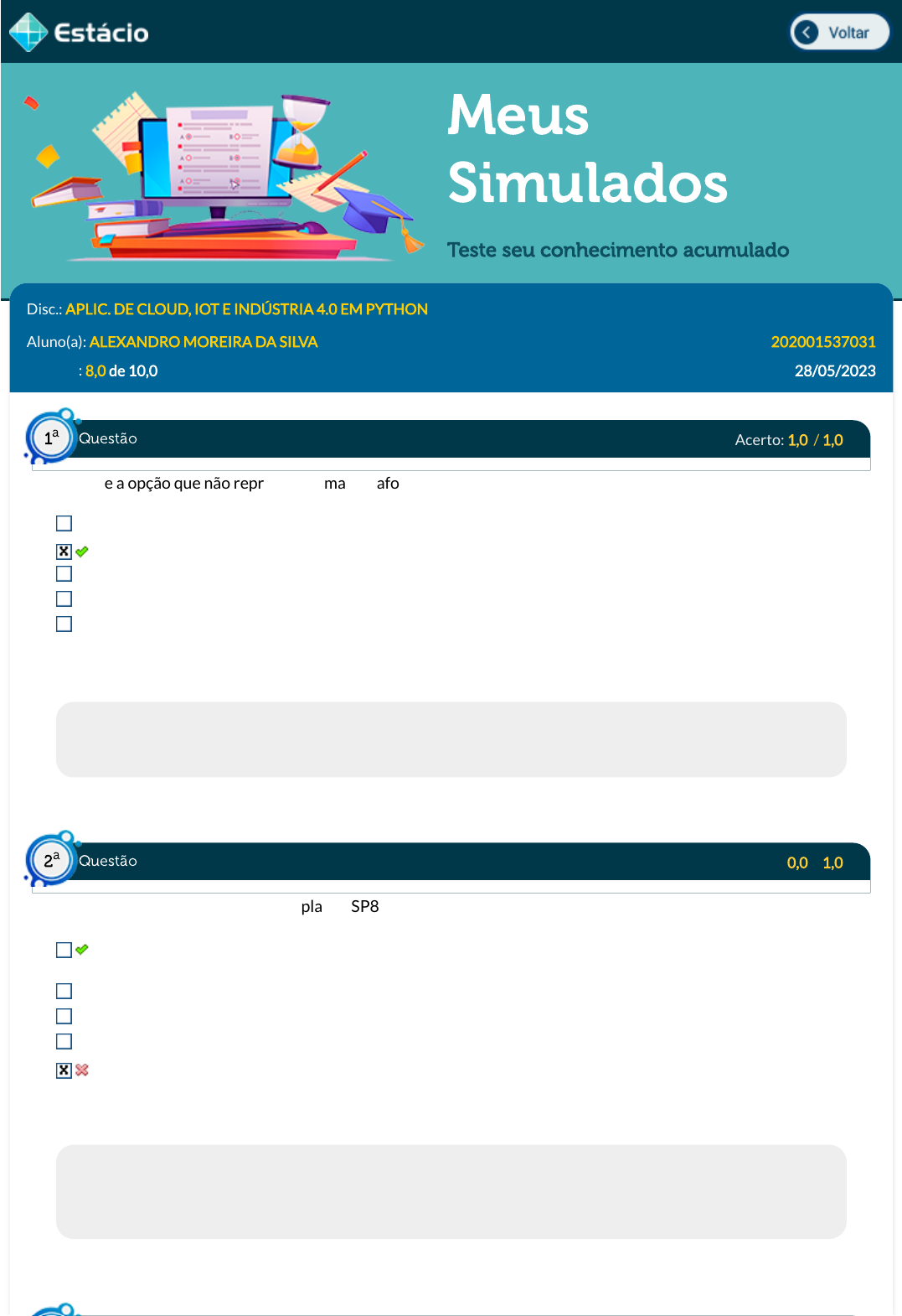 29/05/2023 20:47 Estácio: Alunos https://simulado.estacio.br/bdq_simulados_avaliacao_parcial_resultado.asp?cod_hist_prova=309707896&cod_prova=6357384467&f_cod_disc= 1/5 Meus Simulados Teste seu conhecimento acumulado Disc.: APLIC. DE CLOUD, IOT E INDÚSTRIA 4.0 EM PYTHON Aluno(a): ALEXANDRO MOREIRA DA SILVA 202001537031 Acertos: 8,0 de 10,0 28/05/2023 Acerto: 1,0 / 1,0 Marque a opção que não representa uma plataforma de IoT: Salesforce IoT Cloud Arduino NANO 33 IoT IBM Watson IoT platform Arduino Cloud IoT Cisca IoT Cloud connect Respondido em 28/05/2023 06:01:50 Explicação: Resposta correta: Arduino NANO 33 IoT Acerto: 0,0 / 1,0 Assinale a opção incorreta sobre a placa ESP8266. Foi completamente remodelada, dando origem à placa ESP8285, que, apesar das novas funcionalidades, tem um tamanho maior. Sua evolução, o ESP32, possui 4MB de memória e vem com wi-� e Bluetooth embutidos. Pode ser programado por meio de um Arduino via �rmware AT. Possui um processador RISK denominado Tensilica. Possui capacidade de comunicação wi-� nativa. Respondido em 28/05/2023 06:25:32 Explicação: Resposta correta: Foi completamente remodelada, dando origem à placa ESP8285, que, apesar das novas funcionalidades, tem um tamanho maior. Questão1 a Questão2 a https://simulado.estacio.br/alunos/inicio.asp javascript:voltar(); 29/05/2023 20:47 Estácio: Alunos https://simulado.estacio.br/bdq_simulados_avaliacao_parcial_resultado.asp?cod_hist_prova=309707896&cod_prova=6357384467&f_cod_disc= 2/5 Acerto: 1,0 / 1,0 O XMPP é um protocolo aberto que é baseado em XML, desenvolvido originalmente para mensagens instantâneas e informação de presença formalizado pelo IETF. A unidade mais básica de comunicação do XMPP é chamada de stanza. A respeito dos tipos de stanza do XMPP, selecione a opção correta: < presence / >: é um mecanismo usado pelas entidades que se inscreveram a uma determinada entidade para receber informações sobre ela. < req / >: é um mecanismo responsável pela requisição de assinatura das entidades em relação a determinados tópicos. < iq / > : é um mecanismo do tipo publicação-assinatura semelhante em alguns aspectos ao HTTP. < ack / >: é um mecanismo de aceitação da inscrição de entidades em relação a outras entidades da rede. < mensage / >: é um mecanismo que trata do conteúdo da mensagem garantindo a proteção através de algoritmos de criptogra�a. Respondido em 28/05/2023 06:27:59 Explicação: Resposta correta: < presence / >: é um mecanismo usado pelas entidades que se inscreveram a uma determinada entidade para receber informações sobre ela. Acerto: 1,0 / 1,0 Existem diversas plataformas para desenvolvimento de projetos de IoT. Cada uma dessas plataformas possui características que vão desde o tempo de resposta a eventos, gerenciamento de dados, segurança e custos, que devem ser consideradas para a escolha de plataforma especí�ca. A ThingsBoard é uma dessas plataformas que, entre outras características, possui código aberto. Em relação à plataforma ThingsBoard, selecione a opção CORRETA: É gratuito para uso pessoal, mas deve ser paga quando o uso for comercial. É disponível para a maioria das distribuições do Linux, mas não para o Windows. É uma plataforma do lado do servidor de código aberto que permite monitorar e controlar seus dispositivos IoT. Ela precisa de aplicações de terceiros para fazer a integração entre dispositivos e aplicações WEB. Utiliza os protocolos CoAP, XMPP, HTTP. Respondido em 28/05/2023 06:33:32 Explicação: Resposta correta: É uma plataforma do lado do servidor de código aberto que permite monitorar e controlar seus dispositivos IoT. Acerto: 1,0 / 1,0 O NodeMCU pode ser programado em diversas linguagens de programação. Essa característica é uma vantagem, pois aumenta as possibilidades de utilização de recursos de uma determinada linguagem. Em relação às linguagens de programação que podem ser utilizadas para desenvolver projetos no NodeMCU, selecione a opção correta. A linguagem de programação Basic é uma opção para desenvolver projetos do NodeMCU. As IDEs recomendadas para uso são Esp8266 BASIC e ZBasic para ESP8266. Questão3 a Questão4 a Questão5 a 29/05/2023 20:47 Estácio: Alunos https://simulado.estacio.br/bdq_simulados_avaliacao_parcial_resultado.asp?cod_hist_prova=309707896&cod_prova=6357384467&f_cod_disc= 3/5 Os projetos do NodeMCU são aplicados para Internet das Coisas. Portanto, a linguagem de programação adequada é o JavaScript. Não há recomendação de nenhuma IDE, dado que são projetos de uso geral. A linguagem Python é a escolha ideal para desenvolver projetos no NodeMCU, uma vez que se trata de uma linguagem de uso geral e bem documentada. Apesar de ter sido desenvolvido inicialmente na linguagem de programação Lua, ela não é mais suportada pelas placas do NodeMCU. Projetos do NodeMCU podem ser implementados na linguagem de programação C. Não há uma IDE recomendada, uma vez que C é a linguagem padrão do NodeMCU. Respondido em 28/05/2023 06:34:17 Explicação: Resposta correta: A linguagem de programação Basic é uma opção para desenvolver projetos do NodeMCU. As IDEs recomendadas para uso são Esp8266 BASIC e ZBasic para ESP8266. Acerto: 0,0 / 1,0 Os Shields do Arduino fazem parte do seu ecossistema. Selecione a opção correta com um modo equivalente de de�ni-los. Periféricos extras IDE Arduino Outros Arduinos Módulos adicionais Módulos de conectividade Respondido em 28/05/2023 06:24:27 Explicação: Resposta correta: Módulos adicionais Acerto: 1,0 / 1,0 Qual área da inteligência arti�cial é mais usada na indústria? Reconhecimento de padrões Programação embarcada Lógica difusa Algoritmos genéticos Tradução automática Respondido em 28/05/2023 06:24:19 Explicação: Resposta correta: Reconhecimento de padrões Acerto: 1,0 / 1,0 Questão6 a Questão7 a Questão 8 a 29/05/2023 20:47 Estácio: Alunos https://s