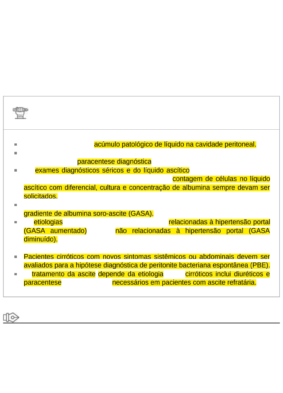 30 Ascite Rodrigo Antonio Brandão Neto Hassan Rahhal Fernando Salvetti Valente PONTOS IMPORTANTES Ascite é definida como acúmulo patológico de líquido na cavidade peritoneal. Todos os pacientes com ascite no exame físico sem diagnóstico etiológico devem ser submetidos à paracentese diagnóstica. Os exames diagnósticos séricos e do líquido ascítico devem ser solicitados de acordo com as hipóteses diagnosticas, embora contagem de células no líquido ascítico com diferencial, cultura e concentração de albumina sempre devam ser solicitados. Um dos passos mais importantes na avaliação de uma ascite é a realização do gradiente de albumina soro-ascite (GASA). As etiologias da ascite podem ser divididas em relacionadas à hipertensão portal (GASA aumentado) e em não relacionadas à hipertensão portal (GASA diminuído). As causas de ascite devem ser investigadas em uma sequência objetiva e custo-efetiva. Pacientes cirróticos com novos sintomas sistêmicos ou abdominais devem ser avaliados para a hipótese diagnóstica de peritonite bacteriana espontânea (PBE). O tratamento da ascite depende da etiologia e em cirróticos inclui diuréticos e paracentese, que podem ser necessários em pacientes com ascite refratária. INTRODUÇÃO E DEFINIÇÕES Ascite é definida como acúmulo patológico de líquido na cavidade peritoneal. A origem do termo vem do grego askites, que significa saco ou bolsa. Pode ocorrer por múltiplas causas, incluindo neoplasia maligna; no entanto, a relação entre cirrose e ascite é extremamente importante. Cirrose Otávio Barcelos Destacar Otávio Barcelos Destacar Otávio Barcelos Destacar Otávio Barcelos Destacar Otávio Barcelos Destacar hepática é responsável por 85% das ascites, e ascite está presente em 30% dos pacientes cirróticos no diagnóstico, ocorrendo em 58% dos restantes nos próximos 10 anos ou 5 a 10% de incidência ao ano. A presença de ascite em pacientes cirróticos é associada com mortalidade de 15% em 1 ano e 44% em 5 anos. O diagnóstico de ascite tem sido complicado recentemente pela epidemia de obesidade no mundo, e a sensibilidade do exame físico para detecção de ascite é relativamente baixa, variando entre 50 e 94%, com especificidade de 30 a 80%. ETIOLOGIA E FISIOPATOLOGIA A cirrose hepática, como já pontuado, é a principal causa de ascite. Outras causas de ascite são resumidas na Tabela 1. ▷ TABELA 1 Principais causas de ascite Etiologia Frequência Cirrose hepática 81-85% Neoplasias malignas 10% Insuficiência cardíaca 3-5% Tuberculose 1,6-5% Diálise 1% Doença pancreática 1% Outras causas 2% O aparecimento de ascite no paciente cirrótico é o evento final de uma série de alterações anatômicas, fisiológicas e bioquímicas. A presença de hipertensão portal é uma condição essencial para aparecimento da ascite. Pressão portal maior do que 12 mmHg é necessária para que ocorra retenção de líquido, e a reversão da hipertensão portal pode levar ao desaparecimento da ascite. Otávio Barcelos Destacar Otávio Barcelos Destacar Otávio Barcelos Destacar Otávio Barcelos Destacar Otávio Barcelos Destacar Otávio Barcelos Destacar Otávio Barcelos Destacar Otávio Barcelos Destacar Otávio Barcelos Destacar Otávio Barcelos Destacar Otávio Barcelos Destacar Otávio Barcelos Destacar Otávio Barcelos Destacar Otávio Barcelos Destacar Otávio Barcelos Destacar Otávio Barcelos Destacar Otávio Barcelos Destacar A partir do aparecimento da hipertensão portal, mudanças importantes na circulação esplâncnica ocorrem, como a abertura de colaterais portossistêmicos que servem de shunts nessa circulação. Além disso, ocorre aumento da circulação de mediadores inflamatórios e produtos de origem bacteriana. Essas alterações são secundárias a um supercrescimento bacteriano intraluminal, aumento da permeabilidade capilar e translocação bacteriana. A presença de shunts portossistêmicos, associada à diminuição da capacidade hepática de metabolização desses mediadores, leva a um processo de vasodilatação esplâncnica, e ocorre o que chamamos de circulação hiperdinâmica do paciente cirrótico, com aumento de débito cardíaco, diminuição da resistência vascular periférica e da pressão arterial. Haverá, então, diminuição do volume circulante efetivo com consequente ativação de barorreceptores e sistemas vasoativos, com aumento da produção de norepinefrina, endotelina, prostaglandinas, vasoconstritores e ativação do sistema renina-angiotensina e produção de ADH, que diminuirão a perfusão renal, causarão retenção líquida e aparecimento da síndrome hepatorrenal e ascite. Classicamente duas teorias foram criadas para explicar o aparecimento da ascite nesses pacientes, underfilling e overflow. Na teoria do underfilling, a pressão portal aumentada levaria ao extravasamento de fluido, e a hipovolemia resultante levaria a ativação do sistema renina- angiotensina-aldosterona, responsável por retenção de sódio e água, aumento do volume plasmático e da pressão portal. A teoria do overflow propõe que o evento primário seja a retenção de sódio e água, expansão plasmática e aumento da pressão portal com extravasamento líquido. As duas teorias parecem contribuir para o aparecimento da cirrose em diferentes momentos, mas o mecanismo fisiopatológico mais aceito é a combinação de ambas associadas à vasodilatação generalizada que ocorre nesses pacientes. Há evidências mais recentes de que o volume circulante efetivo nesses pacientes se encontra diminuído, e há ativação do sistema renina-angiotensina-aldosterona. Além disso, em estágios mais avançados, o aumento da secreção do hormônio antidiurético parece apresentar papel preponderante para o acúmulo de líquido na cavidade abdominal. Novas Otávio Barcelos Destacar Otávio Barcelos Destacar Otávio Barcelos Destacar Otávio Barcelos Destacar Otávio Barcelos Destacar Otávio Bar