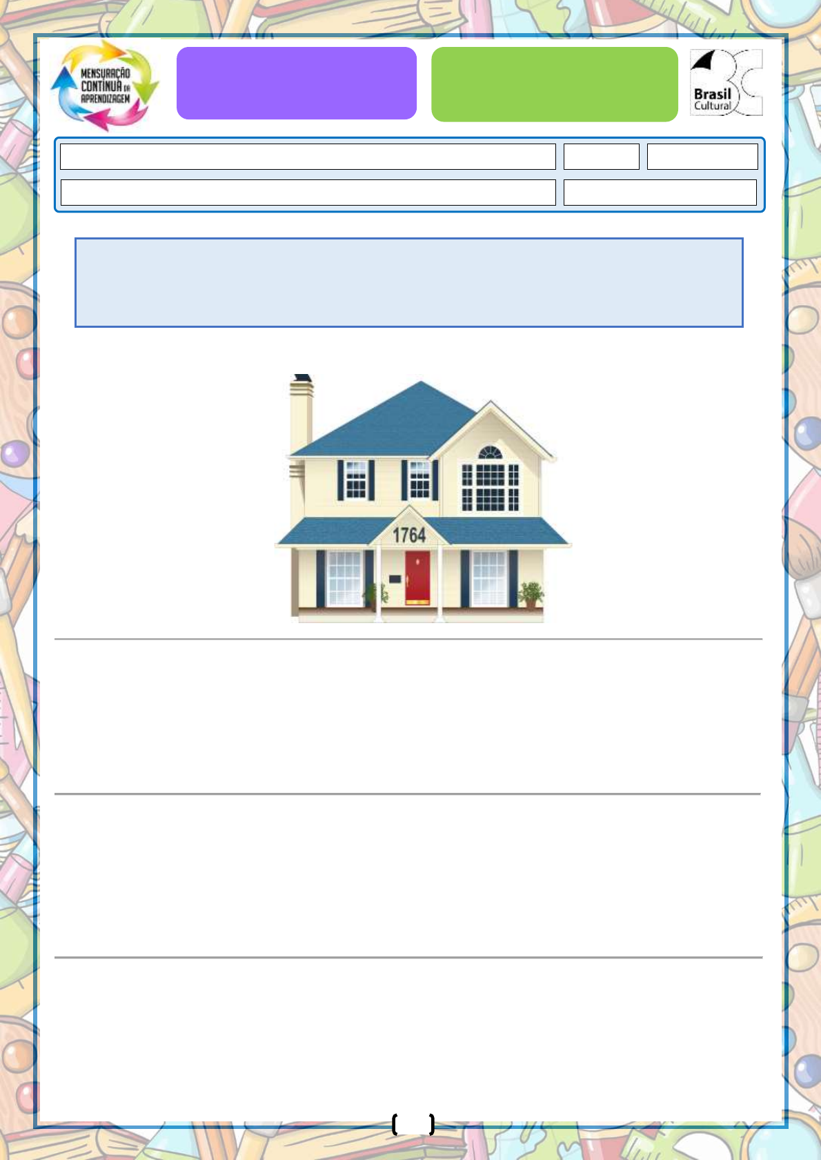 0 MATEMÁTICA 5º ano MENSURAÇÃO DE INGRESSO - 2022 EF02LP02 e EF02LP03 1 Vovó Geralda e vovô Sebastião moram na praia. Sara, Carlinhos, sua mãe Ana e seu pai Miguel foram passar alguns dias das férias de fim de ano na casa da vovó Geralda e do vovô Sebastião. Observe abaixo o número da casa da vovó Geralda e do vovô Sebastião e responda às questões 1 a 4. 1. (EF04MA02) O algarismo que ocupa a ordem das centenas é (A) 1. (B) 4. (C) 6. (D) 7. 2. (EF04MA02) O algarismo de menor valor é (A) 1. (B) 4. (C) 6. (D) 7. 3. (EF04MA02) O maior algarismo é (A) 1. (B) 4. (C) 6. (D) 7. NOME: ESCOLA: ANO: 5º Nº: DATA: D ep o si tp ho to s / P lu m e P lo u m e 0 MATEMÁTICA 5º ano MENSURAÇÃO DE INGRESSO - 2022 EF02LP02 e EF02LP03 2 4. (EF04MA02) A decomposição do número da casa da vovó Geralda pode ser (A) 100 + 70 + 64. (B) 100 + 700 + 64. (C) 1 000 + 700 + 64. (D) 1 000 + 70 + 60 + 4. 5. (EF04MA11) Veja na reta numérica abaixo os números das casas dos vizinhos da vovó Geralda. ____________________________________________________________________ 1 760 1 762 1 764 ? 1 768 De acordo com a sequência na reta numérica, o número da casa que está faltando é (A) 1 763. (B) 1 765. (C) 1 766. (D) 1 767. 6. (EF04MA01) Sara está jogando trilha com seu irmão Carlinhos. Carlinhos está parado no número 59 e ao jogar o dado, saiu o número 6. Com isso, Carlinhos deve andar 6 casas para frente. 55 56 57 58 59 60 61 62 63 64 65 66 Carlinhos chegará no número (A) 63. (B) 64. (C) 65. (D) 66. D ep o si tp ho to s / M a cr o ve to r 0 MATEMÁTICA 5º ano MENSURAÇÃO DE INGRESSO - 2022 EF02LP02 e EF02LP03 3 7. (EF04MA17) O dado lembra o cubo. Qual das figuras abaixo representa a planificação do cubo? (A) (C) (B) (D) 8. (EF04MA02) Carlinhos coleciona figurinhas de jogadores de futebol. Vovô Sebastião deu algumas figurinhas para Carlinhos. Observe abaixo o ábaco com a representação da quantidade de figurinhas de Carlinhos. Qual a quantidade de figurinhas da coleção de Carlinhos? (A) 1 352. (B) 1 523. (C) 2 315. (D) 2 531. D ep o si tp ho to s / T uu lij u m a la D ep o si tp ho to s / B lu e rin gm ed ia 0 MATEMÁTICA 5º ano MENSURAÇÃO DE INGRESSO - 2022 EF02LP02 e EF02LP03 4 9. (EF04MA11) Vovô Sebastião fez aniversário, e a data foi comemorada com muita alegria. Observe a reta numérica abaixo e descubra a idade do vovô. ______________________________________________ 20 40 60 ___ 100 Vovô completou (A) 50 anos. (B) 70 anos. (C) 80 anos. (D) 90 anos. 10. (EF04MA03) Vovó Geralda encomendou 120 brigadeiros e 100 cajuzinhos para comemorar o aniversário do vovô Sebastião. No período da manhã já estavam embalados 200 docinhos e no período da tarde foi embalado o restante. Quantos docinhos foram embalados no período da tarde? (A) 10 docinhos. (B) 20 docinhos. (C) 30 docinhos. (D) 40 docinhos. 11. (EF04MA04) Vovó encomendou 150 salgadinhos e colocou os salgadinhos em 5 bandejas com a mesma quantidade em cada uma. Quantos salgadinhos vovó colocou em cada bandeja? (A) 20. (B) 30. (C) 40. (D) 50. D ep o si tp ho to s / M a cr o ve to r 0 MATEMÁTICA 5º ano MENSURAÇÃO DE INGRESSO - 2022 EF02LP02 e EF02LP03 5 12. (EF04MA22) Todas as manhãs, vovô passeia pelo calçadão na praia. Vovô combinou com seus netos que no dia seguinte sairiam para passear no mesmo horário de sempre, conforme indicado no relógio abaixo. Eles atrasaram 10 minutos para saírem de casa. Que horas eles saíram de casa? Marque a alternativa correta. (A) 8 horas. (B) 7 horas e 50 minutos. (C) 8 horas e 10 minutos. (D) 8 horas e 12 minutos. 13. (EF04MA15) Durante o passeio, vovô propôs desafios aos seus netos. Pensei em um número, adicionei 110 unidades a ele, e o total deu 200. Em qual número eu pensei? Assinale a alternativa com a resposta correta. (A) 60. (B) 70. (C) 80. (D) 90. 14. (EF04MA25) Vovô comprou sorvete para seus netos e pagou com duas cédulas de 5 reais e 8 moedas de 1 real. Quanto vovô gastou? (A) 10 reais. (B) 13 reais. (C) 15 reais. (D) 18 reais. D ep o si tp ho to s / N oe de lh a p 0 MATEMÁTICA 5º ano MENSURAÇÃO DE INGRESSO - 2022 EF02LP02 e EF02LP03 6 15. (EF04MA15) Ajude Carlinhos a resolver o desafio abaixo. 2 x 6 = 3 x ____ Marque a alternativa correta. (A) 4. (B) 6. (C) 8. (D) 10. 16. (EF04MA25) Sara e sua mãe Ana foram ao shopping comprar uma camisa para presentear vovô Sebastião. Ao pagar a camisa, elas receberam de troco R$ 13,00 em cédulas e moeda. Marque a alternativa com as possíveis cédulas e moeda que Sara e sua mãe receberam de troco. (A) (B) (C) (D) C a sa d a M o ed a d o B ra si l ( C M B ) 0 MATEMÁTICA 5º ano MENSURAÇÃO DE INGRESSO - 2022 EF02LP02 e EF02LP03 7 17. (EF04MA01) Observe o número escrito em uma placa perto da praia. 2 062 A escrita por extenso desse número é (A) dois mil e vinte e seis. (B) dois mil e sessenta e dois. (C) dois mil seiscentos e dois. (D) duzentos e sessenta e dois. 18. (EF04MA06) Em um andar do estacionamento do shopping há 7 fileiras de carros e, em cada fileira, estão estacionados 10 carros. Quantos carros estão estacionados nesse andar do shopping? (A) 70 carros. (B) 77 carros. (C) 80 carros. (D) 87 carros. Aproveitando o passeio no shopping, Ana e Sara foram a uma lanchonete. Observe a tabela com os preços dos salgados e dos sucos e responda às questões 19 e 20. Salgado Preço Suco Preço Pastel de palmito R$ 9,50 Suco de laranja R$ 6,00 Pastel de carne R$ 9,20 Suco de limão R$ 6,50 Pastel de queijo R$ 8,90 Suco de abacaxi R$ 6,20 Enroladinho de presunto R$ 8,60 Suco de acerola R$ 7,00 Quibe R$ 9,00 Suco de goiaba R$ 6,80 19. (EF04MA27) Ana comeu um pastel de palmito e um suco de limão. Sara comeu um quibe e um suco de laranja. Quanto Ana gastou a mais que Sara? (A) 1 real. (B) 2 reais. (C) 3 reais. (D) 4 reais. 0 MATEMÁTICA 5º ano MENSURAÇÃO DE INGRESSO - 2022 EF02LP02 e EF02LP03 8 20. (EF04MA27) De acordo com a tabela de preços, qual é o salgado de menor valor? (A) Quibe. (B) Pastel 