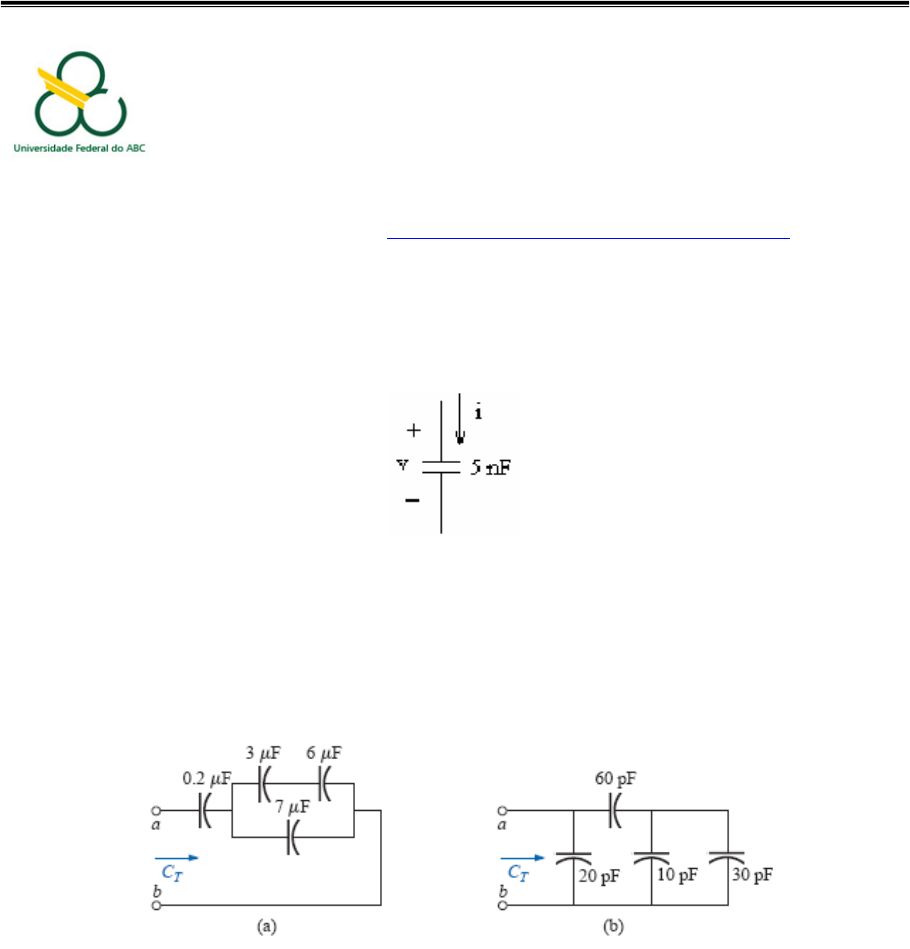 ESTO001-13 – Circuitos Elétricos e Fotônica Lista 3 1 Circuitos Elétricos e Fotônica – Lista 3 – Exercícios Capacitor e Circuito RC Indutor e Circuito RL Sempre que possível, confira seus resultados, utilizando o programa de simulação de circuitos LTSpice (software livre disponível em : http://www.linear.com/designtools/software/) 1. No capacitor da Figura 1, determine a tensão v(t) sabendo-se que i = -5e-2t [μA,s] e v(0) = 100V. Figura 1 Re: v(t) = 500e-2t- 400 [V,s] 2. Determine as capacitâncias equivalentes CT dos circuitos representados na Figura 2. Figura 2 Re: a) CT=0,1956µF; b) CT=44pF 3. Determine a tensão v(t) para t>0 nos terminais de uma associação série de um resistor de 10Ω com um capacitor de 10 mF. Sabe-se que a tensão no capacitor em t=0 é -25 V e a corrente que atravessa o conjunto é dada por: i(t)= 5e-10t (A). Re: v(t) = 25 [V] 4. Para o circuito da Figura 3, pede-se: a) Determine R, C e a energia inicial (em t=0), sabendo-se que v(t) = 8e-5t (V) e i(t) =20e-5t (μA); ESTO001-13 – Circuitos Elétricos e Fotônica Lista 3 2 b) Calcule a percentagem da energia inicial que é dissipada no resistor para t >100 ms. R i + - v C Figura 3 Re: a)R=400kΩ;C=0,5μF;w=16μJ; b) %w =36,79% 5. Determine a indutância da bobina representada na Figura 4, considerando: a) Núcleo de ar b) Núcleo de material ferromagnético com µr=2000. Figura 4 Re: a) L=0,170mH; b) L=0,339H 6. Reduzir os circuitos da Figura 5 para o número mínimo de elementos. a) b) Figura 5 Re: a) indutor de 0,01H em série com um capacitor de 18μ F; b) indutor de 25mH em série com um capacitor de 18μ F 7. Em um circuito RL série livre, com R e L variáveis, determine: a) a tensão no indutor v(t), para t>0, sabendo-se que R=200 Ω, L=40 mH e i(0) = 10 mA. núcleo 300 espiras ESTO001-13 – Circuitos Elétricos e Fotônica Lista 3 3 b) o valor de L, para o caso de R = 10 kΩ e τ =10 μs. c) o valor de R, para que a corrente num indutor de 0,01 H se reduza à metade a cada 100 μs. Re: a) vL(t)= -2.e-5000t [V,s]; b) L=0,1H; c) R=69,315Ω 8. Um circuito RL série contém um indutor de 1 H. Determine o valor de R para que a energia armazenada no indutor se reduza à metade a cada 10 ms. Re: R=34,657 Ω 9. Determine os valores de V1 e I1 no circuito da Figura 6, conectado há muito tempo ao gerador de tensão DC. Figura 6 Re: I1=2A;V1=12V 10. O circuito da Figura 7 encontra-se em regime permanente em t=0-. Calcule i(t) e v(t) para t >0. 5 A 12 Ω 4 Ω 2 H 4 Ω + - v i t=0 Figura 7 Re: i(t)=2,5.e-3,5t [A,s]; v(t)= -7,5.e-3,5t [V,s] 11. Para o circuito da Figura 8, a chave estava fechada há muito tempo, e abre em t=0. Determine: a) os valores da tensão no capacitor v (t), para t=0 e para t→∞ b) a constante de tempo do circuito, para t ≥ 0 c) a expressão da tensão v(t), para t ≥ 0 ESTO001-13 – Circuitos Elétricos e Fotônica Lista 3 4 Figura 8 Re: a) v(0)=200V; v(∞)=0; b) 20ms; v(t)=200e-50t [V,s] 12. Para o circuito da Figura 9, a chave estava fechada há muito tempo, e abre em t=0. Determine: a) O valor da tensão v(t) no instante t=0 b) O valor das energias armazenadas nos capacitores de 60mF e 20mF em t=0. c) O valor da constante de tempo do circuito RC livre para t > 0. d) A expressão de i(t) para t ≥ 0. Figura 9 Re:a) v(0)=3,6V; b) W60=0,389J; W20=0,130J; c) 0,4s; d) i(t)=-0,18e-2,5t [A,s] Exercícios extraídos e adaptados das seguintes referências: � Nilsson, J.W., Riedel, S. A. “Circuitos Elétricos”, 8ª Ed., Editora Pearson, 2009. � Hayt Jr , W.H., Kemmerly, J.E., Durbin, S.M., “Análise de Circuitos em Engenharia”, Ed. Mc Graw Hill, 7ª. Ed., 2008. � Boylestad, R. L., “Introdução à Análise de Circuitos”, Pearson Prentice-Hall, 10ª Ed., 2004. � Alexander, C.K.; Sadiku, M.N.O., “Fundamentos de Circuitos Elétricos”, Bookman, 3ª. Ed., 2008. � Dorf, R.C.; Svoboda, J.A., “Introduction to Electric Circuits”, Wiley, 7ª. Ed., 2006.