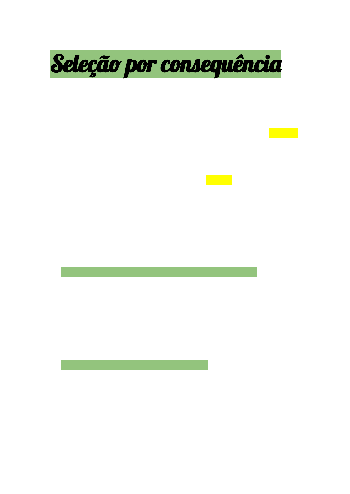 Seleçã� por consequênci� Bibliografia Básica: ➔ SAMPAIO, A. A. S.; ANDERY, M. A. P. A. Seleção por consequências como modelo de causalidade e a clínica analítico-comportamental. Em: BORGES, N. B.; CASSAS, F. A.Clínica analítico-comportamental: aspectos teóricos e práticos. Porto Alegre: ARTMED, 2012, p. 77-86. Bibliografia complementar: ➔ ANDERY, M. A.; MICHELETTO, N.; SÉRIO, T. M. Modo causal de seleção por consequências e a explicação do comportamento. Comportamento e Causalidade, 2006, p. 31-48. Disponível em: https://www.pucsp.br/sites/default/files/download/posgraduacao/pro gramas/psicologia-experimental/comportamento_causalidade_2009.p df “Na ciência teorias são o conjunto de leis e descrições sobre um dado fenômeno, os clínicos analíticos comportamentais baseiam sua intervenção na teoria conhecida como análise do comportamento.” ➔ O que é e para que serve um modelo de causalidade Modelos de causalidade compreendem as suposições destes cientistas/profissionais sobre: como os objetos de estudo são constituídos, suas causas e as relações entre esses objetos de estudo de interesse. Ou seja: definem como as causas e efeitos estão relacionados? Como as causas de determinados objetos de estudo devem ser procuradas? Assim é orientada a construção de conhecimento em uma teoria. ➔ Modelo de seleção por consequências:Este é o modelo de causalidade assumido pela análise do comportamento. (Skinner, 1981/2007). 1. Integra e dá sentido aos conceitos da Análise do Comportamento 2. Distingue a Análise do Comportamento de outros sistemas explicativos do comportamento humano 3. Define como analistas do comportamento estabelecem relações entre eventos e onde e como procuram as explicações para os problemas que têm que resolver. ➔ Processos de variação e seleção na análise do comportamento Explicações (do comportamento) baseadas em agentes iniciadores autônomos (uma vontade, desejo, força psíquica ou mente). Explicações teleológicas (do comportamento) que apelam para um propósito ou intenção como causas finais (Skinner 1981/2007). Construções históricas de inter-relações entre organismo e ambiente -> Causas -> Comportamento Variação: ocorre sem direção certa, nas respostas emitidas por um indivíduo e pela Seleção: de tal variação por consequência comportamentalmente relevante fundamentalmente/estímulos reforçadores -> pela aumentada recorrência de tais respostas e tais consequências. ATENÇÃO: esse modelo difere de modelos mecanicistas pois NÃO SUPÕE que eventos UNITÁRIOS temporalmente anteriores e imediatamente próximos causam outros eventos considerados seus efeitos necessários. na verdade, possuem múltiplas causas históricas e inter-relacionadas tratar as causas - tratar da constituição histórica do fenômeno e das mudanças de PROBABILIDADE do fenômeno de nosso interesse em relação a um universo de fenômenos possíveis. 1. Analisar unidades populacionais e históricas 2. Analisar a perspectiva da inter-relação entre diferentes causas que afetam a probabilidade de certos eventos (multideterminação). Pode o próprio comportamento ser uma inter-relação. Processo de origem e de mudanças dos padrões comportamentais no tempo e espaço na história. Operante: ação: ir para casa composto por todas as respostas que o produzem: ir a pé/ônibus/bicicleta ocorridas no passado/presente/futuro e que produz a mesma consequência. Para entender comportamento operante, entender: Como as respostas individuais variam? Como conjuntos de respostas são selecionados através do processo de reforçamento, o processo básico de seleção comportamental? ➔ Papel selecionador e instanciador do ambiente É necessário analisar instâncias ao longo do tempo e do espaço (respostas particulares) e identificar as consequências produzidas por essas instâncias. O operante é a interação que se constituiu no curso das interações, ocorre e continuará ocorrendo caso o ambiente selecionador não mude, pois foi selecionado pelas consequências que produziu. Selecionado como interação que envolve as ações do sujeito e suas consequências selecionadas mantenedoras. selecionador: consequências selecionam classes de respostas com certas características tornando-as mais prováveis. instanciador: evoca determinada classe de respostas através dos estímulos antecedentes ➔ Dois níveis da intervenção analítico-comportamental: seleção de comportamento e promoção da instanciação seleção de comportamento: O ambiente tem papel SELECIONADOR quando as consequências ambientais (estímulos reforçadores) tornam certas classes mais prováveis em certas circunstâncias na ocorrência de já haver um operante. promoção da instanciação: O ambiente tem papel INSTANCIADOR - quando um evento evoca determinado comportamento. ➔ A multideterminação do comportamento humano: os níveis filogenético, ontogenético e cultural MULTIDETERMINAÇÃO O comportamento humano é o conjunto de: ➔ filogenético: Contingências de sobrevivência responsáveis pela seleção natural das especie - características fisiológicas e anatômicas das espécies - relações comportamentais específicas (inatas) - a sensibilidade ao condicionamento respondente e operante que estão na base da capacidade de aprender novas relações comportamentais - Um repertório não comprometido com padrões inatos que poderiam ser modelados pelo condicionamento operante. ➔ ontogenético: Contingências de reforçamento responsáveis pelos repertórios adquiridos por seus membros incluindo - evolução de repertórios comportamentais específicos de cada indivíduo dos mais simples aos mais complexos. - permite a adaptação de indivíduos particulares em ambientes em constante mudança ➔ cultural: Contingências especiais antigas por um ambiente social evoluído. - comportamentos ensinados de indivíduo para outro e atra