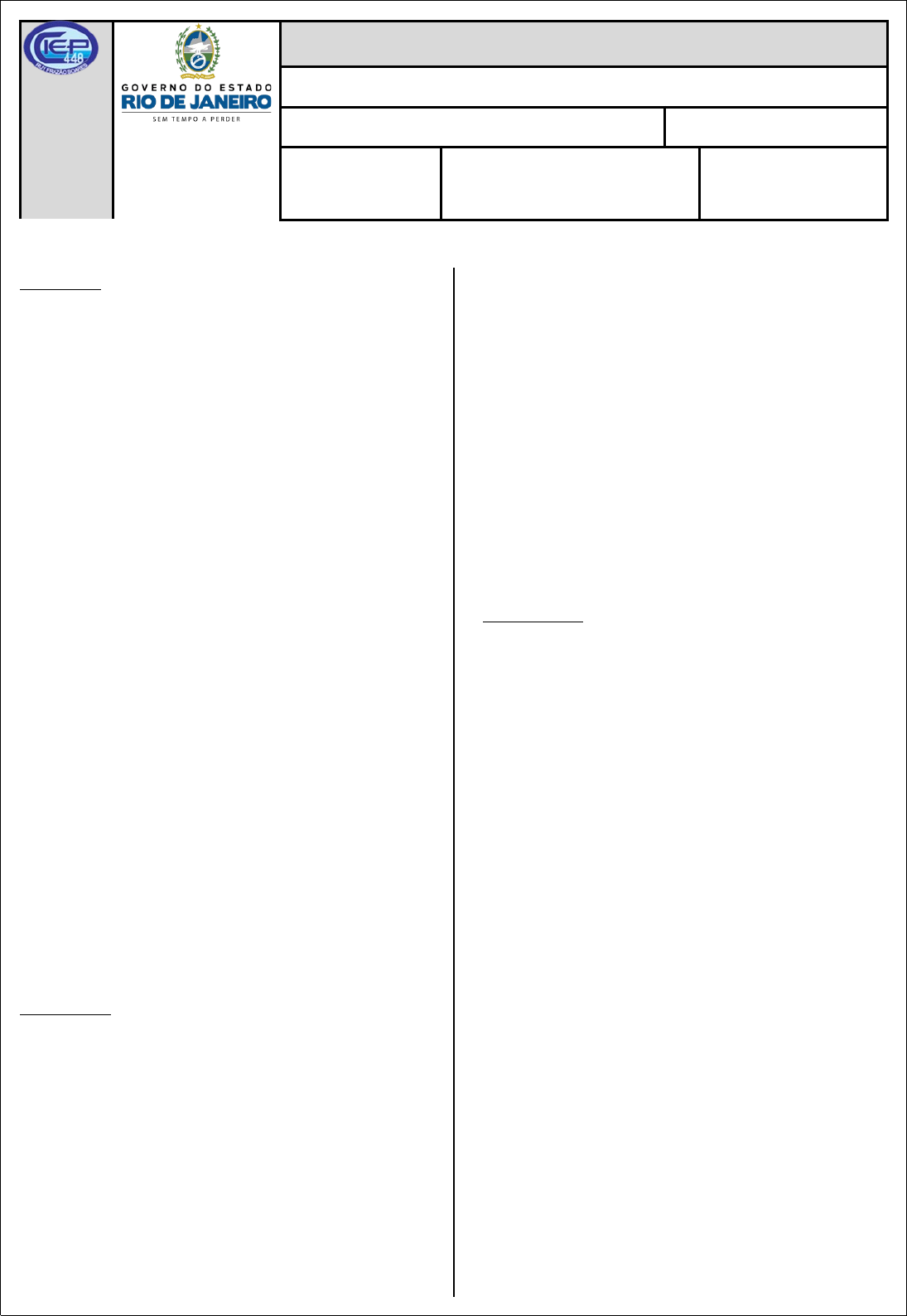 2023 CIEP 448 RUY FRAZÃO SOARES AVALIAÇÃO 1º BIMESTRE Nome: Disciplina: LÍNGUA PORTUGUESA Prof.: MARTA JANETE Turma: JÁ-701 Data:___/___ /___ VALE 5,0 PONTOS TEXTO I TÍMIDA DE 18 ANOS DÁ PRIMEIRO BEIJO E MORRE MINUTOS DEPOIS Jemma Benjamin, 18 anos, elegeu o colega de universidade Daniel Ross, de 21, para dar seu primeiro beijo na vida, marcando o início do namoro dos dois, porém, minutos depois do beijo, a jovem muito tímida morreu de forma fulminante no sofá da casa de Daniel, em Treforest, Inglaterra. A jovem, que praticava natação e era uma atleta exemplar do time de hóquei de uma excelente universidade, sofria de uma condição cardíaca rara – síndrome da morte súbita por arritmia. Daniel chamou socorro e tentou reanimar a namorada, mas não obteve sucesso. Os médicos disseram que ele nada podia fazer. O casal se conhecia há três meses e o primeiro beijo era muito aguardado. Jemma não tinha histórico de problemas cardíacos, segundo reportagem do “Daily Mail”. O caso aconteceu em 2009, mas os detalhes só foram revelados agora pelo inquérito que apurou a morte. (G1) Texto adaptado. 1. A expressão do texto abaixo que apresenta um FATO é: a) “excelente universidade” b) “muito tímida” c) “atleta exemplar” d) “cardíaca rara” TEXTO II O pai telefona para casa: – Alô? – ... Reconhece o silêncio da tipinha. Você liga? Quem fala é você. – Alô, fofinha. Nem um som. Criança não é para ser chamada fofinha. Cinco anos, já viu. – Oi, filha. Sabe que eu te amo? – Eu também. “Puxa, ela nunca disse que me amava”. – Também o quê? – Eu também amo eu. 2. Em qual dos trechos desse texto está expressa a opinião do narrador? a) “Reconhece o silêncio da tipinha.”. b) “Criança não é para ser chamada de fofinha.”. c) “– Oi filha. Sabe que eu te amo?”. d) “‘Puxa, ela nunca disse que me amava’”. 3. No trecho “Reconhece o silêncio da tipinha. Você liga? Quem fala é você.”, destaque o pronome de tratamento. VOCÊ TEXTO III ZAP Não faz muito que temos esta nova TV com controle remoto, mas devo dizer que se trata agora de um instrumento sem o qual eu não saberia viver. Passo os dias sentado na velha poltrona, mudando de um canal para outro – uma tarefa que antes exigia certa movimentação, mas que agora ficou muito fácil. Estou num canal, não gosto – zap, mudo para outro. Não gosto de novo – zap, mudo de novo. Eu gostaria de ganhar em dólar num mês o número de vezes que você troca de canal em uma hora, diz minha mãe. Trata-se de uma pretensão fantasiosa, mas pelo menos indica disposição para o humor, admirável nessa mulher. SCLIAR, Moacyr. 4. Nesse texto, o narrador emite uma opinião sobre o controle remoto no trecho: a) “Não faz muito que temos esta nova TV com controle remoto, ...”. b) “Passo os dias [...], mudando de um canal para outro...”. c) “... se trata agora de um instrumento sem o qual eu não saberia viver.”. d) “... uma tarefa que [...] agora ficou muito fácil.”. 5. Na frase “Minha mãe fazendo seus cálculos na ponta do lápis” temos dois pronomes possessivos. São eles: a) Cálculos e lápis b) Minha e mãe c) Minha e seus d) Fazendo e cálculos Leia a tirinha e responda: 6. Na tirinha, há uma expressão que é usualmente empregada no sentido figurado. Que expressão é essa? "Bateu as botas". 7. Qual é o sentido dessa expressão figurada? Significa falecer, morrer. 8. Qual fala do personagem com chapéu permite concluir que ele entendeu essa expressão antecipadamente de forma figurada? a) “E quando foi isso?” b) “Entendi...” c) “E ele estava doente?” d) “Risc! Risc!” 9. Qual o fato inesperado responsável pelo humor da tirinha? O fato de Armandinho se referir ao sentido literal: bater as botas para a retirada da areia. 10. Esse fato inesperado ocorrido na tirinha está no sentido literal ou figurado? Sentido literal. 11. Substitua as palavras destacadas pelos ANTÔNIMOS. a) Naquele dia, ela estava muito calma. ................................................................... b) Maria é a primeira da fila. ................................................................... 12. Complete corretamente as frases abaixo com uma das palavras que está nos parênteses. (0,5) a) O carro do meu pai está no _________________. (conserto / concerto) b) O ____________ da praça estava sujo. (assento / acento) Leia a tirinha e responda: 13. O humor da tirinha é construído a partir do momento que Armandinho deseja saber onde está o pai e o autor também se utiliza dessa mesma pergunta para mostrar que o pronome “você” não está no livro. Agora, organize os pronomes que aparecem na tirinha em singular e plural. a) Pronomes no singular. _____________________________________ b) Pronomes no plural. _____________________________________ 14. Relacione as frases em que é empregada a palavra remédio a seus significados, escrevendo nos parênteses a letra adequada. (A) medicamento (B) solução para um problema (C) alívio, consolo para o sofrimento (D) emenda, correção ( ) Depois de tudo o que aconteceu, o único remédio é a separação. ( ) Fui à farmácia comprar remédio para a gripe. ( )Esse menino não tem remédio, continua insubordinado. ( ) A fé é o melhor remédio para as nossas aflições. TEXTO I TÍMIDA DE 18 ANOS DÁ PRIMEIRO BEIJO E MORRE MINUTOS DEPOIS Jemma Benjamin, 18 anos, elegeu o colega de universidade Daniel Ross, de 21, para dar seu primeiro beijo na vida, marcando o início do namoro dos dois, porém, minutos depois do beijo, a jovem muito tími da morreu de forma fulminante no sofá da casa de Daniel, em Treforest, Inglaterra. A jovem, que praticava natação e era uma atleta exemplar do time de hóquei de uma excelente universidade, sofria de uma condição cardíaca rara – síndrome da morte súbita por arritmia. Daniel chamou socorro e tentou reanimar a namorada, mas não obteve sucesso. Os m