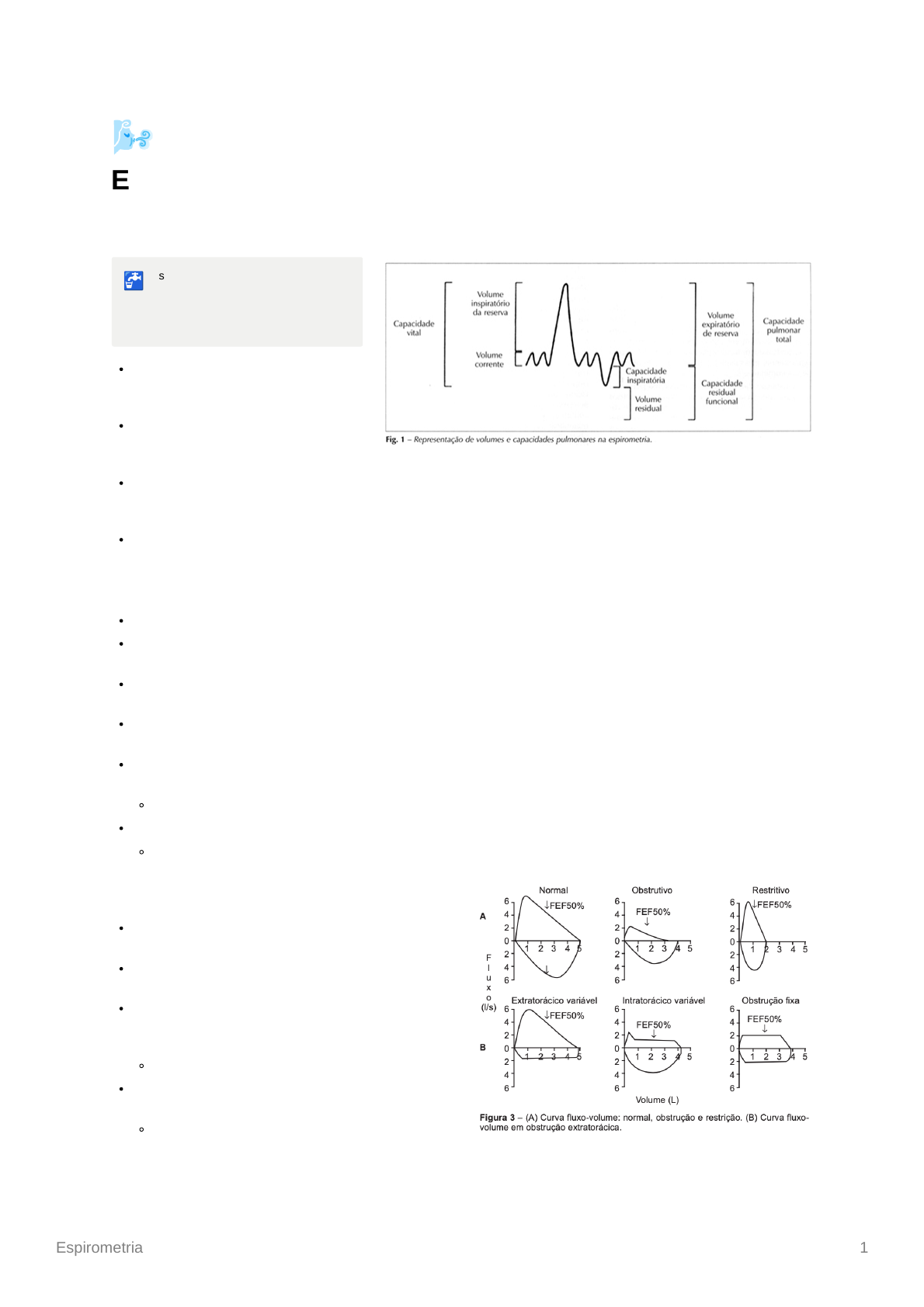 Espirometria 1 🌬 Espirometria Definições 🚰 As grandezas funcionais são expressas em litros nas condições de temperatura corporal, pressão ambiente e saturado de vapor de água; Volume corrente (VC): volume expirado ou inspirado durante cada movimento respiratório, em repouso. Volume residual (VR): volume de ar que permanece no pulmão após uma expiração máxima; Capacidade pulmonar total (CPT): o volume de gás nos pulmões após a inspiração máxima; Capacidade residual funcional (CRF): é o volume de ar que permanece nos pulmões ao final de uma expiração usual, em volume corrente; Capacidade vital (CV): representa o maior volume de ar mobilizado, podendo ser medido tanto na inspiração quanto na expiração; Capacidade vital forçada (CVF): representa o volume máximo de ar exalado com esforço máximo, a partir do ponto de máxima inspiração; Volume expiratório forçado no tempo (VEFt): representa o volume de ar exalado num tempo especificado durante a manobra de CVF; Fluxo expiratório forçado máximo (FEFmáx): representa o fluxo máximo de ar durante a manobra de capacidade vital forçada. Esta. grandeza também é denominada de pico de fluxo expiratório (PFE); Fluxo expiratório forçado médio (FEFx-y%): representa o fluxo expiratório forçado médio de um segmento obtido durante a manobra de CVF. Exemplo: FEF25-75% é o fluxo expiratório forçado médio na faixa intermediária de CVF, isto é, entre 25 e 75% de curva de CVF. Capacidade inspiratória (CI): volume máximo que pode ser inspirado a partir do final de uma expiração normal. CI - VRI + VC Técnica A espirometria permite medir o volume de ar inspirado e expirado e os fluxos respiratórios; A capacidade pulmonar total e o volume residual não podem ser medidos por espirometria; O volume expiratório forçado no primeiro segundo (VEF1) é a quantidadede ar eliminada no primeiro segundo da manobra expiratória forçada; É a medida de função pulmonar mais útil clinicamente. Os resultados espirométricos devem ser expressos em gráficos de volume-tempo e fluxo-volume. A curva fluxo-volume mostra que o fluxo é máximo logo no início da expiração, próximo à CPT, havendo redução dos fluxos à medida que o volume pulmonar se aproxima do VR; Espirometria 2 Os fluxos no início da expiração, próximos ao pico de fluxo expiratório, representam a porção esforço-dependente da curva, porque podem ser aumentados com maior esforço por parte do paciente; A curva de fluxo-volume é uma análise gráfica do fluxo gerado durante a manobra de CVF desenhado contra a mudança de volume. O fluxo é registrado em L/s e o volume em L. A curva fluxo-volume define um limite o fluxo, portanto, é altamente reprodutível num dado indivíduo. O fluxo máximo é muito sensível na maioria das doenças comuns que afeta o pulmão. 📉 Um esforço inicial submáximo será claramente demonstrado na curva fluxo-volume, mas será bem menos evidente na curva volume-tempo. Já a detecção de um fluxo constante próximo ou igual a zero no final da curva expiratória forçada será facilmente perceptível na curva de volume-tempo e será menos evidente na curva fluxo-volume. A CVF é medida solicitando-se ao indivíduo que depois de inspirar até a CPT expire tão rápida e intensamente quanto possível num espirômetro de volume ou de fluxo; O VEFt pode ser medido introduzindo-se mecanismos de mensuração de tempo na manobra da CVF em intervalos escolhidos. Normalmente isto é feito registrando-se a CVF num gráfico de papel que se move numa velocidade fixa. Preparo para o Teste Paciente não deve usar broncodilatador por um período mínimo de quatro horas antes da realização do exame; Paciente deve evitar consumo de café, chá, álcool e cigarros antes do exame; Contraindicações Relativas Estas condições devem ser julgadas individualmente pelo médico responsável pela condução do exame: Hemoptise de causa desconhecida; Pneumotórax; Instabilidade cardiocirculatória; Infarto do miocárdio recente; Tromboembolismo pulmonar; Aneurismas cerebral, torácico ou abdominal; Cirurgia ocular recente; Náuseas ou vômitos; Cirurgia torácica ou abdominal recentes; Qualquer outra situação que limite a adequada técnica do exame. Critérios de Aceitação do Teste O teste é aceito se a manobra da CVF for realizada adequadamente, com no mínimo três curvas aceitáveis e duas reprodutíveis; Os dois maiores valores do VEF1 e da cvf devem diferir menos de 150 mL; A duração da expiração deve ser no mínimo de 6 segundos. 📊 Valores de Referência: a escolha e análise dos valores de referência depende de vários fatores: sexo, altura, peso, idade e raça. Indicações Diagnóstico: Quando a espirometria é analisada em conjunto com os dados clínicos e radiológicos, pode confirmar a hipótese de doença obstrutiva, restritiva ou mista; A espirometria é capaz de detectar precocemente o surgimento de doenças pulmonares antes de manifestações clínicas ou alterações radiológicas; Quantificação do distúrbio : A espirometria é a única maneira de fazer a medida objetiva das anormalidades funcionais pulmonares. Espirometria 3 Investigação de sintomas: Dispnéia e tosse são indicações formais para a realização de testes funcionais pulmonares. Acompanhamento da evolução e avaliação da resposta terapêutica; Avaliação de incapacidade; Avaliação pré-operatória: A espirometria é necessária na avaliação pré-operatória de cirurgias torácicas e abdominais Interpretação Capacidade Vital Forçada (CVF) Está reduzida tipicamente nos distúrbios restritivos, mas também pode estar reduzida nos distúrbios obstrutivos (por exemplo, no enfisema, por redução da retração elástica pulmonar); Quando há redução da CVF e os fluxos estão normais, trata-se de doença restritiva; Volume Expiratório Forçado no Primeiro Segundo (VEF1) Reduzido em doenças obstrutivas de vias aéreas;