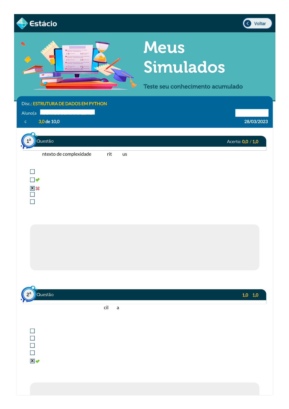 04/04/2023, 11:35 Estácio: Alunos https://simulado.estacio.br/alunos/ 1/5 Meus Simulados Teste seu conhecimento acumulado Disc.: ESTRUTURA DE DADOS EM PYTHON Aluno(a): RODRIGO SCHIAVO LEITE 202208477501 Acertos: 3,0 de 10,0 28/03/2023 Acerto: 0,0 / 1,0 No contexto de complexidade de algoritmos, usualmente é utilizada a notação O para representar as complexidades assintóticas analisadas. Dentre as a�rmações a seguir, a correta é: c -O(log n) signi�ca que para n=64 o algoritmo realizará 6 operações no pior caso. O(n2) signi�ca que as operações variam em proporção quadrática à entrada. O(n) signi�ca que para n=50 o algoritmo executará no máximo 50 operações. O(n) signi�ca que para n=50 o algoritmo realizará 50 operações no pior caso. O(n) signi�ca que as operações variam em proporção logarítmica à entrada. Respondido em 28/03/2023 13:18:41 Explicação: Com o uso da notação O, simpli�camos o número de operações, ignorando multiplicadores constantes do termo dominante e todos os termos de menor complexidade. Por exemplo, 5n2+3 é O(n2), mas n2 também é O(n2). Dessa forma, não é possível calcular exatamente o número de operações quando se usa a notação O. Apenas podemos fazer a�rmações sobre a proporcionalidade ao tamanho da entrada n. Assim, a resposta correta é que O(n2) é proporcional ao quadrado da entrada. Acerto: 1,0 / 1,0 O uso de funções recursivas pode facilitar a implementação de diversos algoritmos. Toda recursão depende de dois elementos: o caso base e o passo recursivo. Dentre as opções a seguir, a que apresenta um passo recursivo é: par(n)=par(n) f(n)=g(n-1) �b(n)=n-1 + n-2 fat(1)=1 fat(n)=n*fat(n-1) Respondido em 28/03/2023 12:51:58 Explicação: Questão1 a Questão2 a https://simulado.estacio.br/alunos/inicio.asp javascript:voltar(); 04/04/2023, 11:35 Estácio: Alunos https://simulado.estacio.br/alunos/ 2/5 O passo recursivo é o elemento que faz o cálculo da função recursiva mover-se em direção ao resultado. Deve envolver a chamada da própria função com um valor diferente de entrada. Isso só acontece na resposta correta: fat(n)=n*fat(n-1) , passo recursivo da função de cálculo de fatorial. fat(1)=1 é o caso base dessa mesma função. par(n)=par(n) é uma tautologia, e não uma recursão. As demais respostas são funções que não chamam a si mesmas, não podendo ser passos recursivos. Acerto: 1,0 / 1,0 Em Python é possível implementar um array utilizando o tipo padrão list. Essa implementação permite o uso das seguintes funções para inserir e remover um elemento, respectivamente: append, remove/pop. insert, remove/destroy. insert, delete/pop. impose, remove/destroy. append, pop/delete. Respondido em 28/03/2023 12:52:49 Explicação: Em Python a função append insere um elemento ao �nal da lista. As funções "remove" e "pop" podem remover um elemento, de maneiras diferentes. Remove tira um elemento conhecido usando o seu conteúdo, já pop remove um elemento usando seu índice, ou seja, a sua posição na lista. Acerto: 0,0 / 1,0 Uma lista L em alocação contígua está armazenada em memória no endereço 32. L possui elementos de 2 bytes cada e no momento contém [10, 20, 30, 40] . Os elementos 5 e 50 serão inseridos em sequência. Em que endereços eles serão inseridos, respectivamente, caso a lista não seja ordenada, e caso a lista seja ordenada? Não ordenada: 40, 42; ordenada: 32, 42. Não ordenada: 32, 34; ordenada: 32, 34. Não ordenada: 40, 42; ordenada: 40, 42. Não ordenada: 36, 37; ordenada: 32, 33. Não ordenada: 36, 37; ordenada: 32, 37. Respondido em 28/03/2023 13:18:34 Explicação: A inserção na lista não ordenada ocorre ao �nal da lista, o 5o elemento será inserido na posição L[4] ou seja endereço 32 + 4 * 2 = 40 . O elemento seguinte L[5] será inserido no endereço 32 + 5 * 2 = 42. Já no caso ordenado, o primeiro elemento deverá ser inserido na primeira posição L[0], endereço 32. Todos os demais elementos serão deslocados uma posição. O segundo elemento será inserido ao �nal da lista em L[4]. Ou seja, endereço 32 + 4 * 2 = 42 (levando em conta o deslocamento) . Solução é, portanto: 40,42, 32,42. Acerto: 0,0 / 1,0 Uma Pilha é uma estrutura de dados que permite o armazenamento de elementos (ou nós) sequencialmente. Sobre as Pilhas é possível a�rmar que: Questão3 a Questão4 a Questão5 a 04/04/2023, 11:35 Estácio: Alunos https://simulado.estacio.br/alunos/ 3/5 Permitem inserção ou remoção apenas no seu início ou no seu �nal. Permitem inserção no seu início e remoção apenas no seu �nal. Permitem inserção ou remoção apenas no seu início. Permitem inserção no seu �nal e remoção apenas no seu início. Permitem inserção ou remoção em qualquer de suas posições. Respondido em 28/03/2023 13:10:41 Explicação: A Pilha, assemelhando-se ao seu conceito na vida real, permite inserções e remoções apenas no seu início (push e pop). Dessa forma, implementa a política ¿First In, Last Out¿ (FILO) na qual o nó que chegou há menos tempo será sempre removido primeiro. As demais respostas indicam outras estruturas como listas, �las e deques. Acerto: 0,0 / 1,0 Suponha que você está implementando um programa que precisa armazenar dados ordenados em uma estrutura para serem tratados posteriormente, na ordem em que foram recebidos. Haverá uma grande quantidade de recebimentos e tratamento de dados, mas o tamanho esperado da estrutura não deve variar muito. Qual tipo de estrutura de dado é a melhor nessa situação? Lista em alocação contígua. Pilha. Lista simplesmente encadeada. Fila. Lista duplamente encadeada. Respondido em 28/03/2023 12:59:26 Explicação: A �la permite o tratamento de nós usando a política requerida, FIFO ¿ ¿�rst in �rst out¿ -. Além disso, as operações de inserção e remoção são O(1), ou seja, de complexidade constante, a melhor possível. Isso condiz com o r