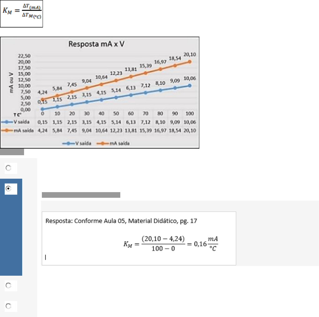 Questão 1/10 - Processos Químicos Industriais Determinar o ganho para o medidor de temperatura em função do gráfico abaixo, tendo seu zero ajustado para 4,24mA e com alcance de 100°C: Nota: 10.0 A 5,5 mA/°C B 0,16 mA/°C Você assinalou essa alternativa (B) Você acertou! C 16mA/°C D 0,055 mA/°C Questão 2/10 - Processos Químicos Industriais No processo siderúrgico o ferro e o carbono passam por uma preparação, a fim de otimizar o processo de refino para a fabricação do aço. O preparo do minério de ferro é a sinterização, gerando um produto intermediário denominado sínter. Já o carvão mineral segue para as coquerias e é posteriormente destilado para obtenção do coque e subprodutos. O processo subsequente é a redução, para remoção do oxigênio do minério de ferro, onde o minério de ferro se liquefaz e é chamado de ferro gusa ou ferro de primeira fusão. Onde ocorre este processo de redução? Nota: 10.0 A Forno de Conversão. B Forno Elétrico. C Alto-forno. Você assinalou essa alternativa (C) Você acertou! Conforme Material de Leitura do Capítulo 6, pg. 6: Isso acontece no alto forno, onde o minério de ferro se liquefaz e é chamado de ferro gusa ou ferro de primeira fusão. D Carro-torpedo. Questão 3/10 - Processos Químicos Industriais Na representação isométrica do processo químico industrial agroindustrial de extração do óleo de soja representado abaixo, a partir da descarga do caminhão temos quais operações unitárias? Nota: 10.0 A Peneiramento, descorticação, quebra, cozimento, laminação, extração, destilação, centrifugação. Você assinalou essa alternativa (A) Você acertou! Resposta: Conforme Aula 06, Material de Apoio, Apostila Aula 06, pág.14: A partir da descarga do caminhão, temos: peneiramento, descorticação, quebra, cozimento, laminação, extração, destilação, centrifugação. B Quebra, peneiramento, descorticação,cozimento, laminação, extração, destilação, centrifugação. C Descorticação, peneiramento, quebra, cozimento, laminação, extração, destilação, centrifugação. D Laminação, Peneiramento, descorticação, quebra, cozimento, extração, destilação, centrifugação. Questão 4/10 - Processos Químicos Industriais O termômetro à pressão de gás é de construção idêntica ao termômetro de dilatação de líquido em recipiente metálico. Possui um bulbo, um elemento de medição e um tubo capilar ligando ambos, porém, o espaço interno livre de fluido é preenchido com um gás a alta pressão. Conforme a temperatura varia, o gás expande ou contrai e o elemento de medição opera como um medidor de pressão. Assim, o seu princípio de funcionamento é: Nota: 10.0 A Quando o volume varia, a pressão varia linearmente com a temperatura. B Quando o volume é constante, a pressão varia linearmente com a temperatura. Você assinalou essa alternativa (B) Você acertou! Conforme Material de Leitura da Aula 5, página 7: Quando o volume é constante, a pressão varia linearmente com a temperatura. C Quando a pressão é constante, o volume não varia linearmente com a temperatura. D Quando a presão é constante, o volume varia linearmente com a temperatura. Questão 5/10 - Processos Químicos Industriais O instrumento de medida de pressão mais simples é o tubo em U, que consiste em um tubo de vidro contendo um líquido, denominado fluido manométrico (os mais usados são água e mercúrio), fixado a uma escala graduada. Quando se aplica uma pressão em uma das extremidades, o líquido é deslocado proporcionalmente a essa pressão aplicada. A outra extremidade do tubo é aberta, sofrendo a ação da pressão atmosférica. Analisando a figura apresentada abaixo, se observa que: Nota: 10.0 A o lado do balão desce mais, ou seja, sua extremidade se encontra abaixo da extremidade do lado aberto para a atmosfera, isso significa que a pressão no balão é maior que a pressão atmosférica, ou seja, é uma pressão relativa. Você assinalou essa alternativa (A) Você acertou! Resposta: Conforme Aula 05, Material Didático Institucional, pg.03 Se o lado do balão desce mais, ou seja, sua extremidade se encontra abaixo da extremidade do lado aberto para a atmosfera, isso significa que a pressão no balão é maior que a pressão atmosférica, ou seja, é uma pressão relativa. B o lado do balão desce mais, ou seja, sua extremidade se encontra abaixo da extremidade do lado aberto para a atmosfera, isso significa que a pressão no balão é maior que a pressão atmosférica, ou seja, é uma pressão negativa ou vácuo. C o lado da atmosfera desce mais, ou seja, sua extremidade se encontra abaixo da extremidade do lado aberto para o balão, isso significa que a pressão no balão é maior que a pressão atmosférica, ou seja, é uma pressão absoluta. D o lado da atmosfera desce mais, ou seja, sua extremidade se encontra abaixo da extremidade do lado aberto para o balão, isso significa que a pressão no balão é maior que a pressão atmosférica, ou seja, é uma pressão manométrica. Questão 6/10 - Processos Químicos Industriais A temperatura é a medida do grau de agitação das moléculas. Se um corpo mais quente é colocado em contato com um corpo mais frio, energia na forma de calor será transmitida espontaneamente no sentido do corpo mais quente para o mais frio, em respeito à Segunda Lei da Termodinâmica. Existem dois tipos de escalas de temperatura: Escalas relativas de temperatura: Celsius (°C) e Fahrenheit (°F). Escalas absolutas de temperatura: Kelvin (K) e Rankine (°R). Com relação aos sensores de temperatura, o mais utilizado, por ser preciso, barato e estável é: Nota: 10.0 A Termômetro a dilatação de líquido em bulbo de vidro B Termômetro a dilatação de líquido em recipiente metálico C Termômetro a pressão de gás D Termômetro a dilatação de sólidos ou termômetro bimetálico termopar Você assinalou essa alternativa (D) Você acertou! Resposta: 