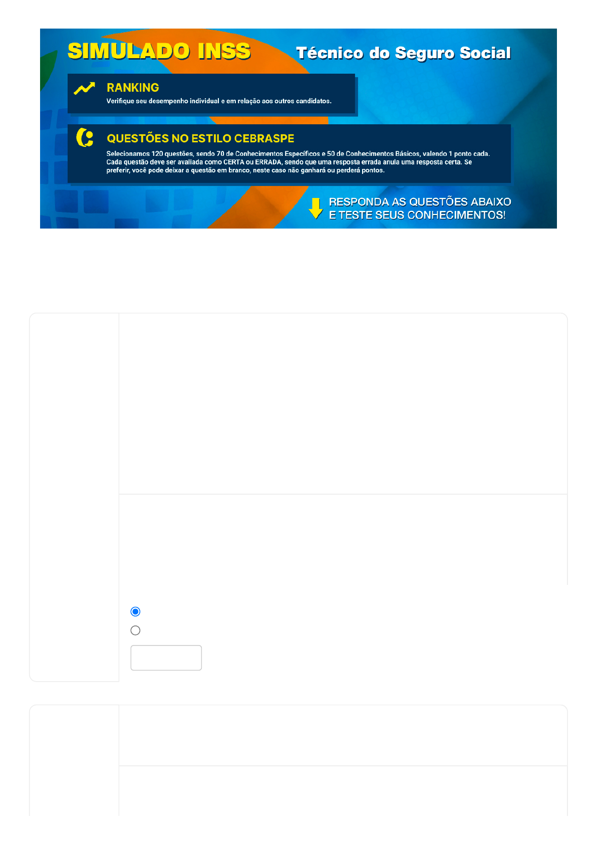 17/11/22, 22:52 Gabarito - Simulado - INSS CESPE https://www.aprovaconcursos.com.br/questoes-de-concurso/gabarito-simulado-inss-cespe 1/51 1073 candidatos no ranking (visualizar) (/questoes-de-concurso/gabarito-simulado-inss-cespe/ranking) 1) No que se refere aos agentes públicos e aos poderes administrativos, julgue os itens que se seguem. Nesse sentido, considere que a sigla CF, sempre que empregada, refere-se à Constituição Federal de 1988. Considere que um servidor vinculado à administração unicamente por cargo em comissão cometa uma infração para a qual a Lei n. 8.112/1990 preveja a sanção de suspensão. Nesse caso, se comprovadas a autoria e a materialidade da irregularidade, o servidor sofrerá a penalidade de destituição do cargo em comissão. o Certo Errado Em Branco 2) Julgue os itens a seguir, com relação aos princípios fundamentais da Constituição Federalde 1988 e à aplicabilidade de suas normas. A concessão de asilo político é princípio norteador das relações internacionais brasileiras, conforme expressa disposição do texto constitucional. https://www.aprovaconcursos.com.br/questoes-de-concurso/gabarito-simulado-inss-cespe/ranking 17/11/22, 22:52 Gabarito - Simulado - INSS CESPE https://www.aprovaconcursos.com.br/questoes-de-concurso/gabarito-simulado-inss-cespe 2/51 Certo Errado Em Branco 3) Julgue os itens que se seguem à luz das normas aplicáveis à seguridade social. O cancelamento da inscrição do cônjuge como beneficiário do regime geral de previdência social, na condição de dependente do segurado, pode ocorrer nos casos de divórcio se esse cônjuge tiver sido beneficiado com direito a alimentos e de anulação de casamento comprovada por certidão. Certo Errado Em Branco 4) Julgue os próximos itens, acerca de inexigibilidade de licitação e do leilão como modalidade licitatória. A contratação de serviços técnicos, de natureza singular, com profissionais ou empresas de notória especialização, insere–se entre as hipóteses de licitação dispensável. Certo Errado Em Branco 5) 17/11/22, 22:52 Gabarito - Simulado - INSS CESPE https://www.aprovaconcursos.com.br/questoes-de-concurso/gabarito-simulado-inss-cespe 3/51 Em relação às ideias e às estruturas linguísticas do texto I, julgue os itens que se seguem. No trecho “refere-se tão somente à liberdade de ir e vir" (L.6), o emprego do sinal indicativo de crase deve-se ao fato de a locução “tão somente" exigir complemento antecedido pela preposição a. Certo Errado Em Branco 6) Com base na jurisprudência do STF, julgue os itens a seguir, acerca da seguridade social. Apesar de a Emenda Constitucional n.º 20/1998 ter estabelecido um limite máximo para o valor dos benefícios do RGPS, esse teto não se aplica ao salário-maternidade da segurada empregada, devendo o valor do benefício, nesse caso, corresponder à 17/11/22, 22:52 Gabarito - Simulado - INSS CESPE https://www.aprovaconcursos.com.br/questoes-de-concurso/gabarito-simulado-inss-cespe 4/51 integralidade da remuneração da empregada, e cabendo à previdência social o seu pagamento, salvo no tocante à prorrogação por sessenta dias da licença-maternidade, cujo pagamento ficará a cargo do empregador. Certo Errado Em Branco 7) Com relação ao Código de Ética Profissional do servidor público civil do Poder Executivo federal, julgue o próximo item. As disposições desse código não se restringem à conduta do servidor público no âmbito do local de trabalho e às funções precipuamente exercidas. Nesse código, também constam, entre as vedações que compreende, as que dizem respeito a servidor embriagar- se fora do serviço habitualmente e a ligar seu nome a empreendimentos de cunho duvidoso. Certo Errado Em Branco 8) 17/11/22, 22:52 Gabarito - Simulado - INSS CESPE https://www.aprovaconcursos.com.br/questoes-de-concurso/gabarito-simulado-inss-cespe 5/51 Com base nessas informações, julgue os itens seguintes. A atitude adotada por Roberta ao lidar com documento oficial fere o CEP. Certo Errado Em Branco 9) Julgue os itens a seguir, acerca da Lei n.º 8.112/1990 e do Código de Ética Profissional do Servidor Público do Poder Executivo federal. 17/11/22, 22:52 Gabarito - Simulado - INSS CESPE https://www.aprovaconcursos.com.br/questoes-de-concurso/gabarito-simulado-inss-cespe 6/51 A pena aplicável ao servidor público pela comissão de ética é a de censura e sua fundamentação constará do respectivo parecer, assinado por todos os seus integrantes, com ciência do faltoso. Certo Errado Em Branco 10) A respeito dos benefícios e serviços do RGPS, julgue os próximos itens. O contribuinte individual que trabalhe por conta própria — sem vinculação a pessoa jurídica, portanto — e o segurado facultativo que optarem pelo regime simplificado de recolhimento — com arrecadação baseada na alíquota de 11% — não terão direito a aposentar-se por tempo de contribuição. Certo Errado Em Branco 11) Em relação aos benefícios de previdência social, julgue os itens que se seguem. O contribuinte individual que trabalha por conta própria, sem relação de emprego, não faz jus à aposentadoria por tempo de contribuição. Certo Errado Em Branco 17/11/22, 22:52 Gabarito - Simulado - INSS CESPE https://www.aprovaconcursos.com.br/questoes-de-concurso/gabarito-simulado-inss-cespe 7/51 12) Considerando a proposição “Se Paulo não foi ao banco, ele está sem dinheiro", julgue os itens a seguintes. Se as proposições “Paulo está sem dinheiro" e “Paulo foi ao banco" forem falsas, então a proposição considerada será verdadeira. Certo Errado Em Branco 13) O tempo de contribuição a Regime Próprio de Previdência Social (RPPS) será considerado na contagem das 18 (dezoito) contribuições necessárias para que o cônjuge ou dependente perceba o benefício de pensão por morte por prazo superior a 4 meses. Certo Errado Em Branco 14) Com base nas normas que regem a seguridade so