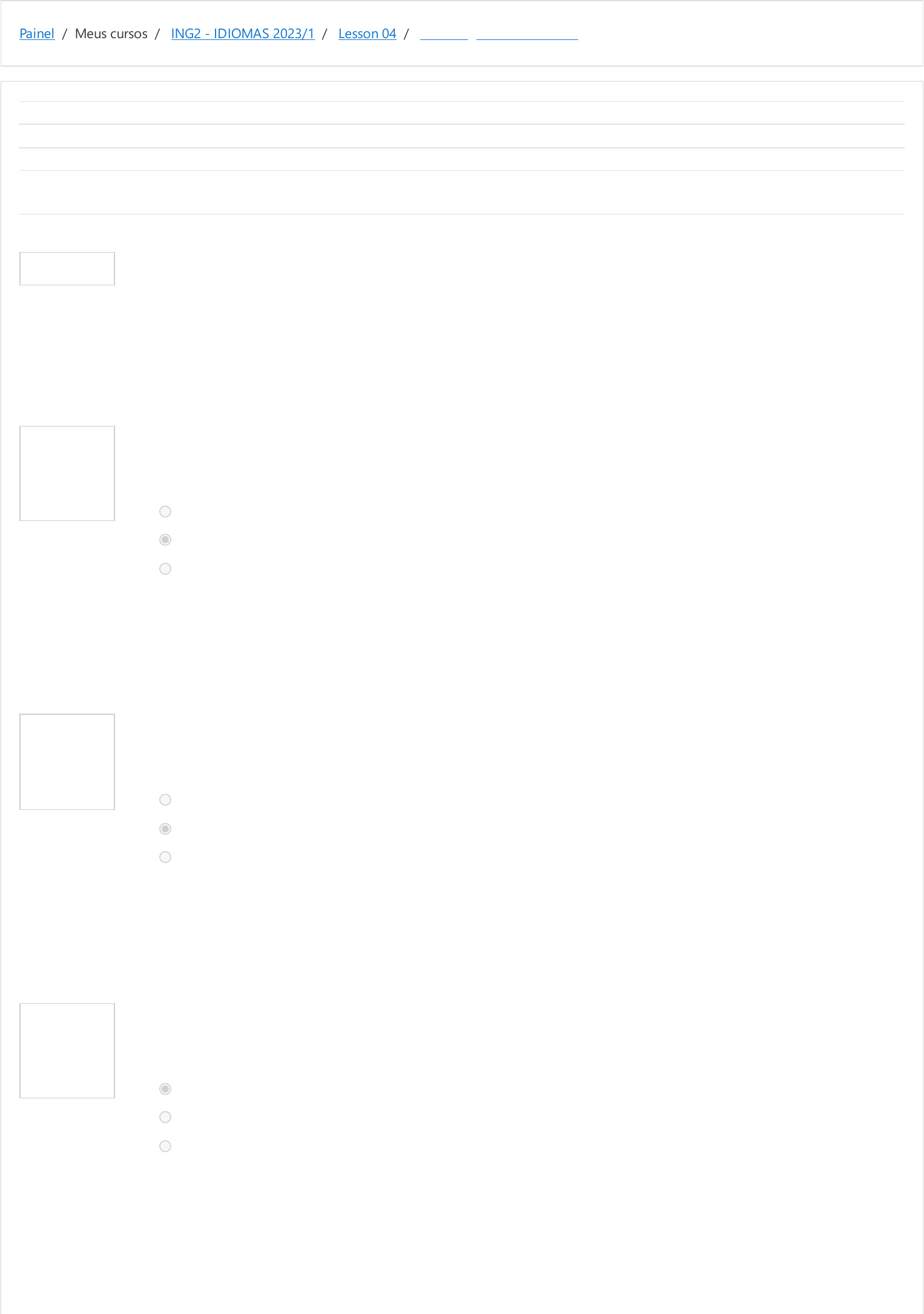 Painel / Meus cursos / ING2 - IDIOMAS 2023/1 / Lesson 04 / Choosing The Best Adverb Informação Questão 1 Correto Atingiu 1,00 de 1,00 Questão 2 Correto Atingiu 1,00 de 1,00 Questão 3 Correto Atingiu 1,00 de 1,00 Iniciado em quarta, 12 abr 2023, 21:24 Estado Finalizada Concluída em quarta, 12 abr 2023, 21:26 Tempo empregado 1 minuto 55 segundos Avaliar 10,00 de um máximo de 10,00(100%) You studied some adverbs which are used with the Present Perfect Simple, pointing out to specific situations. Read the sentences and choose the adverb that best fits each blank. I have ____________ wanted to parachute and one day I will. Escolha uma opção: yet always ever Sua resposta está correta. A resposta correta é: always Look at their faces! They have ____________ gone bungee jumping. Escolha uma opção: always just ever Sua resposta está correta. A resposta correta é: just Despite the fact that I want to do it, I have ____________ climbed a mountain. Escolha uma opção: never always yet Sua resposta está correta. A resposta correta é: never https://moodle.ifsul.edu.br/novohamburgo/my/ https://moodle.ifsul.edu.br/novohamburgo/course/view.php?id=337 https://moodle.ifsul.edu.br/novohamburgo/course/view.php?id=337#section-6 https://moodle.ifsul.edu.br/novohamburgo/mod/quiz/view.php?id=53576 Questão 4 Correto Atingiu 1,00 de 1,00 Questão 5 Correto Atingiu 1,00 de 1,00 Questão 6 Correto Atingiu 1,00 de 1,00 Questão 7 Correto Atingiu 1,00 de 1,00 I have ____________ gone skydiving. Escolha uma opção: yet ever already Sua resposta está correta. A resposta correta é: already Have you ____________ been to Vancouver? Escolha uma opção: yet just ever Sua resposta está correta. A resposta correta é: ever They haven’t chosen an extreme sport ____________. Escolha uma opção: ever yet never Sua resposta está correta. A resposta correta é: yet She has ____________ gone motocrossing twice. Escolha uma opção: yet never already Sua resposta está correta. A resposta correta é: already Questão 8 Correto Atingiu 1,00 de 1,00 Questão 9 Correto Atingiu 1,00 de 1,00 Questão 10 Correto Atingiu 1,00 de 1,00 He ____________ hasn’t decided if he wants to scuba dive. Escolha uma opção: still always ever Sua resposta está correta. A resposta correta é: still They have ____________ been through their first extreme sports experience. Escolha uma opção: just never yet Sua resposta está correta. A resposta correta é: just We have been rafting. However, we have ____________gone base jumping. Escolha uma opção: never always ever Sua resposta está correta. A resposta correta é: never ◄ Building Sentences with Present Perfect Seguir para... Answering Present Perfect Questions ► https://moodle.ifsul.edu.br/novohamburgo/mod/quiz/view.php?id=53575&forceview=1 https://moodle.ifsul.edu.br/novohamburgo/mod/quiz/view.php?id=53577&forceview=1