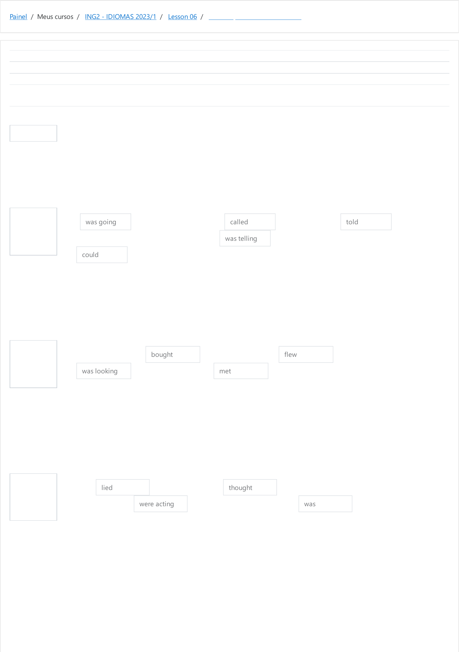 Painel / Meus cursos / ING2 - IDIOMAS 2023/1 / Lesson 06 / Past Simple VS Past Continuous Informação Questão 1 Correto Atingiu 2,50 de 2,50 Questão 2 Correto Atingiu 2,50 de 2,50 Questão 3 Correto Atingiu 2,50 de 2,50 Iniciado em sábado, 22 abr 2023, 18:38 Estado Finalizada Concluída em sábado, 22 abr 2023, 18:40 Tempo empregado 2 minutos 37 segundos Avaliar 10,00 de um máximo de 10,00(100%) In this lesson you studied and reviewed the use of Past Simple and Past Continuous. According to these verb tenses, complete the paragraphs with the verbs given in parentheses. Do not forget to pay attention to the words "while" and "when". I (to go) home when Sarah (to call) me and (to tell) me about my father for the first time. While she (to tell) me all those information I (can) not even say a word. was going called told was telling could Sua resposta está correta. A resposta correta é: I [was going] (to go) home when Sarah [called] (to call) me and [told] (to tell) me about my father for the first time. While she [was telling] (to tell) me all those information I [could] (can) not even say a word. After talking to Sarah I (to buy) a ticket and (to fly) to Canada. While I (to look) for my seat I (to meet) Bruno. We became friends. bought flew was looking met Sua resposta está correta. A resposta correta é: After talking to Sarah I [bought] (to buy) a ticket and [flew] (to fly) to Canada. While I [was looking] (to look) for my seat I [met] (to meet) Bruno. We became friends. Chuck (to lie) to me and I (to think) I was at my father's funeral. I should have noticed. They (to act) in a strange way while I (to be) there. lied thought were acting was Sua resposta está correta. A resposta correta é: Chuck [lied] (to lie) to me and I [thought] (to think) I was at my father's funeral. I should have noticed. They [were acting] (to act) in a strange way while I [was] (to be) there. https://moodle.ifsul.edu.br/novohamburgo/my/ https://moodle.ifsul.edu.br/novohamburgo/course/view.php?id=337 https://moodle.ifsul.edu.br/novohamburgo/course/view.php?id=337#section-8 https://moodle.ifsul.edu.br/novohamburgo/mod/quiz/view.php?id=53609 Questão 4 Correto Atingiu 2,50 de 2,50 Bruno studies at Vancouver University. Last week, he (to have) to present a paper and Carlton (to feel) curious about it. He (to talk) to Bruno and while they (to chat) it (to start) raining. had felt was talking were chatting started Sua resposta está correta. A resposta correta é: Bruno studies at Vancouver University. Last week, he [had] (to have) to present a paper and Carlton [felt] (to feel) curious about it. He [was talking] (to talk) to Bruno and while they [were chatting ] (to chat) it [started] (to start) raining. ◄ Use and Structure of Past Continuous Seguir para... Linking Present Perfect Sentences ► https://moodle.ifsul.edu.br/novohamburgo/mod/quiz/view.php?id=53608&forceview=1 https://moodle.ifsul.edu.br/novohamburgo/mod/quiz/view.php?id=53610&forceview=1