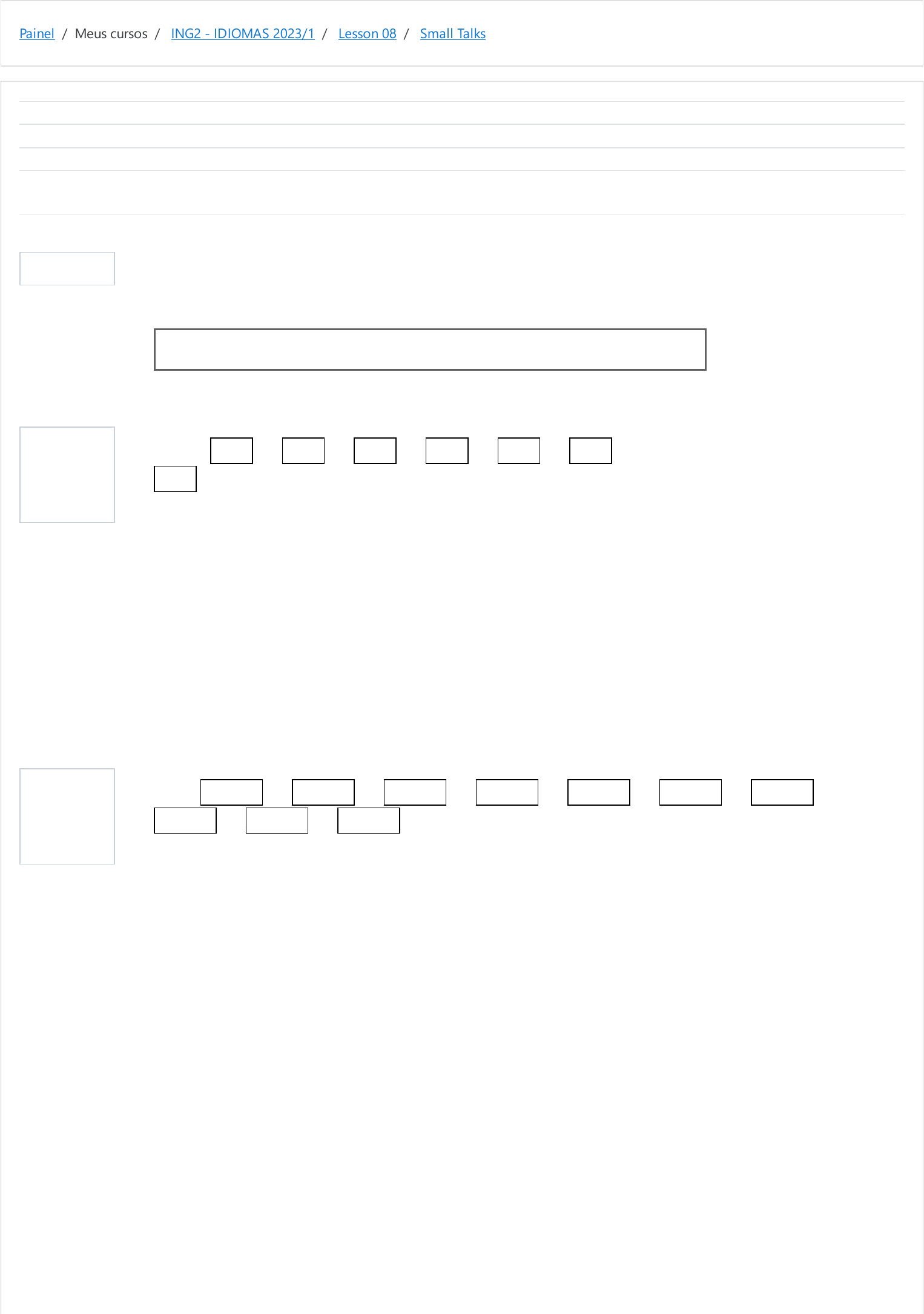 Painel / Meus cursos / ING2 - IDIOMAS 2023/1 / Lesson 08 / Small Talks Informação Questão 1 Correto Atingiu 1,11 de 1,11 Questão 2 Correto Atingiu 1,11 de 1,11 Iniciado em quarta, 10 mai 2023, 20:17 Estado Finalizada Concluída em quarta, 10 mai 2023, 20:21 Tempo empregado 4 minutos 27 segundos Avaliar 10,00 de um máximo de 10,00(100%) Put the words in the correct order to make questions. Then, complete the answers with can, can't, could or couldn't. Não consegue fazer o exercício no navegador do celular? Baixe o aplicativo do Moodle. Carlton: ? Bruno: Can you lend me your cellphone? Carlton: Sure! Sua resposta está correta. A resposta correta é: Carlton: [What] [can] [I] [do] [for] [you]? Bruno: Can you lend me your cellphone? Carlton: Sure! Bruno: ? Penny: No, I'm afraid you can't. Sua resposta está correta. A resposta correta é: Bruno: [Can] [I] [do] [anything] [for] [you] [Penny]? Penny: No, I'm afraid you can't. I doWhat you forcan anythingI Pennyyoufor doCan https://moodle.ifsul.edu.br/novohamburgo/my/ https://moodle.ifsul.edu.br/novohamburgo/course/view.php?id=337 https://moodle.ifsul.edu.br/novohamburgo/course/view.php?id=337#section-14 https://moodle.ifsul.edu.br/novohamburgo/mod/quiz/view.php?id=53650 Questão 3 Correto Atingiu 1,11 de 1,11 Questão 4 Correto Atingiu 1,11 de 1,11 Questão 5 Correto Atingiu 1,11 de 1,11 Questão 6 Correto Atingiu 1,11 de 1,11 Sarah: ? Amélie: Yes. How about you? Sarah: No, I couldn't. However, Mr. Tennant said I could do it this week. Sua resposta está correta. A resposta correta é: Sarah: [Could] [you] [take] [a] [day] [off] [last] [week]? Amélie: Yes. How about you? Sarah: No, I couldn't. However, Mr. Tennant said I could do it this week. Steve: ? Chuck: Because I couldn't leave the funeral home alone. Sua resposta está correta. A resposta correta é: Steve: [Why] [couldn't] [you] [meet] [me] [at] [7]? Chuck: Because I couldn't leave the funeral home alone. Steve: ? Chuck: You can go there at 9. Sua resposta está correta. A resposta correta é: Steve: [What] [time] [can] [I] [go] [there]? Chuck: You can go there at 9. Oxley: ? Sarah: You can leave it at the back of the diner. Sua resposta está correta. A resposta correta é: Oxley: [Where] [can] [I] [park] [my] [motorcycle]? Sarah: You can leave it at the back of the diner. off Could ayou week day last take you meet atme 7 couldn'tWhy can there I goWhat time my motorcycle Where can I park Questão 7 Correto Atingiu 1,11 de 1,11 Questão 8 Correto Atingiu 1,11 de 1,11 Questão 9 Correto Atingiu 1,12 de 1,12 Oxley: Good. ? Sarah: Yeah, I'll pour you a cup. Sua resposta está correta. A resposta correta é: Oxley: Good. [Can] [I] [have] [a] [coffee]? Sarah: Yeah, I'll pour you a cup. Regan: ? Chuck: Maybe on Friday night. Sua resposta está correta. A resposta correta é: Regan: [When] [could] [we] [go] [to] [the] [movies]? Chuck: Maybe on Friday night. Regan: ? Chuck: Sorry, I can't make it on Saturday. Sua resposta está correta. A resposta correta é: Regan: [Could] [it] [be] [on] [Saturday]? Chuck: Sorry, I can't make it on Saturday. ◄ Past, present and future abilities (apostila) Seguir para... What Do They Express? ► ICan have coffee a moviesthe When we togocould Could Saturday it be on https://moodle.ifsul.edu.br/novohamburgo/mod/resource/view.php?id=53648&forceview=1 https://moodle.ifsul.edu.br/novohamburgo/mod/quiz/view.php?id=53651&forceview=1