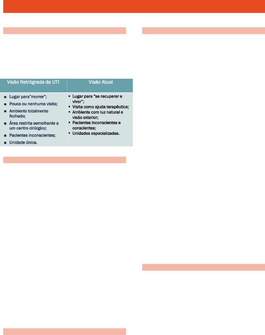 UTI - ESTRUTURA Objetivos das UTIs prestar atendimento à pacientes graves e de risco que exijam assistência médica e de enfermagem ininterruptas, além de equipamentos e recursos especializados Visão retrógrada e visão atual Exigências legais: Resolução ANVISA, RDC nº 50/2002, estabelece que a internação em UTI deve: proporcionar condições de internar pacientes críticos, em ambientes individuais ou coletivos, conforme grau de risco, faixa etária (exceto neonatologia), patologia e requisitos de privacidade; executar e registrar a assistência médica intensiva; executar e registrar a assistência de enfermagem intensiva; prestar apoio diagnóstico laboratorial, de imagens, hemoterápico, cirúrgico e terapêutico durante 24 horas; manter condições de monitoramento e assistência respiratória 24 horas; prestar assistência nutricional e distribuir alimentação aos pacientes; manter pacientes com morte cerebral, nas condições de permitir a retirada de órgãos para transplante, quando consentida; prestar informações e assistência aos acompanhantes dos pacientes Objetivos da RDC nº7/2010 Art. 2º Esta Resolução possui o objetivo de estabelecer padrões mínimos para o funcionamento das Unidades de Terapia Intensiva, visando à redução de riscos aos pacientes, visitantes, profissionais e meio ambiente. Pessoas/ Recursos Humanos segundo a RDC nº7/2010 Art.13 Deve ser formalmente designado um Responsável Técnico médico, um enfermeiro coordenador da equipe de enfermagem e um fisioterapeuta coordenador da equipe de fisioterapia, assim como seus respectivos substitutos. §1ºO Responsável Técnico deve ter título de especialista em Medicina Intensiva para responder por UTI Adulto; habilitação em Medicina Intensiva Pediátrica, para responder por UTI Pediátrica; título de especialista em Pediatria com área de atuação em Neonatologia, para responder por UTI Neonatal; §2º Os coordenadores de enfermagem e de fisioterapia devem ser especialistas em terapia intensiva ou em outra especialidade relacionada à assistência ao paciente grave, específica para a modalidade de atuação (adulto, pediátrica ou neonatal); §3º É permitido assumir responsabilidade técnica ou coordenação em, no máximo, 02 (duas) UTI. Art. 14 Além do disposto no Artigo13 desta RDC, deve ser designada uma equipe multiprofissional, legalmente habilitada, a qual deve ser dimensionada, quantitativa e qualitativamente, de acordo com o perfil assistencial, a demanda da unidade e legislação vigente, contendo, para atuação exclusiva na unidade no mínimo os III - Enfermeiros assistenciais: no mínimo 01 (um) para cada 08 (oito) leitos ou fração, em cada turno Revogado pela RDC nº 26 que retomou o padrão anterior de 1 enfermeiro para 10 pacientes V - Técnicos de enfermagem: no mínimo 01 (um) para cada 02 (dois) leitos em cada turno Estrutura (RDC 50/2002 e RDC 7/2010 Deve estar alicerçada: ✓ No perfil do paciente na instituição; ✓ Nas patologias para atendimento; ✓ Na admissão e encaminhamento de pacientes; ✓ No fluxo de visitantes e de funcionários; ✓ Na necessidade de instalações de área de apoio; ✓ Armazenamento de materiais e equipamentos, além de requisitos burocráticos Estrutura Física • Localização dentro do hospital: ✓ Próxima a elevadores; serviço de emergência; CC; sala de recuperação pós-anestésica; unidades intermediárias de terapia e serviço de laboratório e de imagem • Leitos: ✓ O número de leitos depende da população atendida no hospital; ✓ Deve ser destinado 10% da capacidade de leitos para a UTI; ✓ Número mínimo de leitos = 5 • A disposição dos leitos pode ser: ✓ Em área comum; ✓ Quartos fechados; ✓ Mista; ✓ Leitos para isolamento. • Cada leito de UTI deve conter: ✓ 11 tomadas de energia elétrica (110/220 volts); ✓ 1 saída de canalização à vácuo; ✓ 2 saídas de ar comprimido; ✓ 2 saídas de oxigênio • Leito para Isolamento: ✓ No mínimo 1 para cada 10 leitos. OBS: Deve possuir banheiro privativo e área específica para acondicionamento de roupa limpa e suja, além de lavatório. • Ruídos Internos: ✓ até 45dB durante o dia; ✓ Até 40dB durante a noite; ✓ Até 20dB durante a madrugada • Temperatura: ✓ Deve ficar entre 21ºC e 24ºC. OBS: deve-se manter a qualidade do ar proveniente do ar-condicionado • O Posto de Enfermagem deve: ✓ Ser centralizado; ✓ Ter no mínimo um para cada doze leitos; ✓ Possuir dimensões mínimas de 8m²; ✓ Área para preparo de medicação; ✓ Haver iluminação adequada; ✓ Instalação de água fria, lavabo, balcão, sistema de estocagem de medicamento, materiais e soluções • Um relógio de parede; Local para computadores e impressoras • Lavatórios: ✓ 1 lavatório para cada 5 leitos. ✓ Deve dispor de: - sabão; - antisséptico - papel toalha • Sala de Utensílios: ✓ Utensílios limpos: utilizada para armazenar suprimentos limpos e esterilizados; ✓ Utensílios sujos (ou expurgo): uma pia com bancada; torneiras misturadoras de água fria e quente; preparo do material • Banheiros; • Copa ✓ deve possuir: mesa, geladeira, pia e lixo para restos alimentares; • Sala de serviços gerais; • Área para equipamentos; • Laboratório; • Sala de reuniões; • Área de descanso dos funcionários; • Recepção • Sala de espera de visitantes • Corredor de transporte: ✓ Devem ser separados dos utilizados pelos visitantes • Prevenindo o stress do paciente: ✓ Iluminação natural e vista externa; ✓ Utilizar calendários, relógios e TV; • Conforto e privacidade do paciente: ✓ Utilizar persianas, cortinas, biombos e portas; ✓ Poltrona disponível à beira do leito Recursos Materiais • Central de monitorização do paciente • Itens que compõem o leito: Monitor cardíaco, oxímetro de pulso portátil, nebulização, termômetro, bomba de infusão... • Itens que compõem a UTI: ✓ Relógio